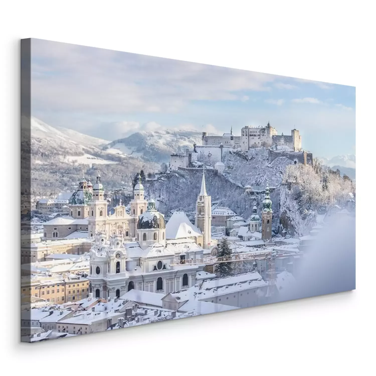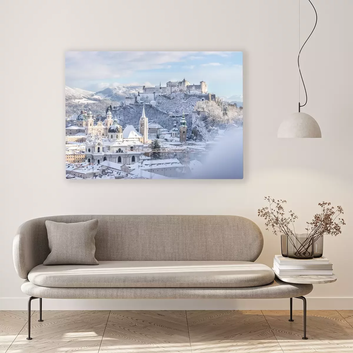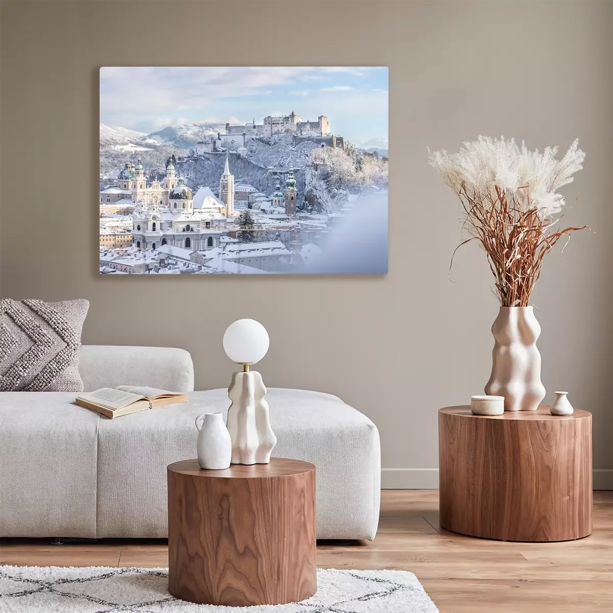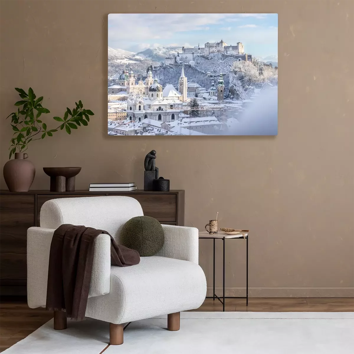 Tableau  Panorama de Salzbourg en hiver: centre historique enneigé, soleil