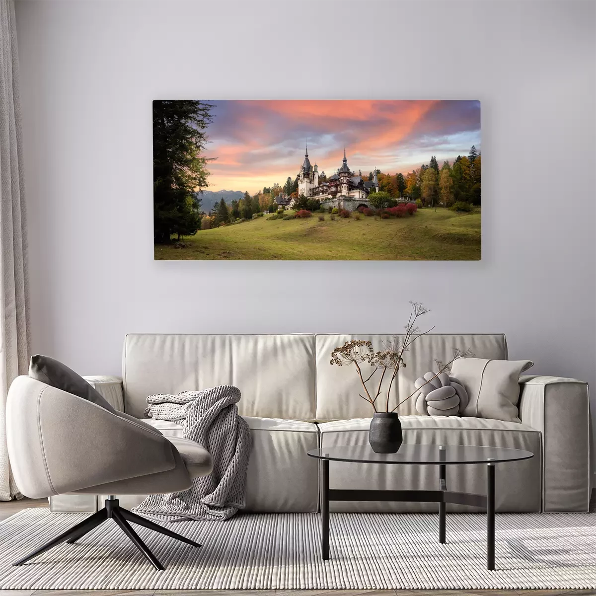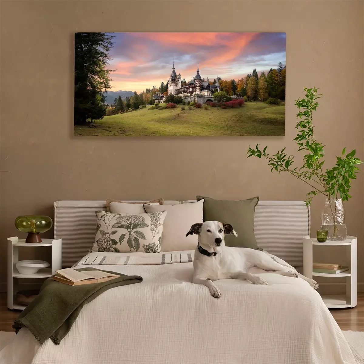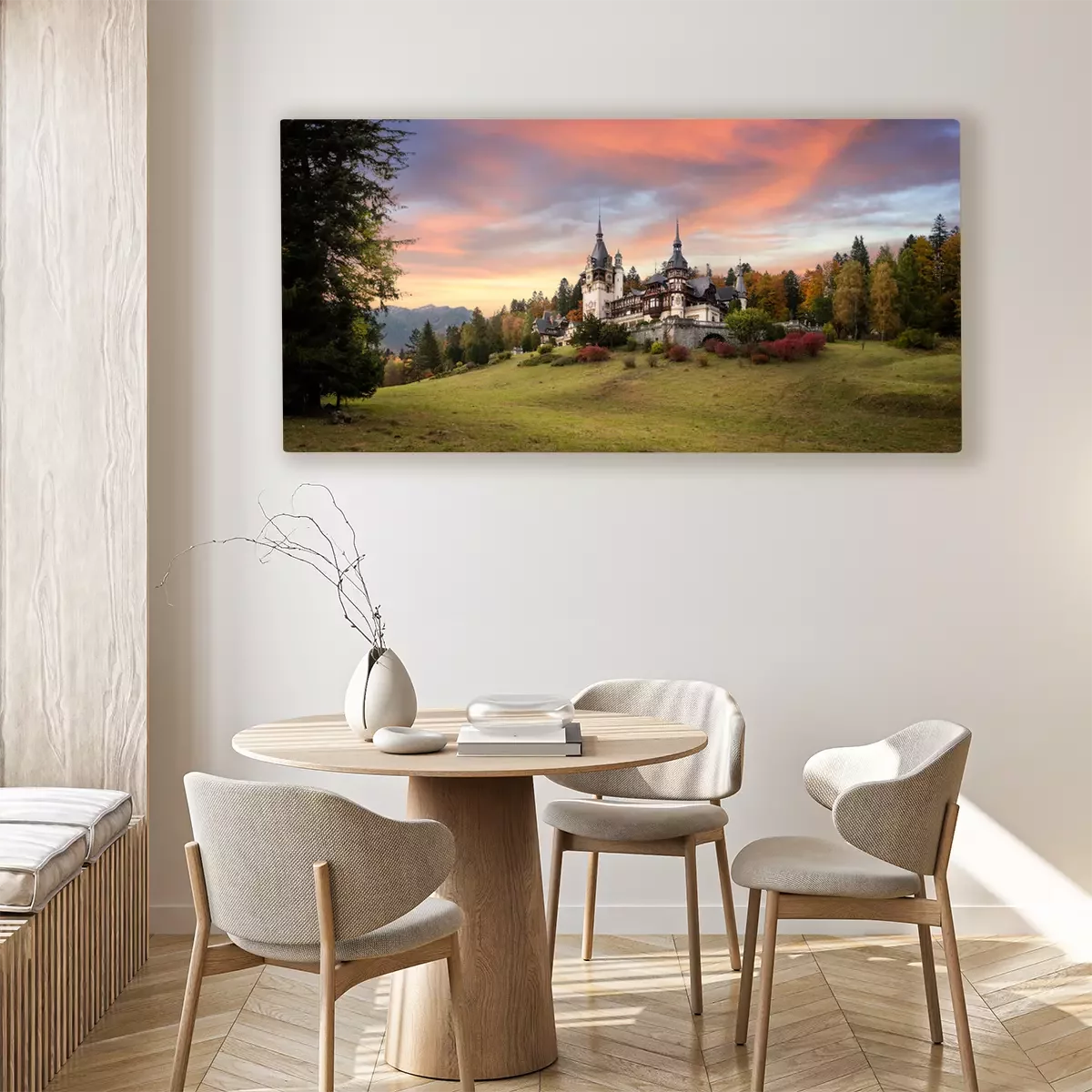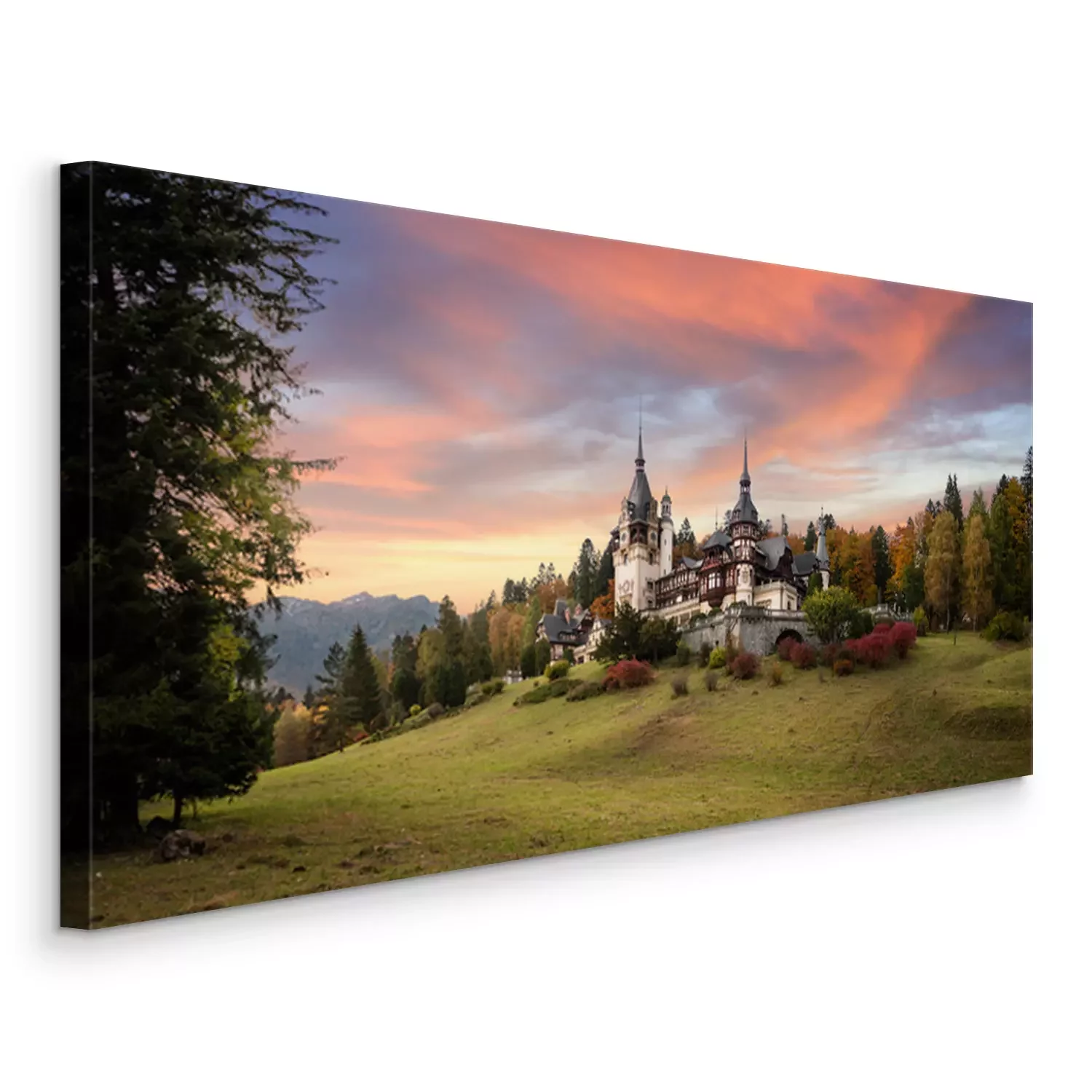 Tableau  Panorama of Peles Castle, Romania. Beautiful famous royal castle and ornamental garden in Sinaia landmark of Carpathian Mountains in Europe at sunset. Former Home Of The Romanian Royal Family.