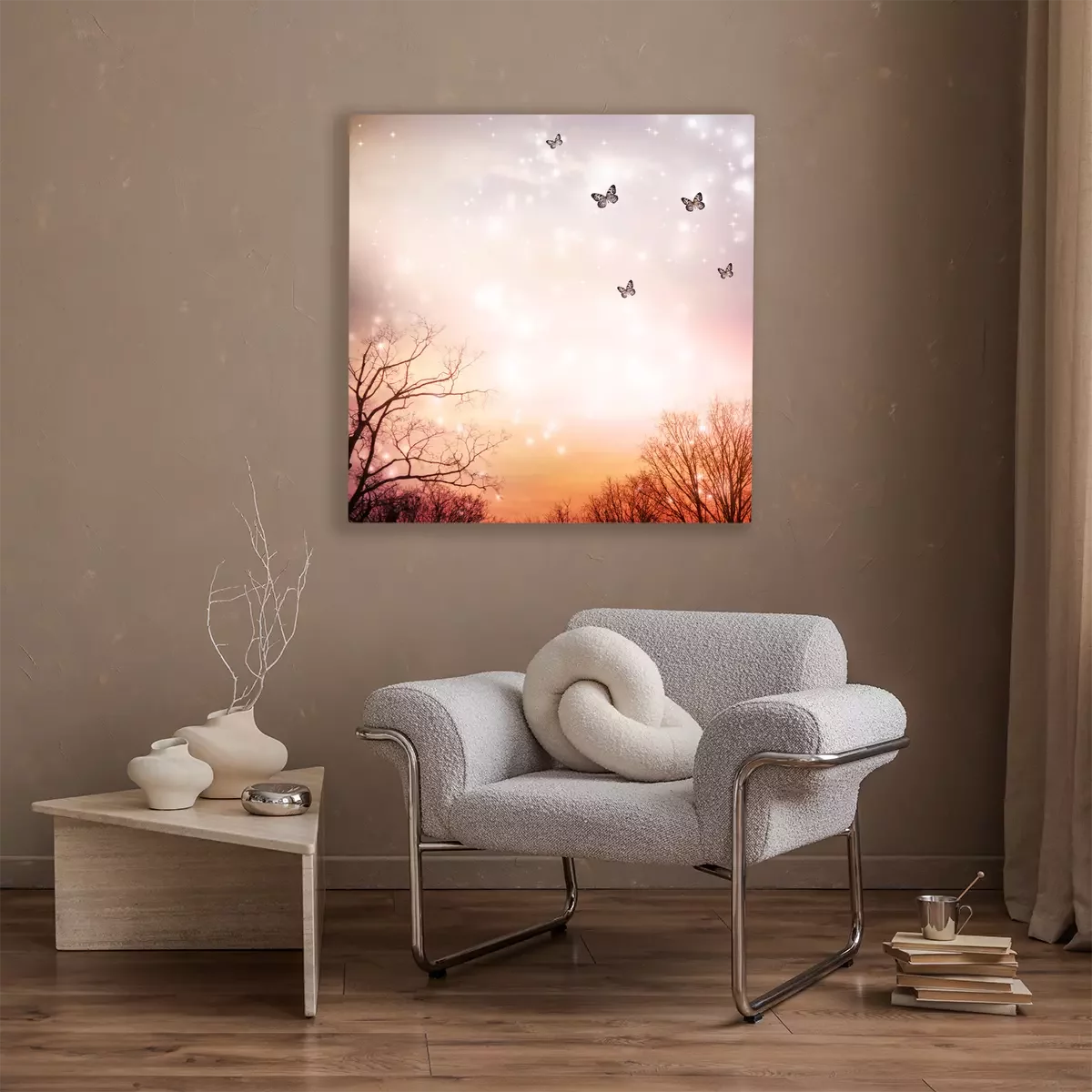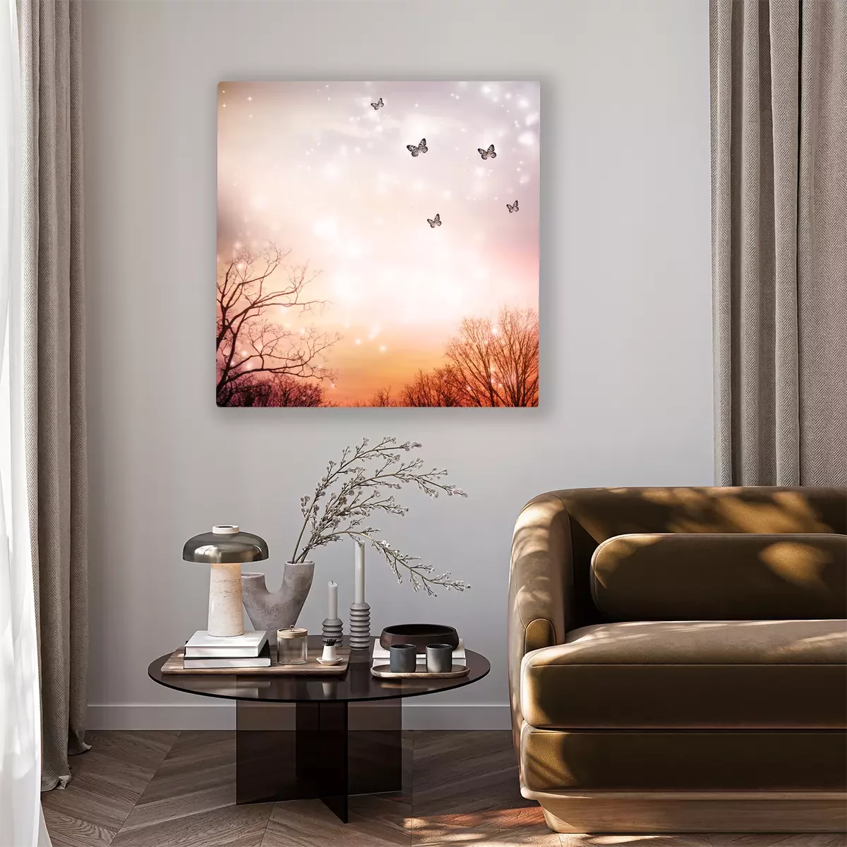 Tableau : Papillons sur des arbres sur fond rouge