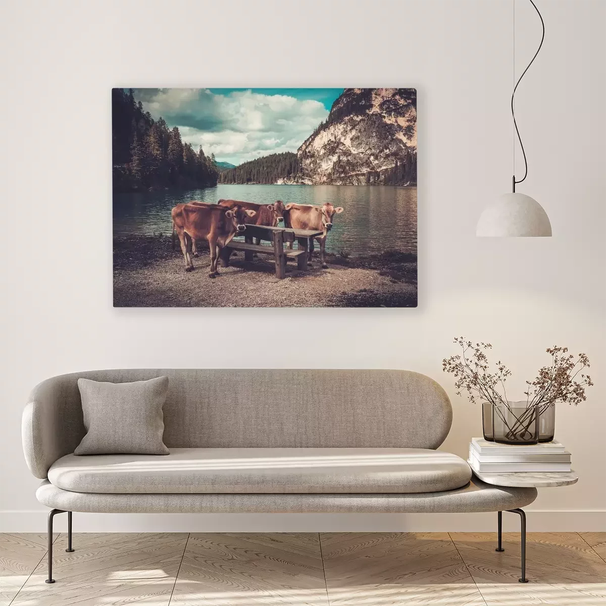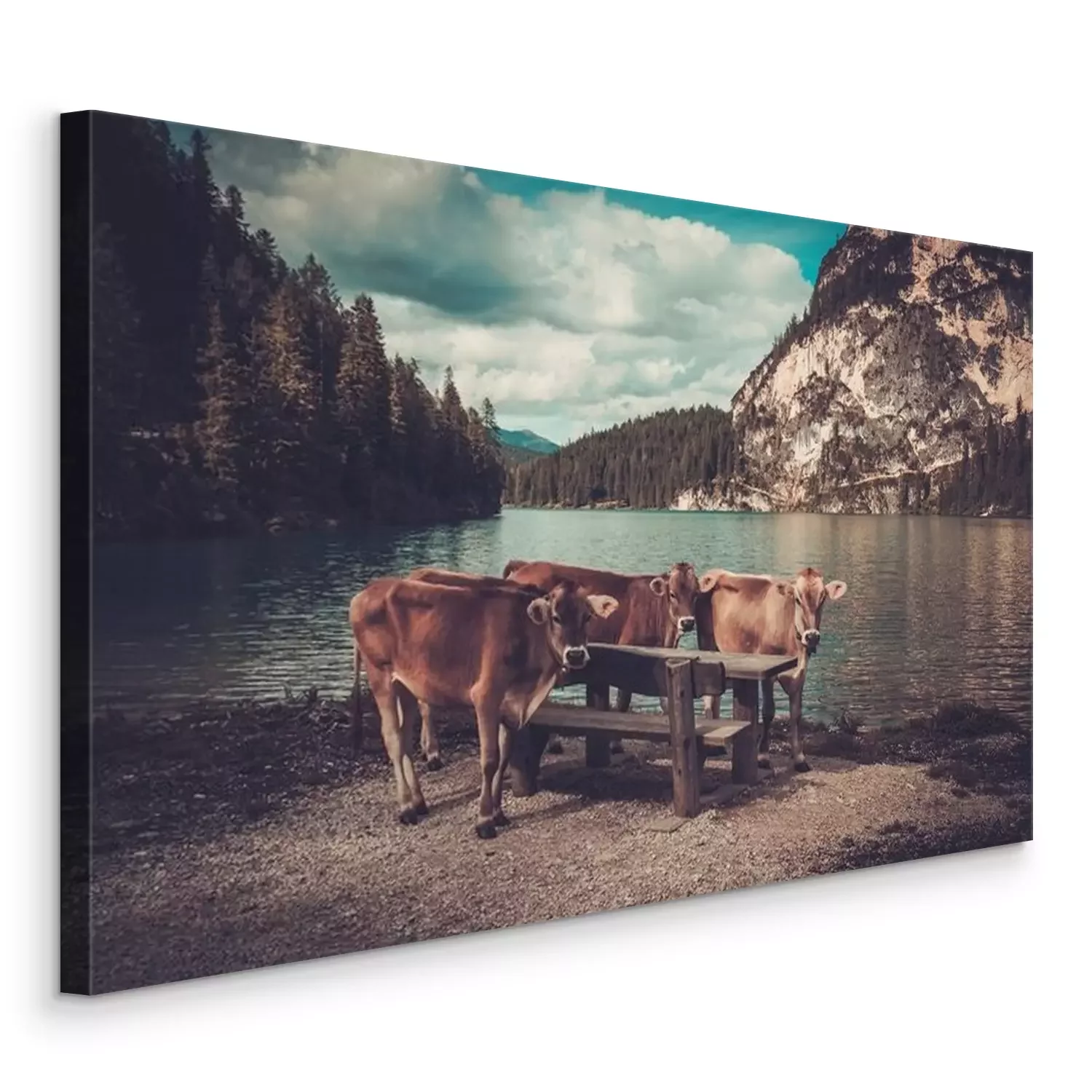 Tableau  Paysage avec des vaches avec un lac de montagne en arrière-plan