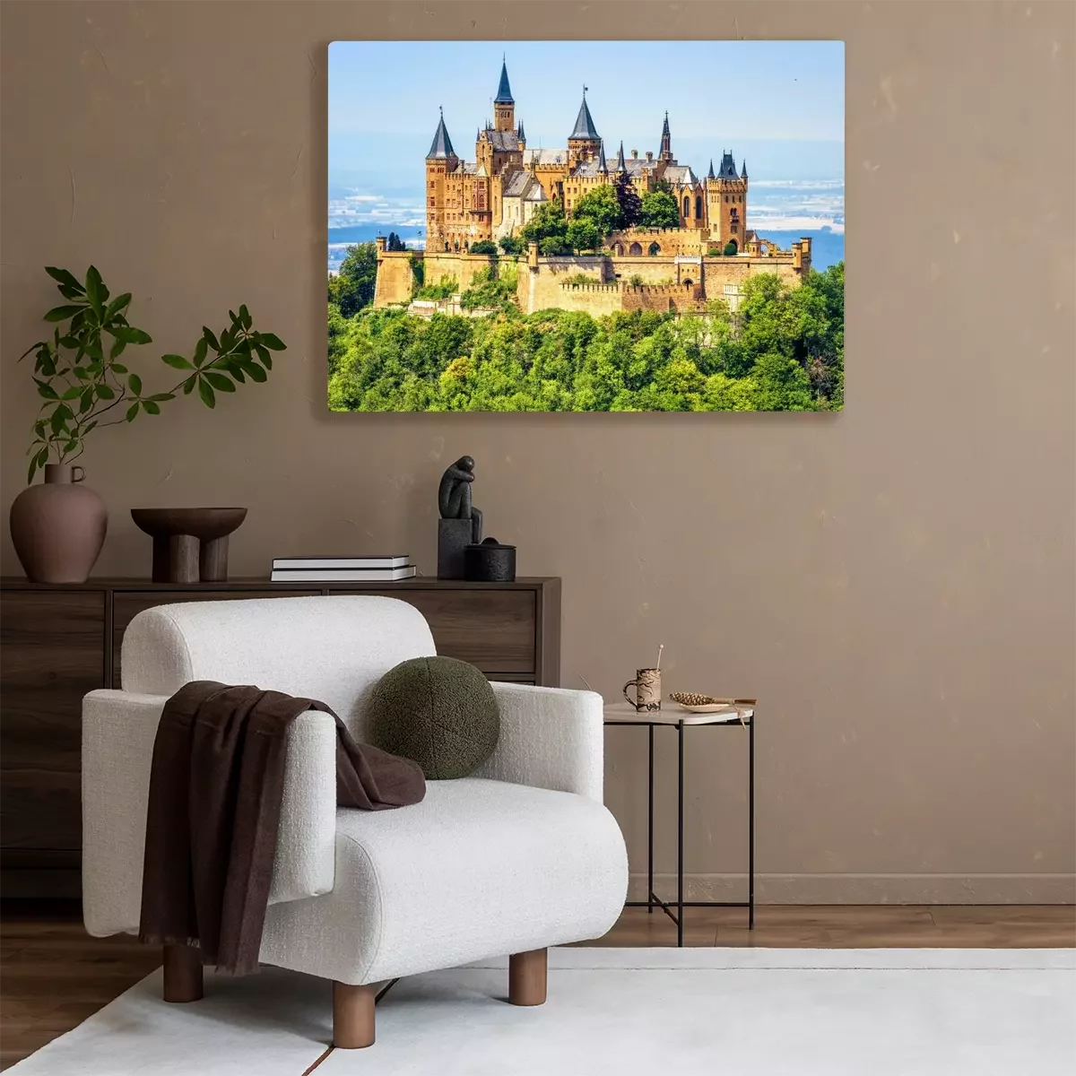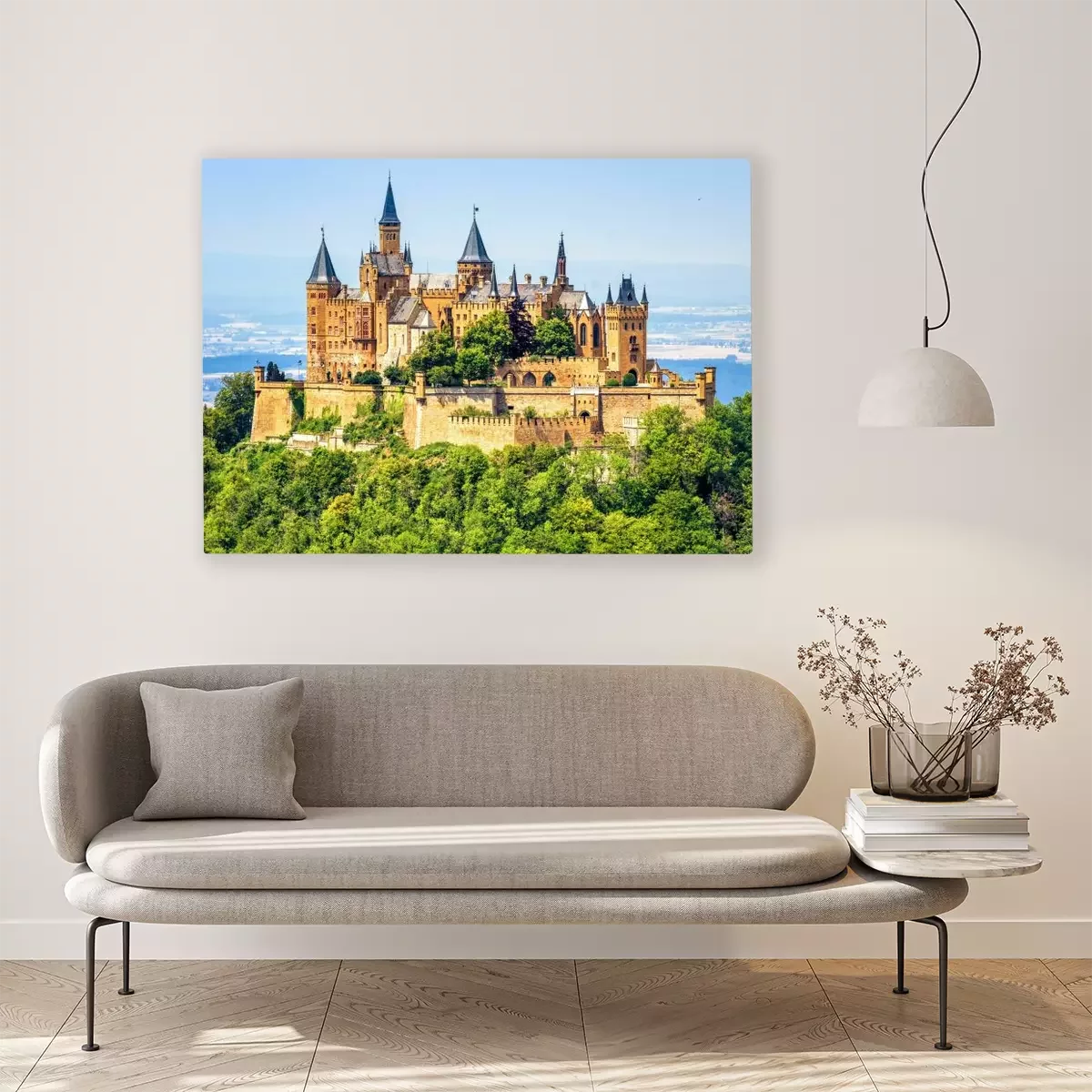 Hohenzollern Castle on mountain top, Germany. This castle is a famous landmark in vicinity of Stuttgart. Scenic view of Burg Hohenzollern in summer. Landscape of Swabian Alps with Gothic castle.