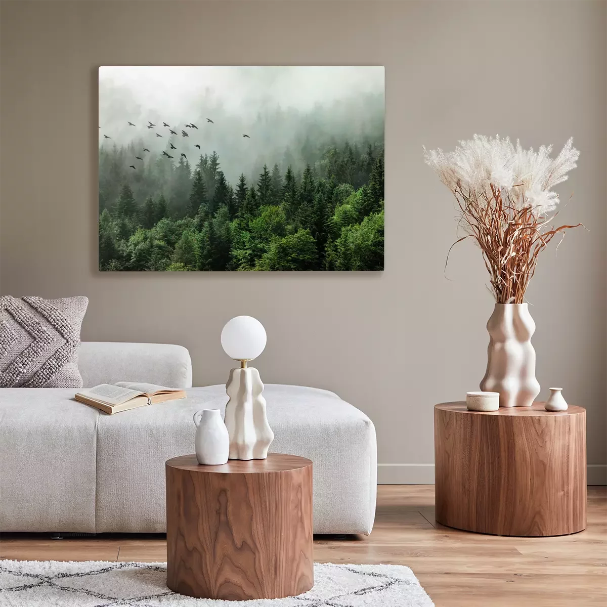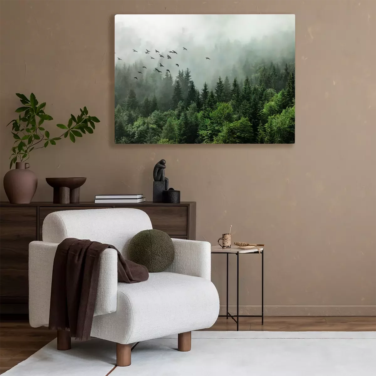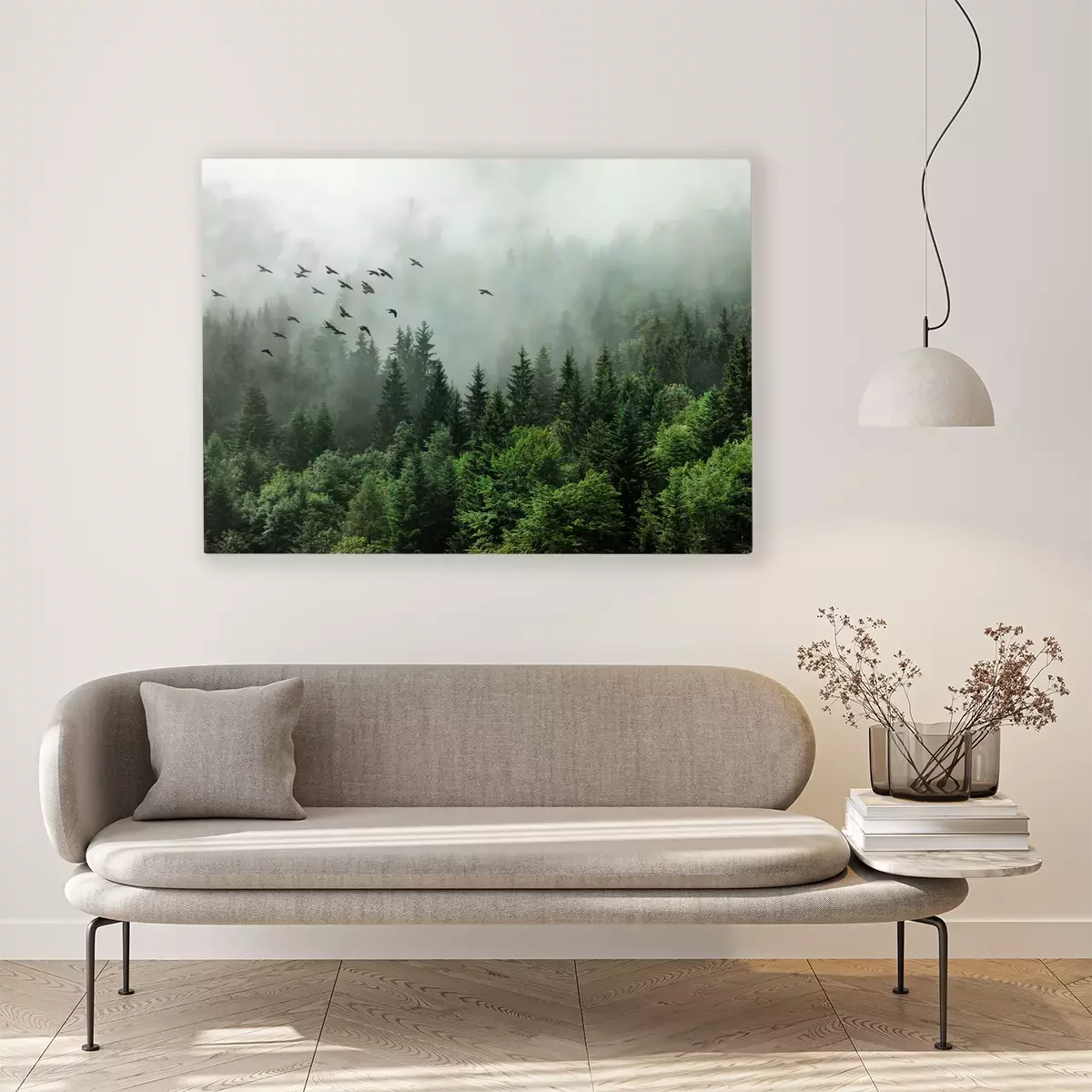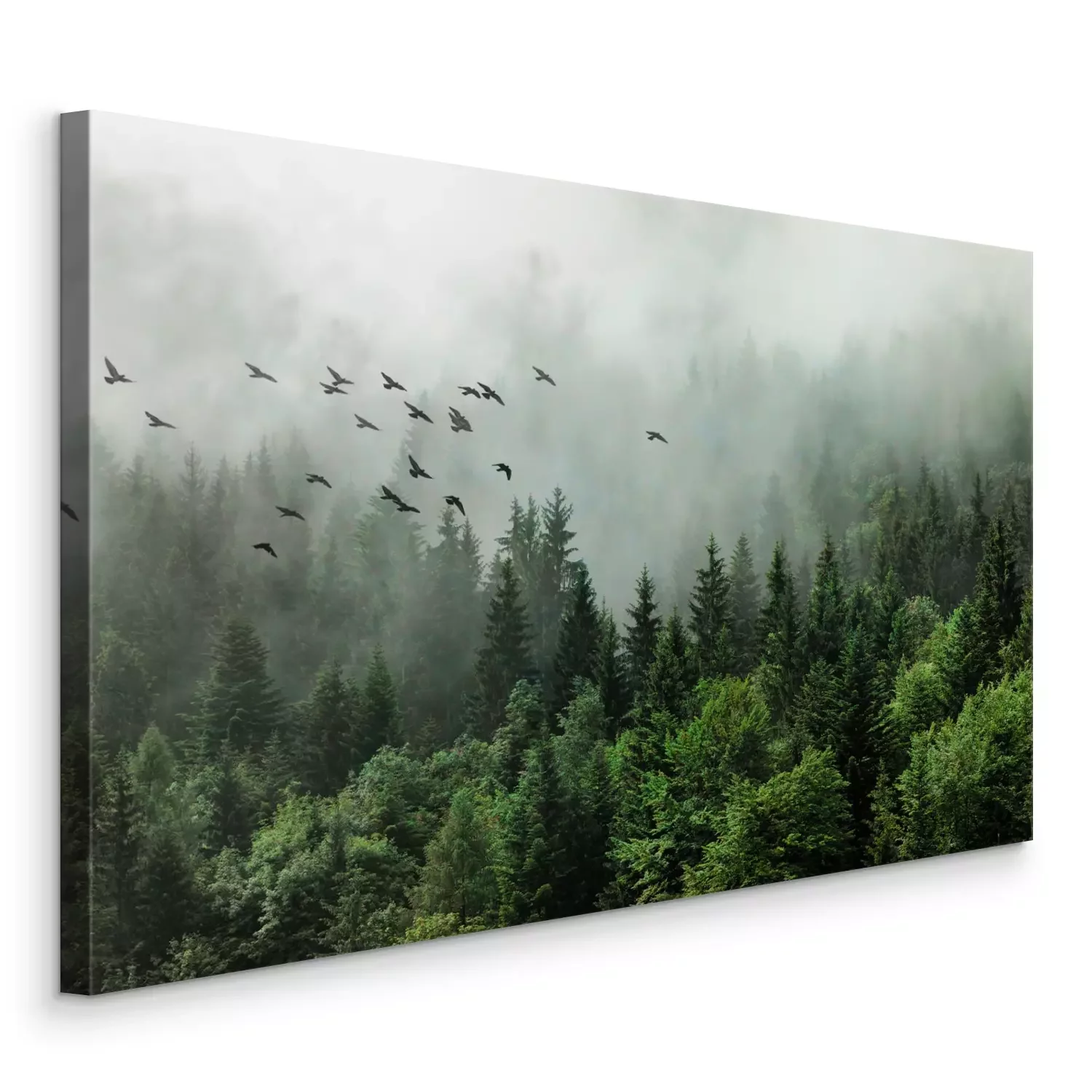Paysage brumeux de conifères avec des oiseaux sauvages