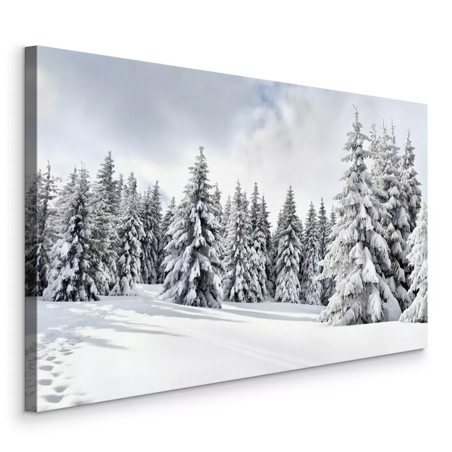 Tableau  Paysage d'hiver de montagnes avec chemin d'accès avec empreintes de pas dans la neige, dans la forêt de sapins et la clairière. Montagnes carpates