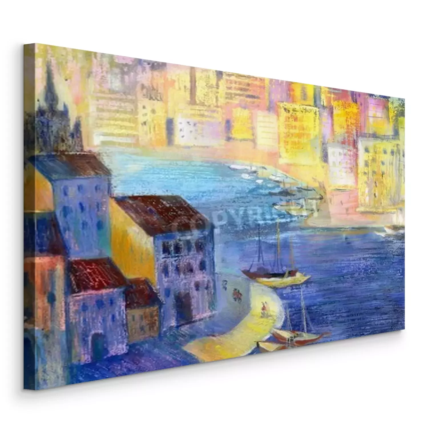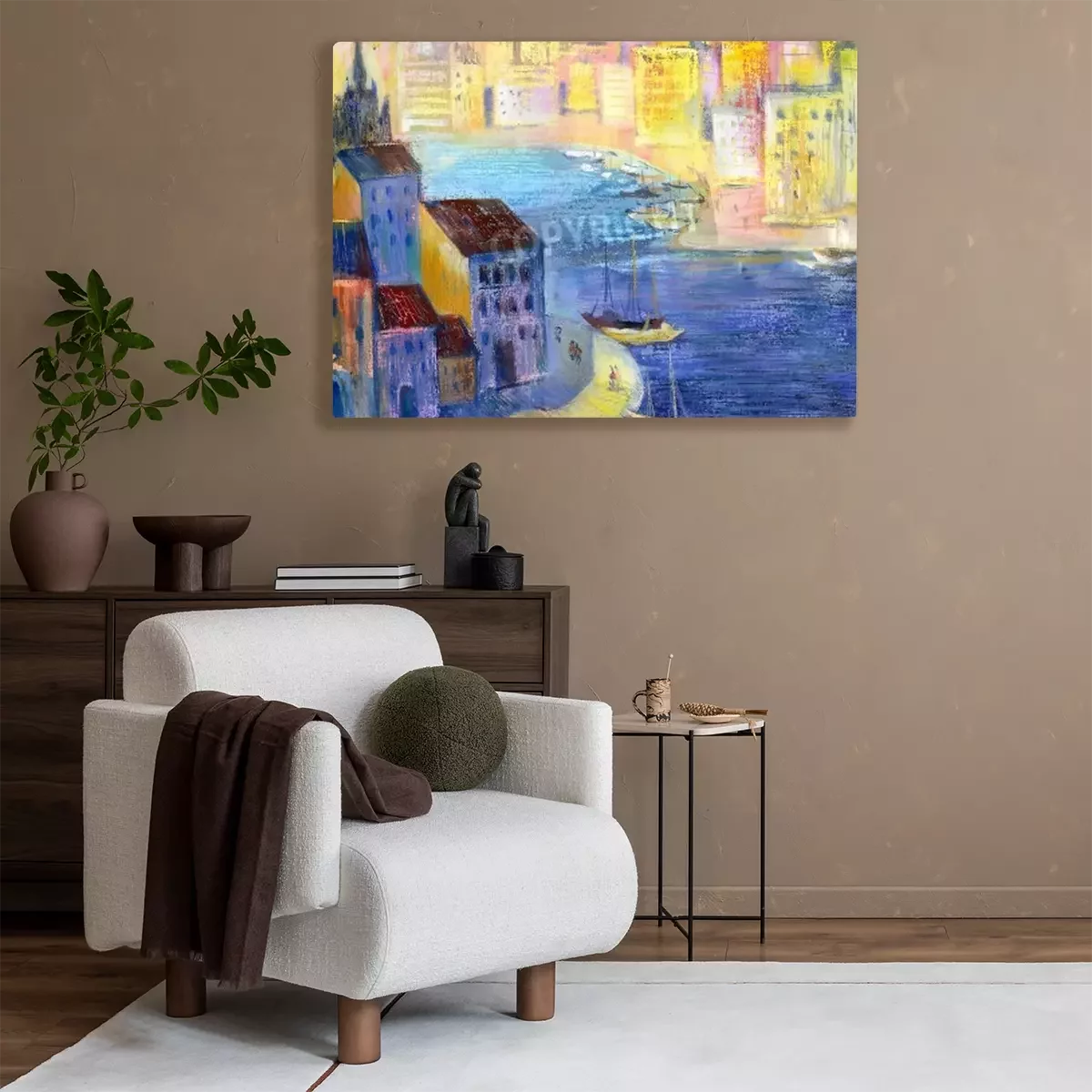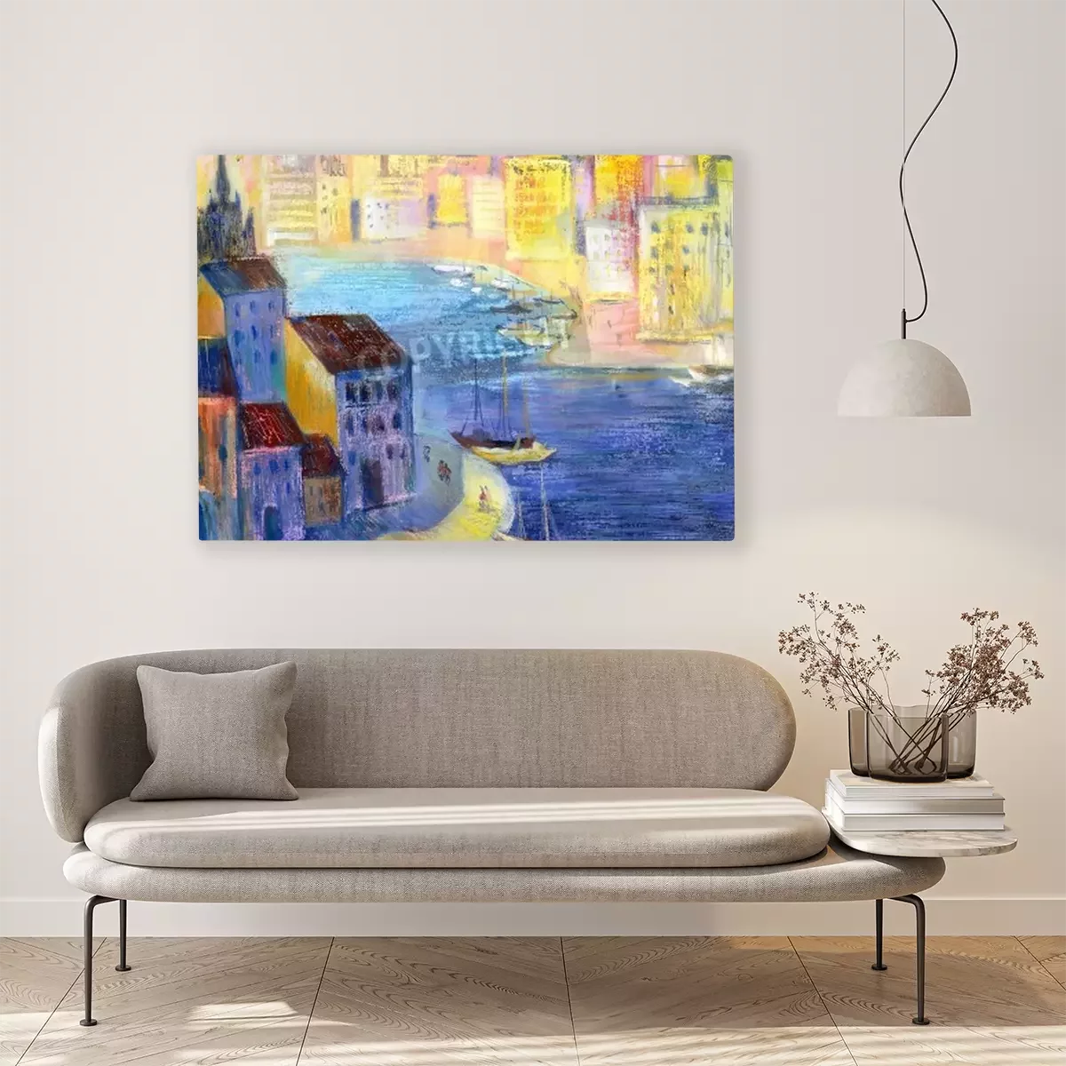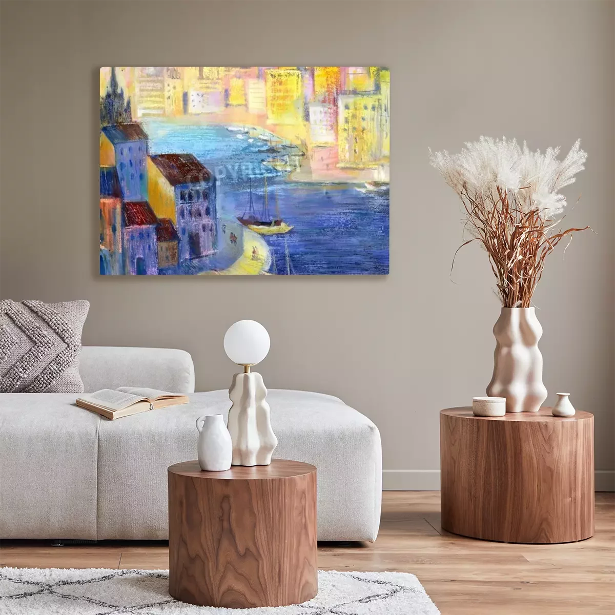 Tableau  Paysage de la ville avec le fleuve et les bateaux