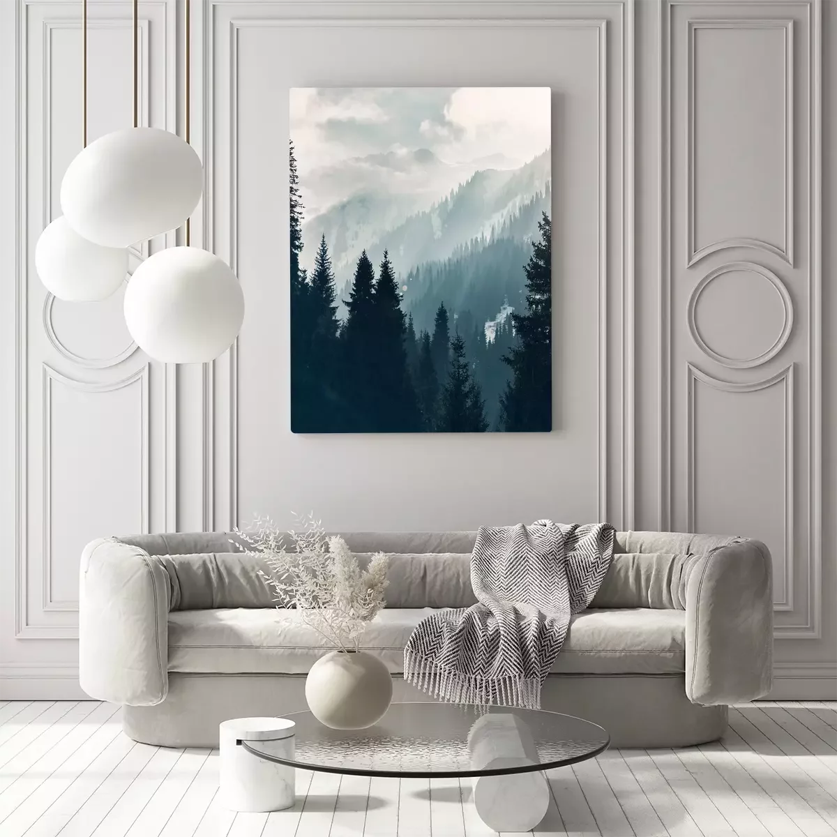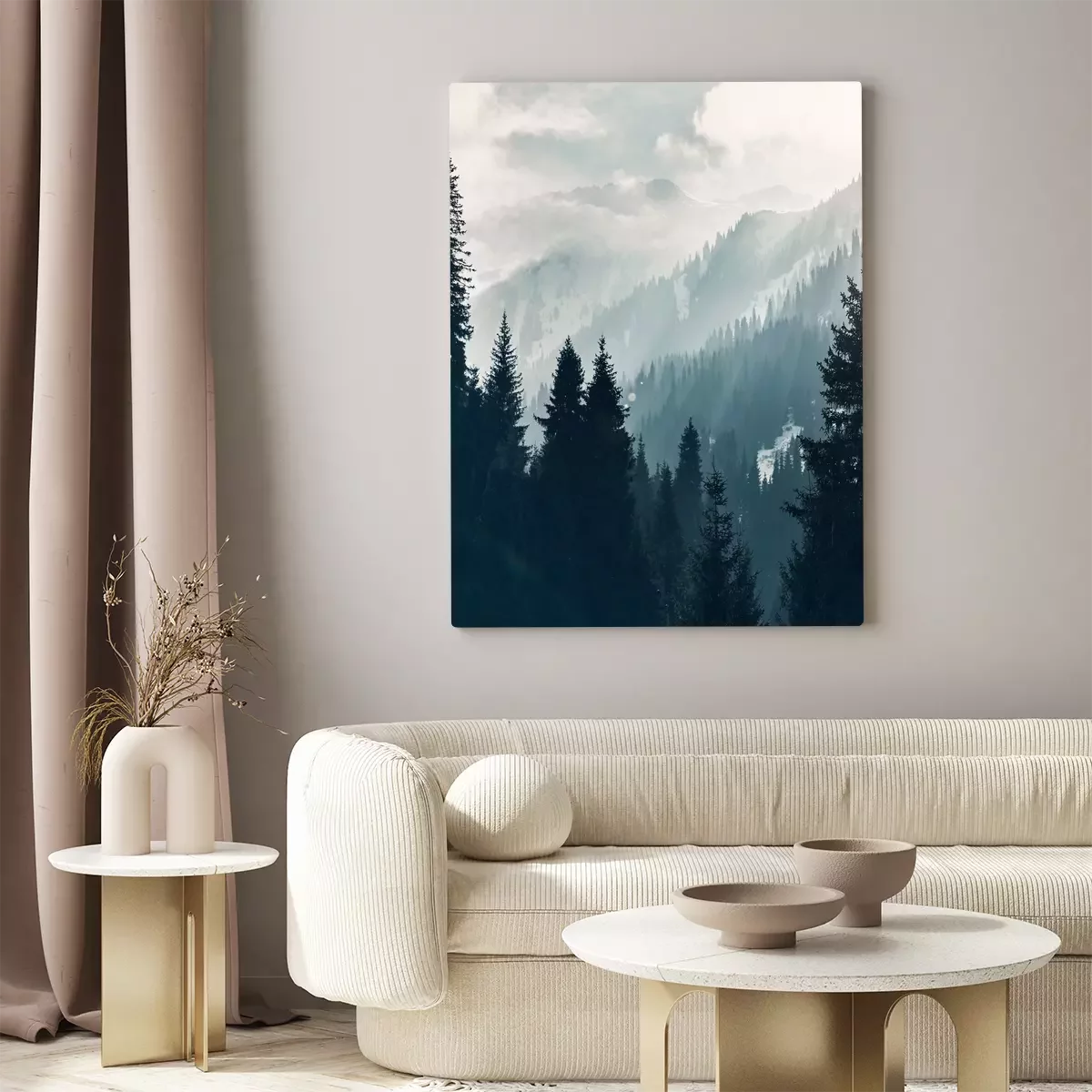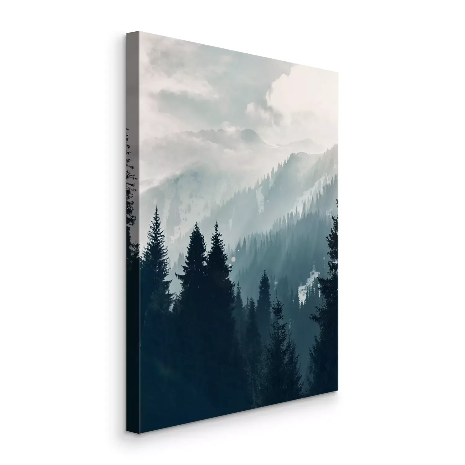 Paysage de montagne brumeux avec forêt au lever du soleil