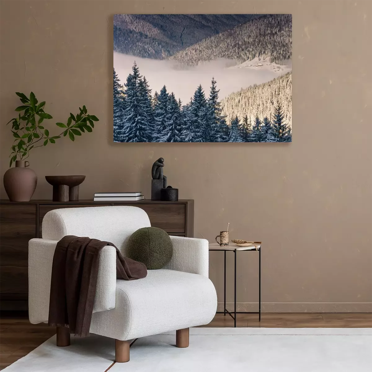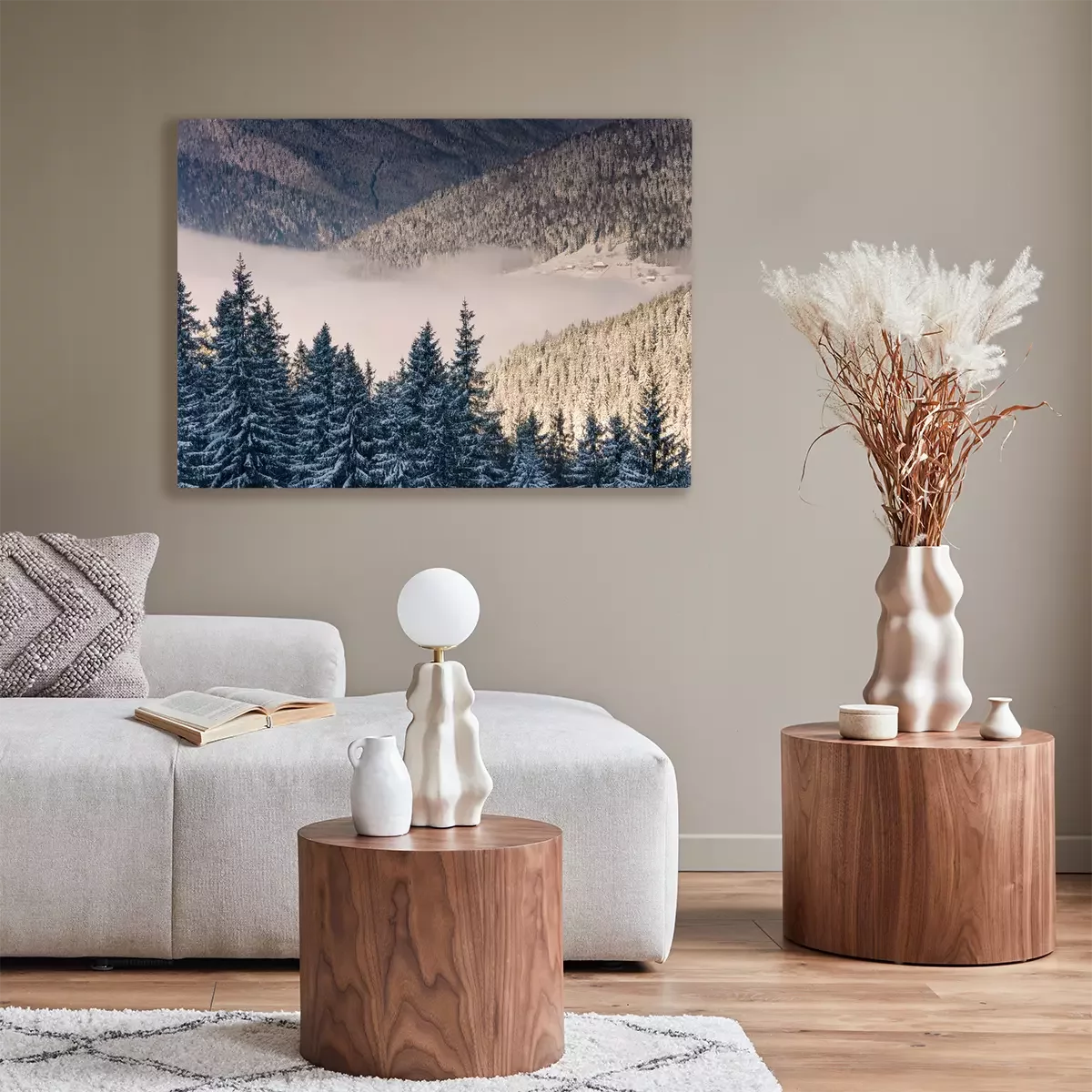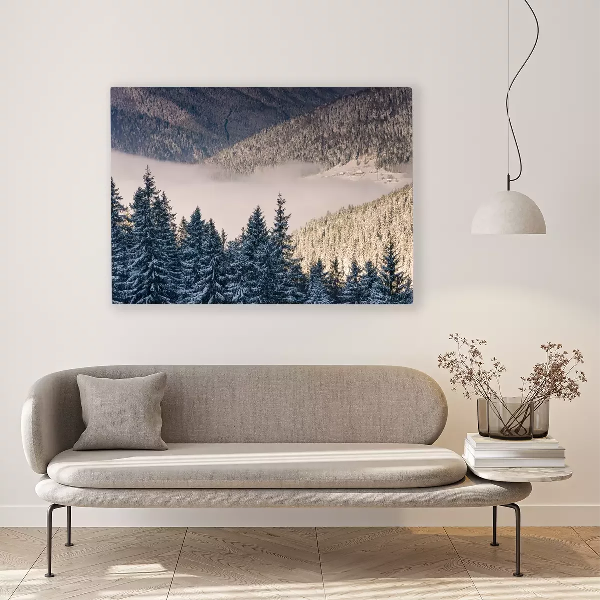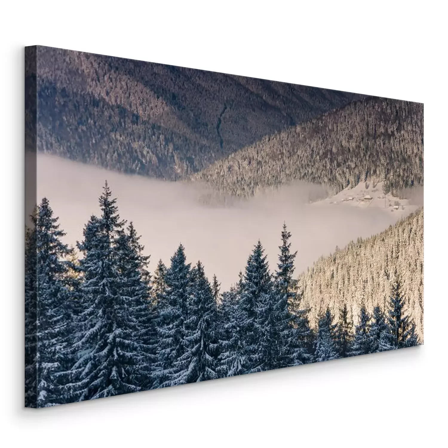 Tableau  Paysage de montagnes d'hiver. Vue, neige-couvert, conifère, Arbres, brume, lever soleil, vilage, distance