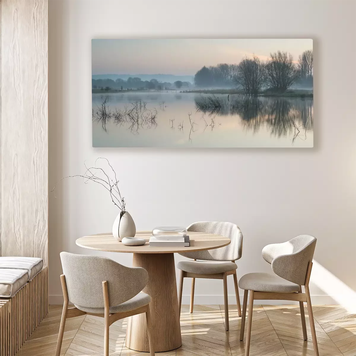 Tableau  Paysage du lac dans la brume avec le soleil lueur au lever du soleil
