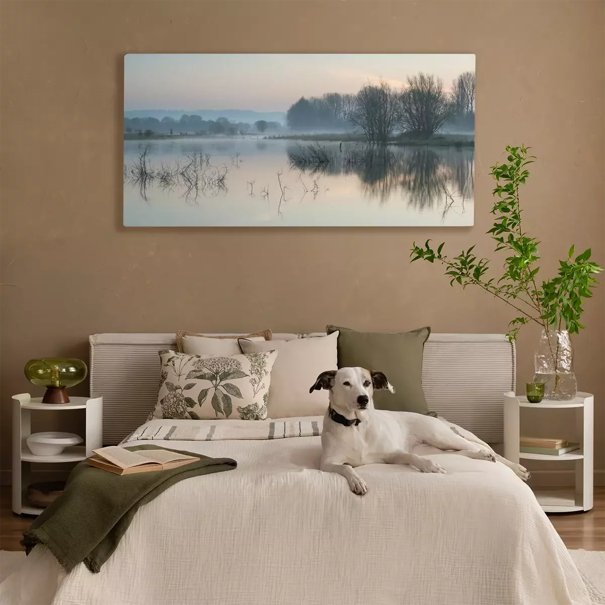 Tableau : Paysage du lac dans la brume avec le soleil lueur au lever du soleil