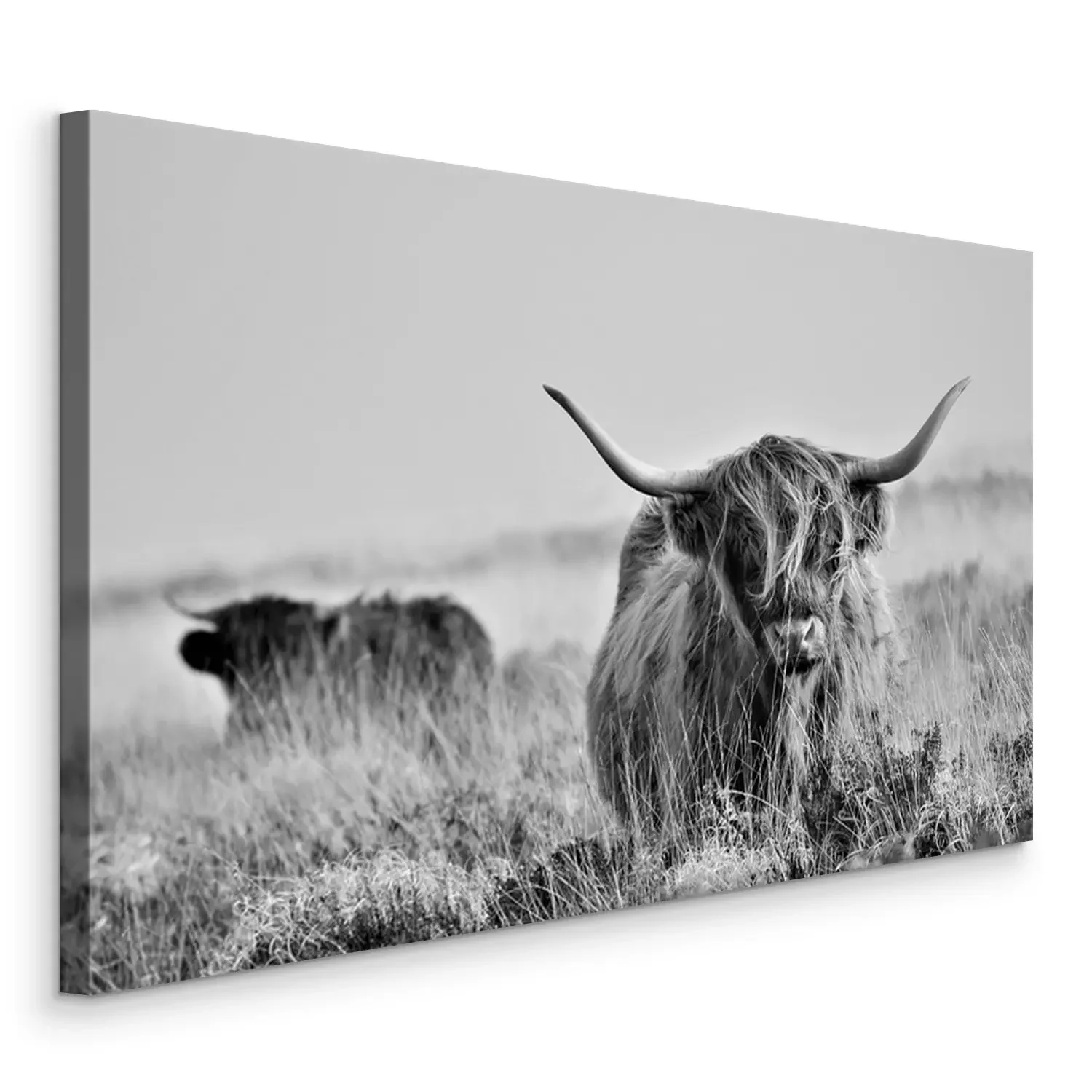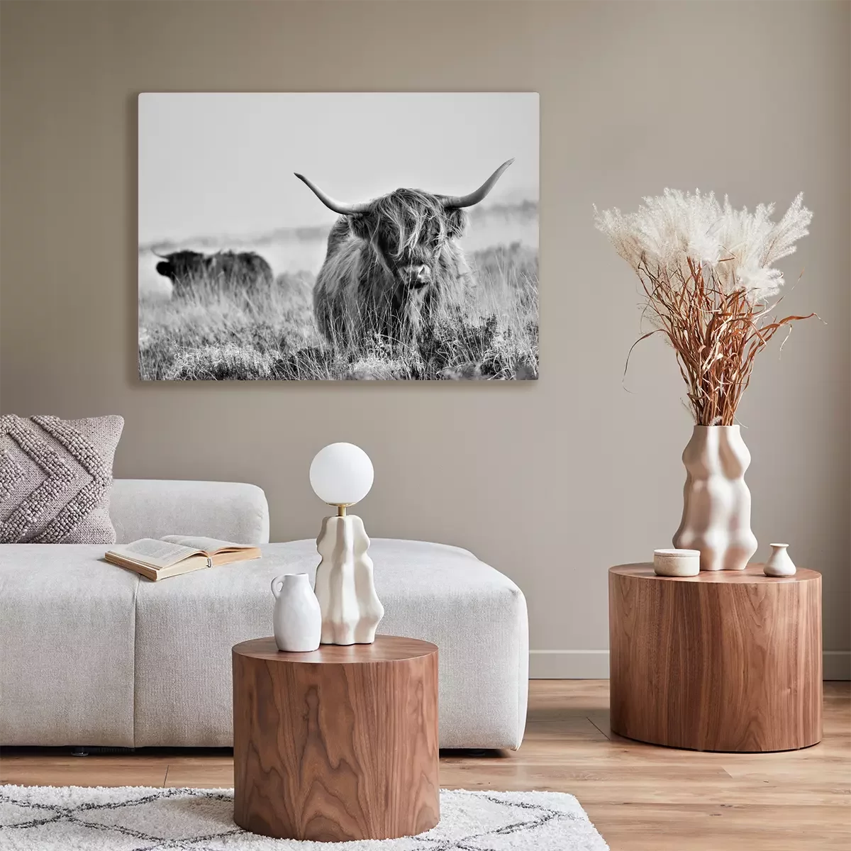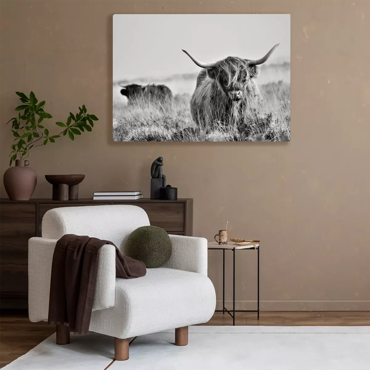 Tableau  Paysage en noir et blanc avec des vaches écossaises