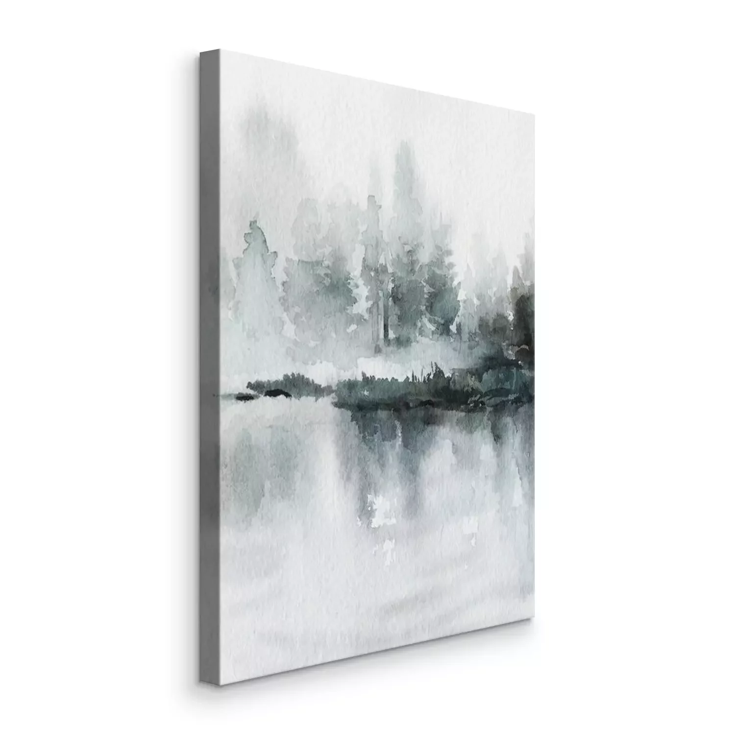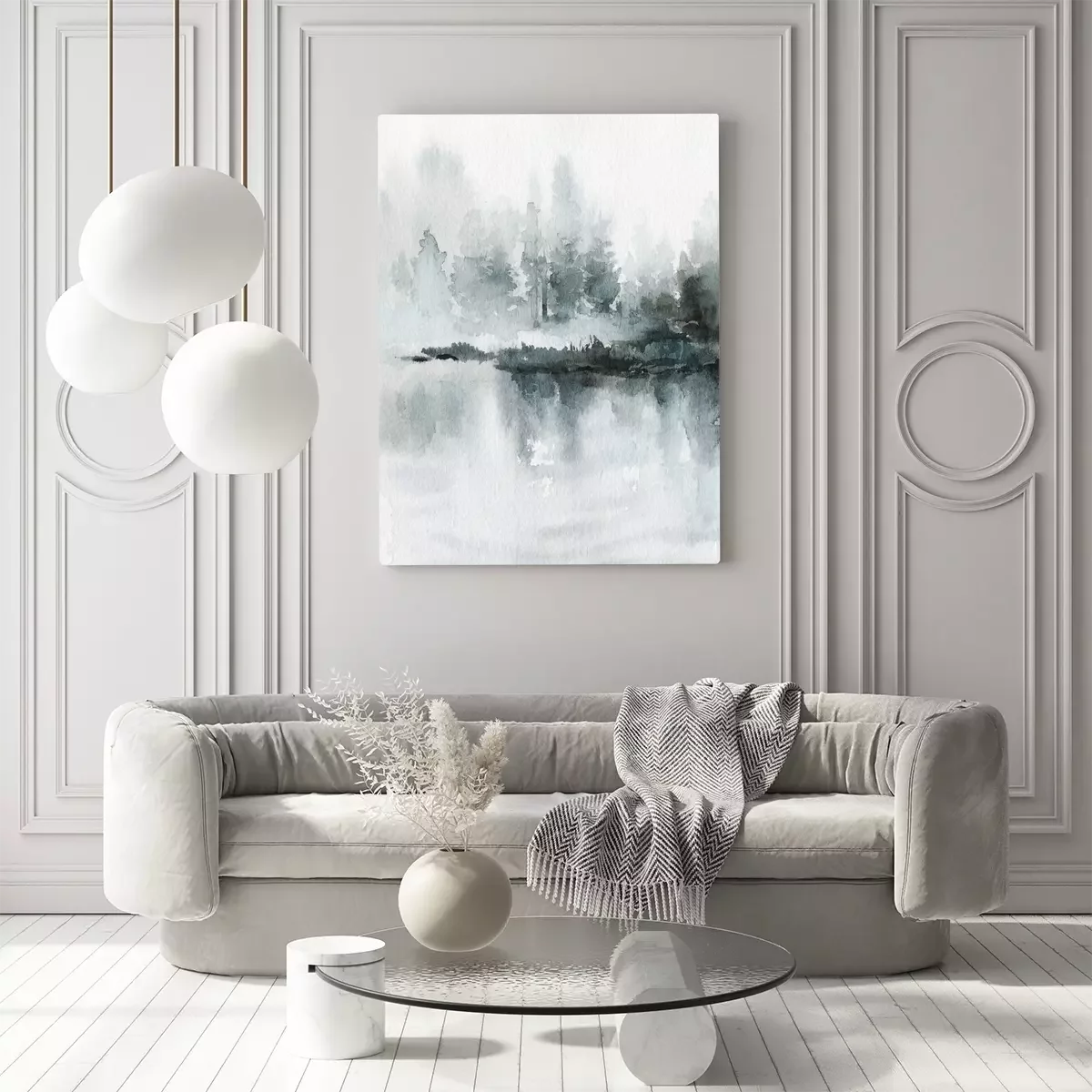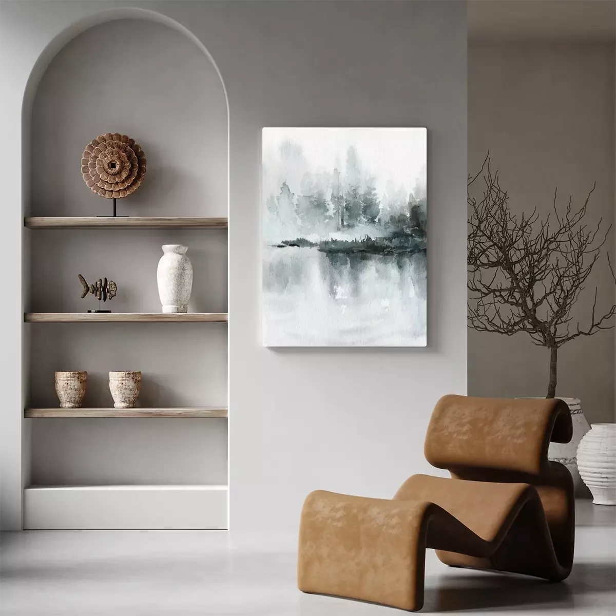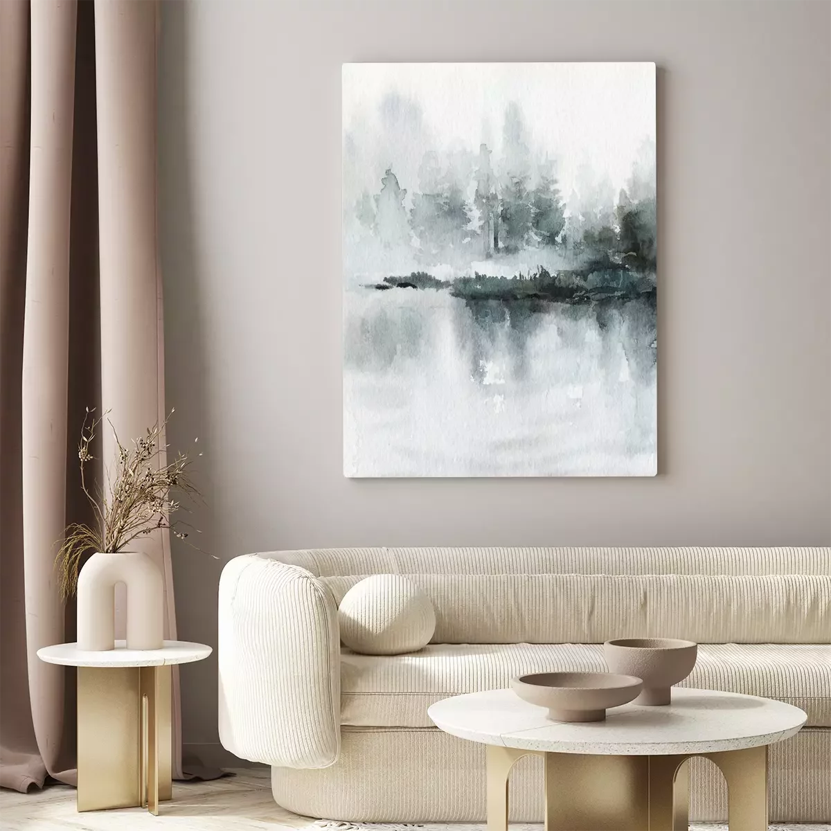 Tableau  Paysage néo-noir. Bleu rivière / lac / mer / océan avec les montagnes et la forêt dans le brouillard - aquarelle dessinée à la main dans un style minimaliste. Scène pré-faite, fond.