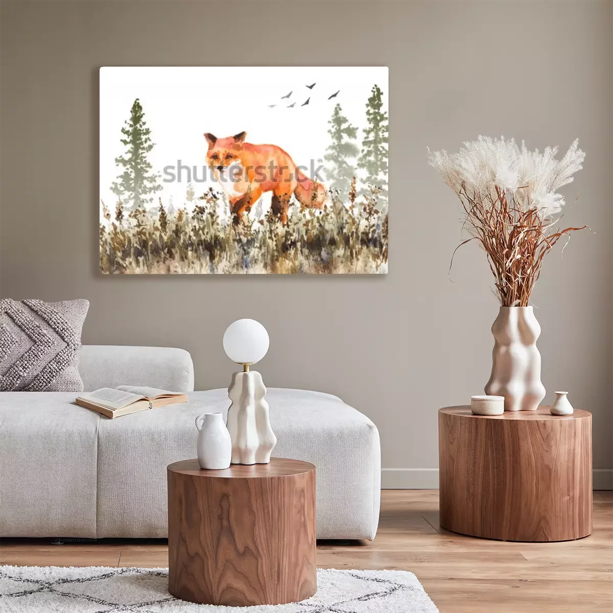 Tableau  Peinture à l'aquarelle. Illustration animale dessinée à la main. Renard roux marchant sur une prairie décolorée. Scène d'automne avec le mouvement du prédateur sauvage