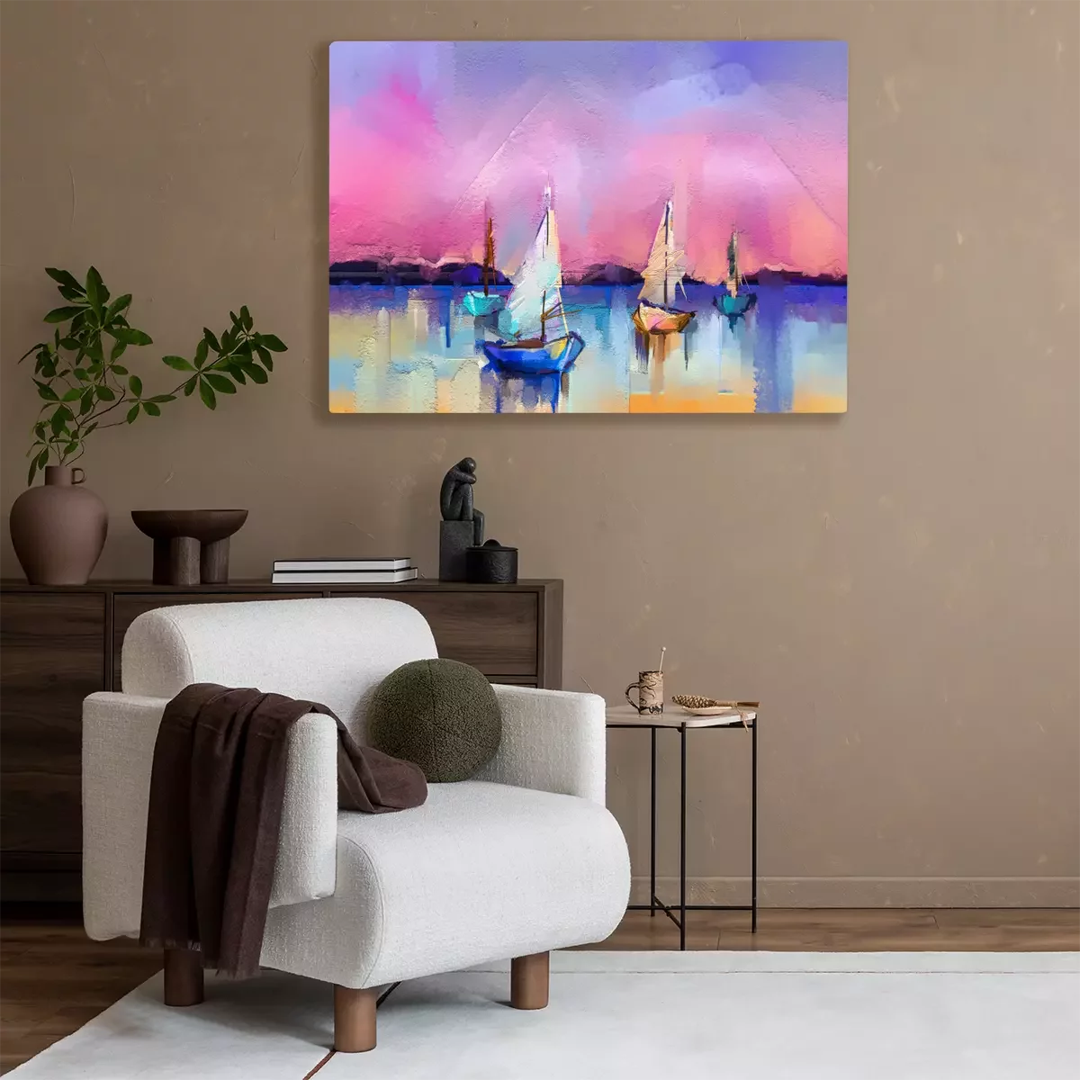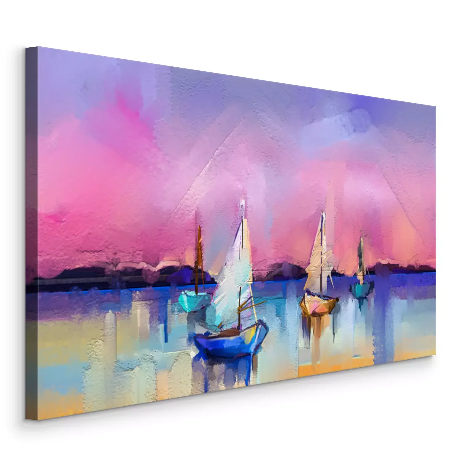 Tableau  Peinture à l'huile colorée sur la texture de la toile. Image impressionniste de peintures de paysages marins avec fond de lumière du soleil. Peintures à l'huile d'art moderne avec le bateau, naviguent