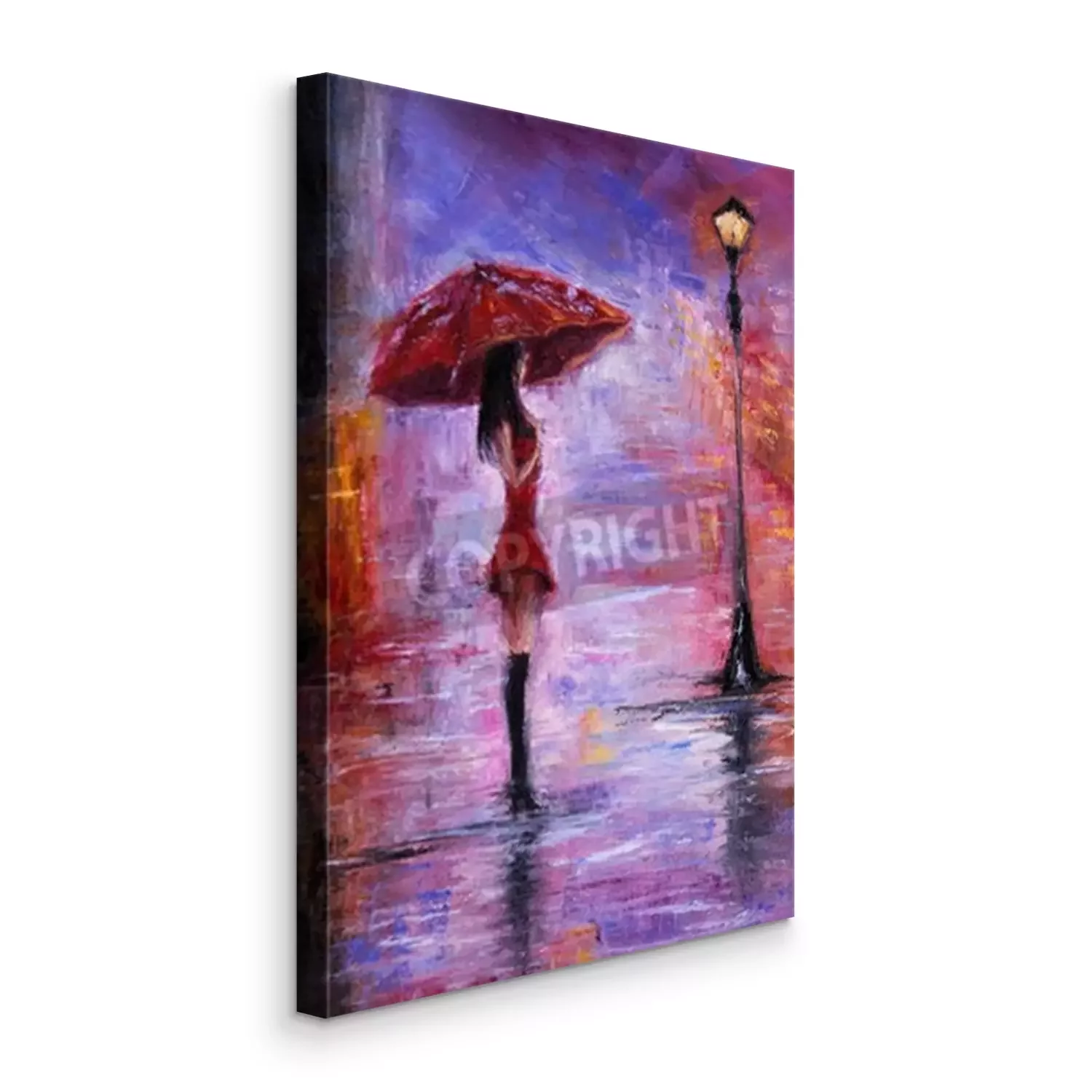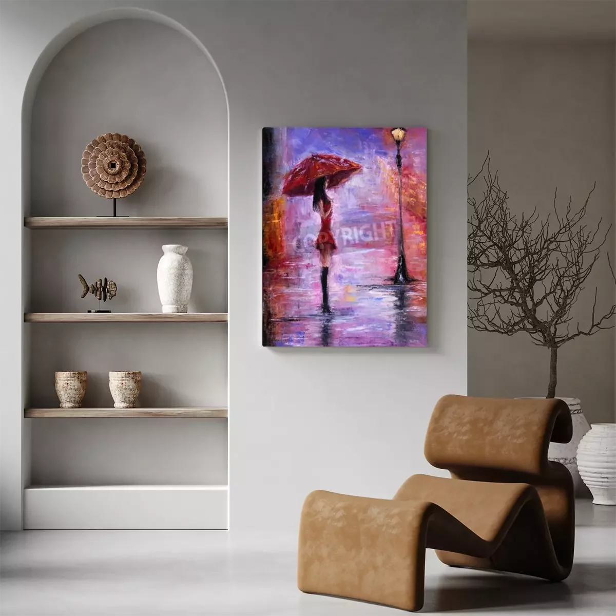 Tableau  Peinture à l'huile originale montrant la belle jeune femme dans le rouge, tenant le parapluie rouge près d'une lampe de rue sur la toile. Impressionnisme moderne, modernisme, marinisme