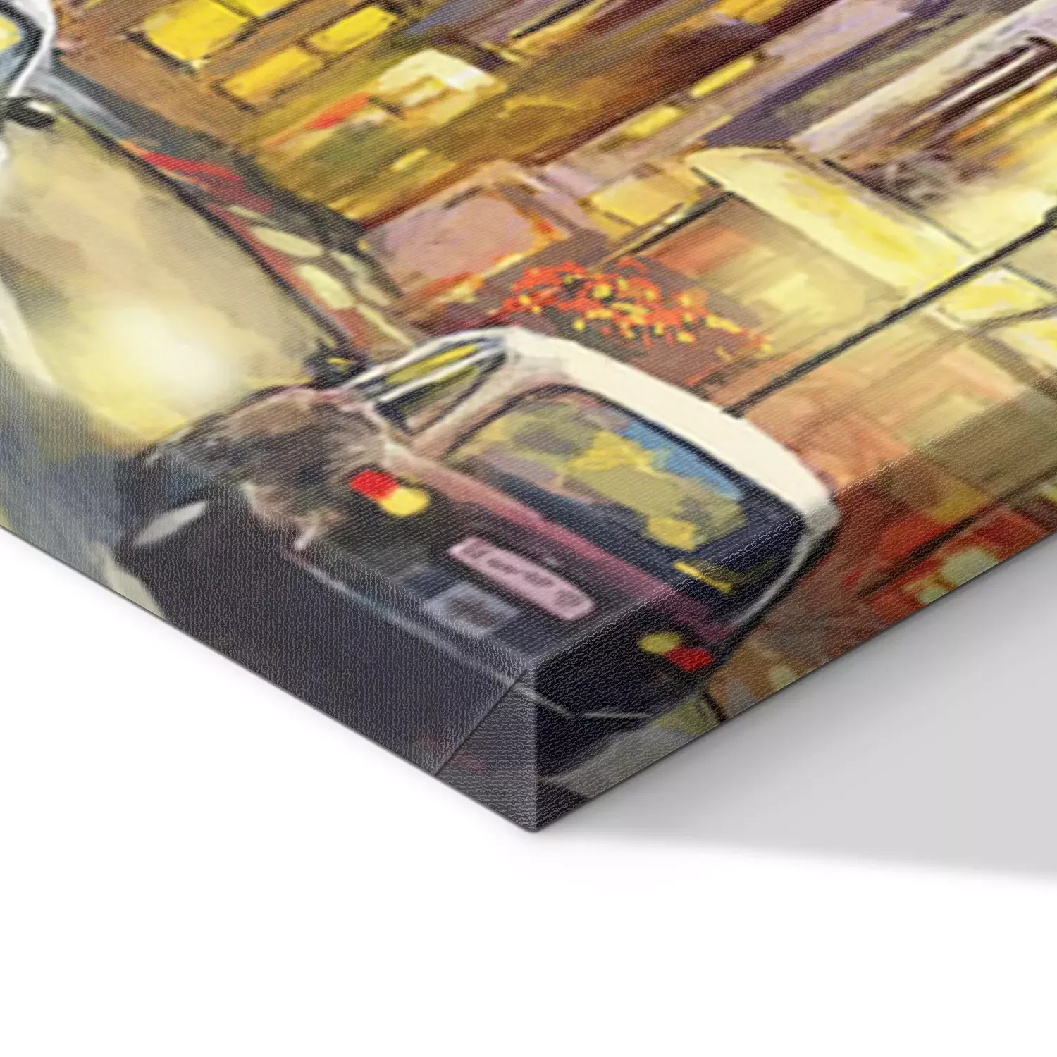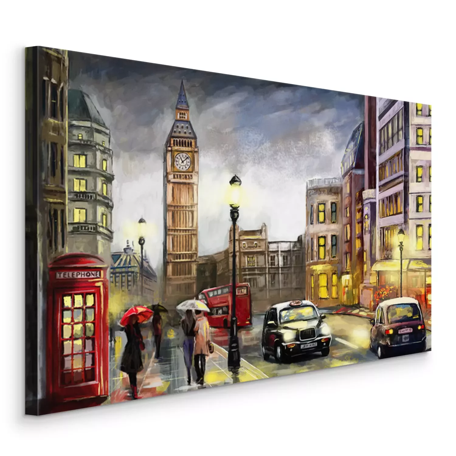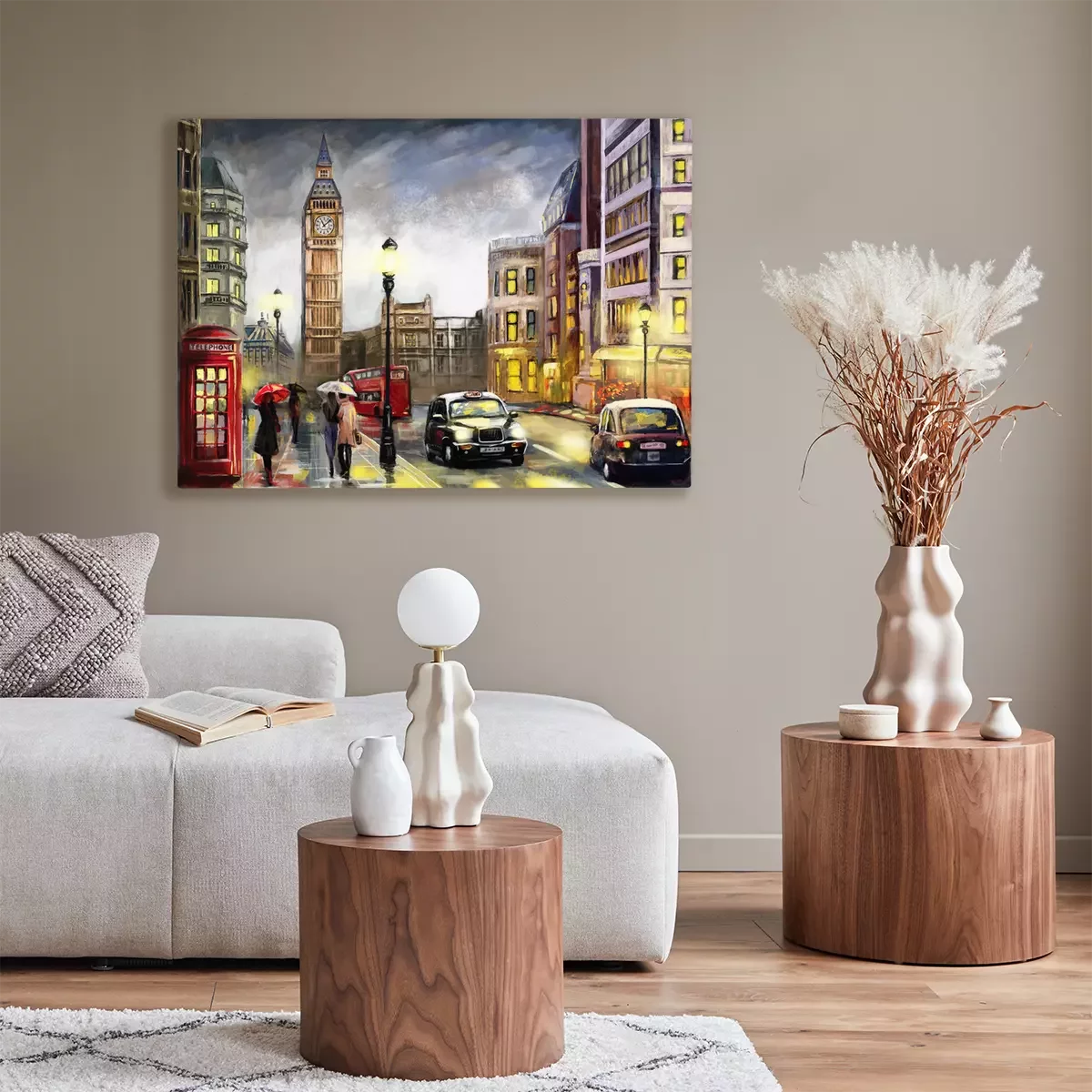 Tableau : Peinture à l'huile sur toile, vue sur rue de Londres. Ouvrages d'art. Big ben. Couple et parapluie rouge, bus et route, téléphone. Voiture noire - taxi. Angleterre