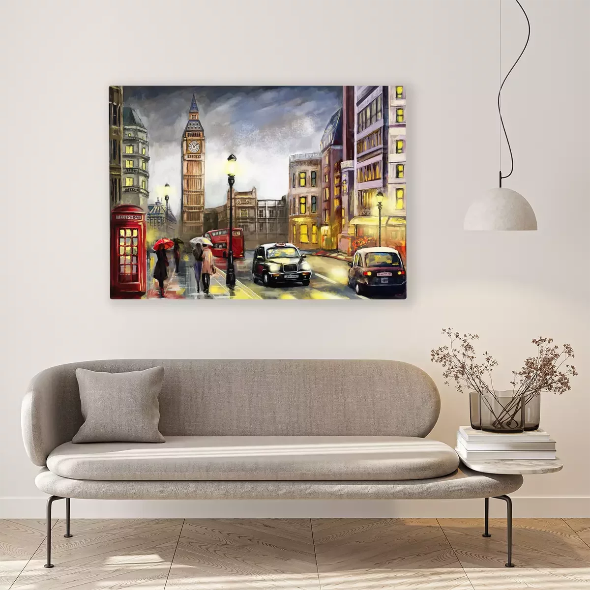 Tableau  Peinture à l'huile sur toile, vue sur rue de Londres. Ouvrages d'art. Big ben. Couple et parapluie rouge, bus et route, téléphone. Voiture noire - taxi. Angleterre
