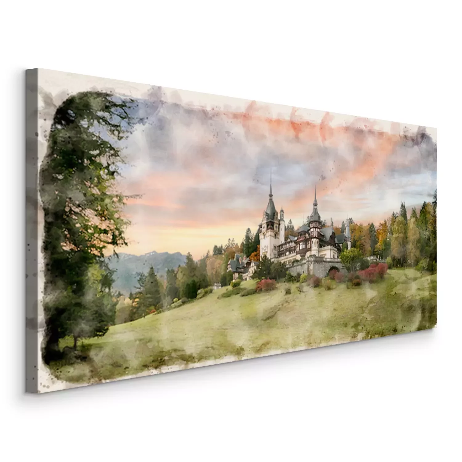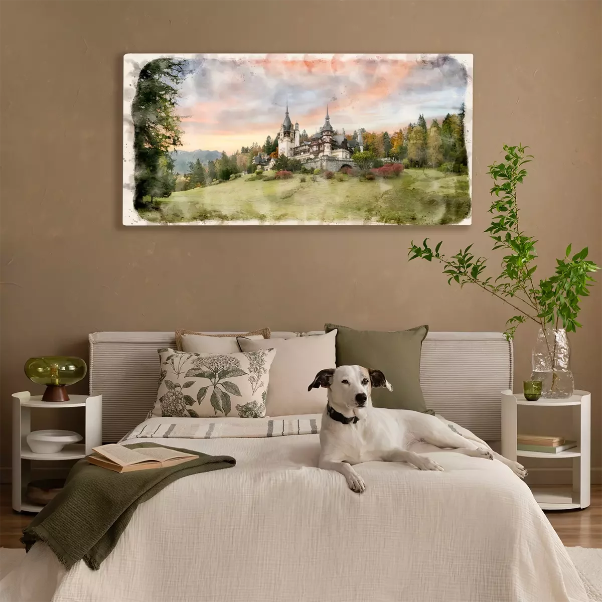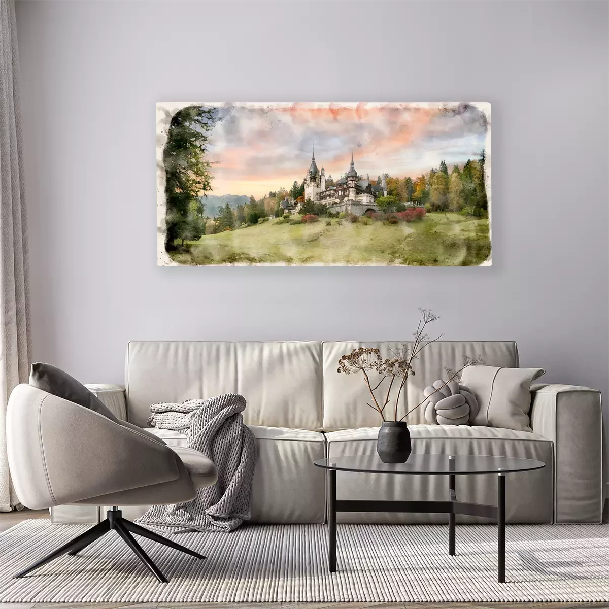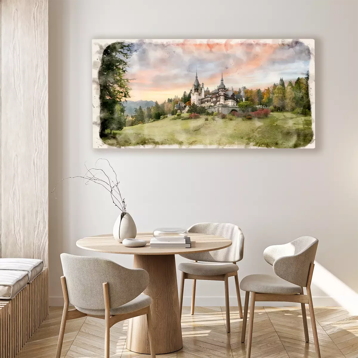 Tableau  Peles Castle in Sinaia, Romania in watercolor style illustration. Landmark of Carpathian Mountains in Europe