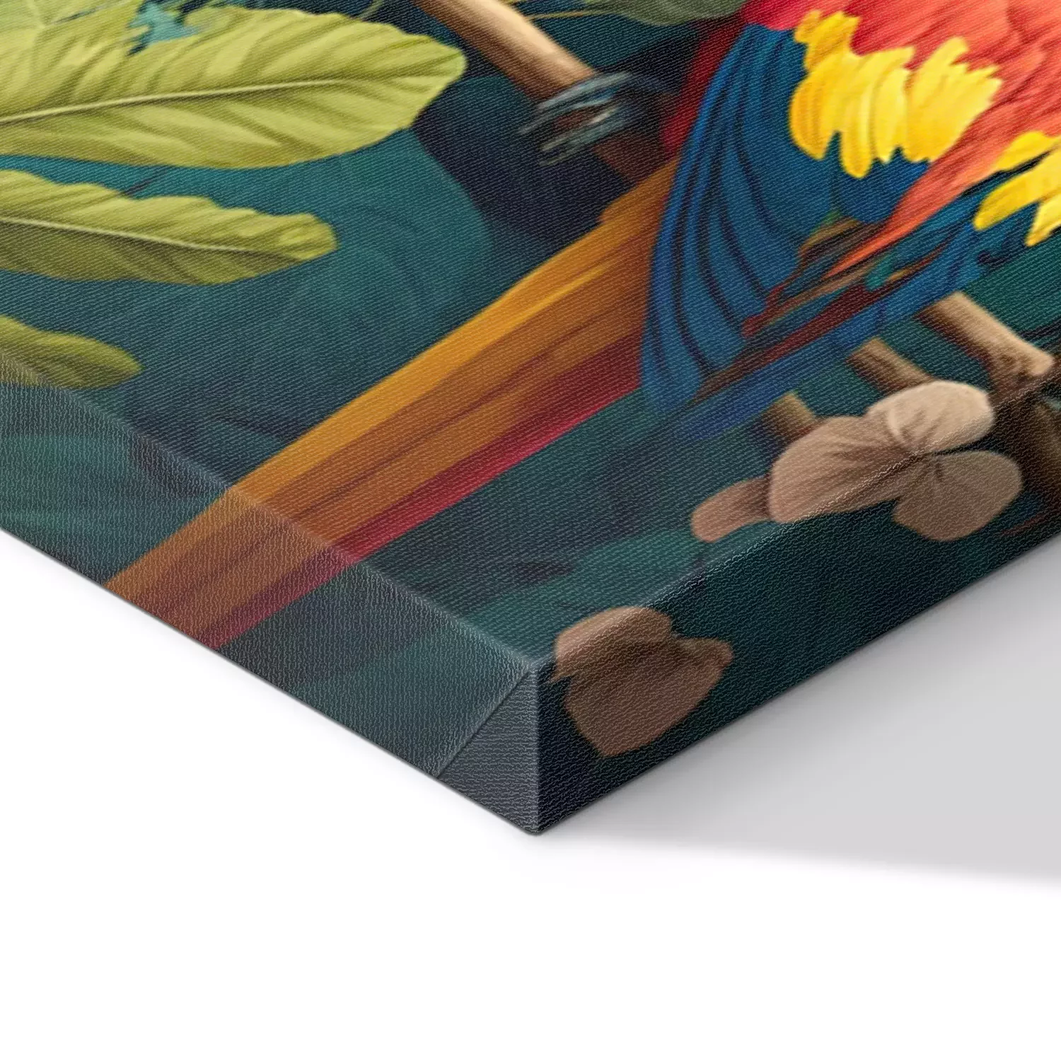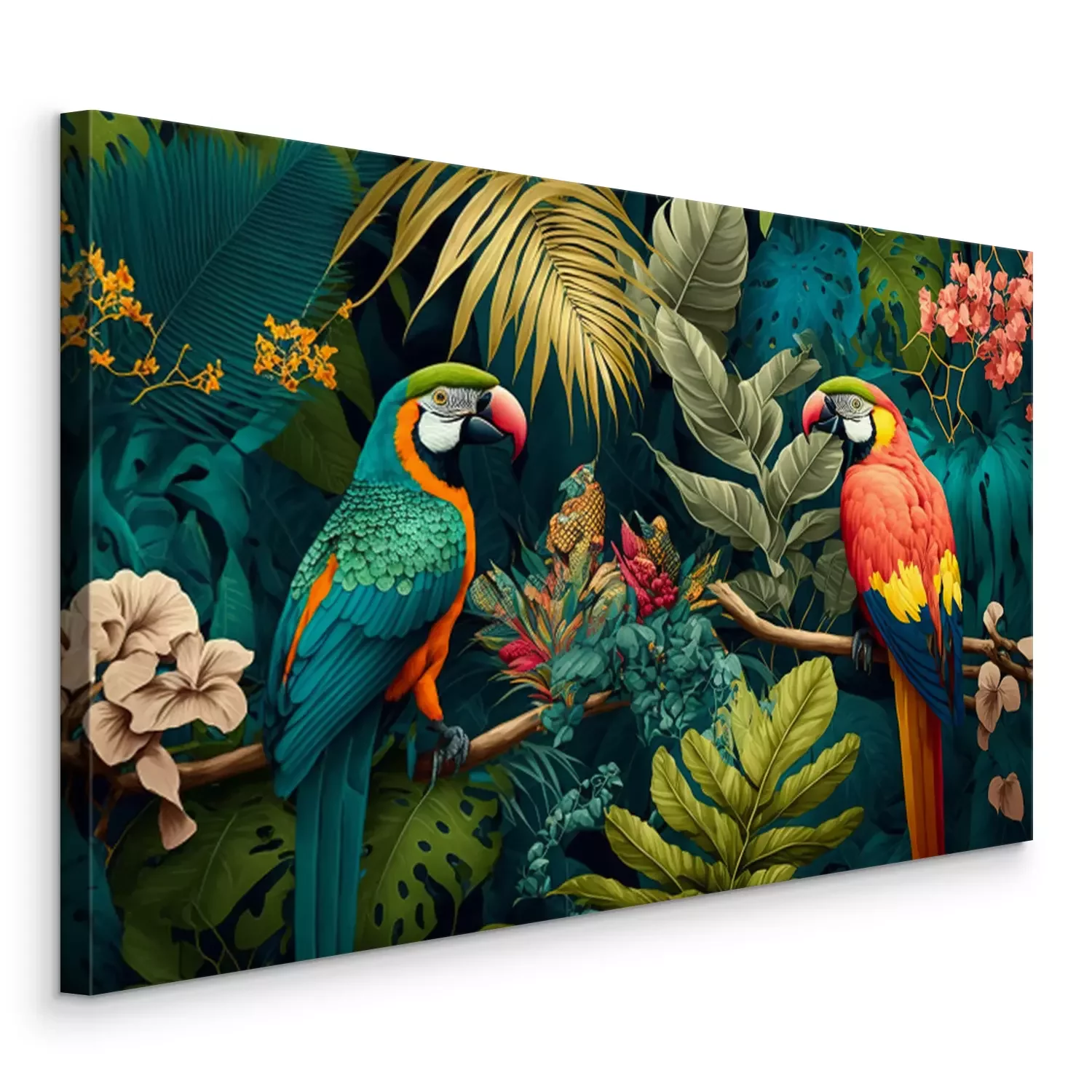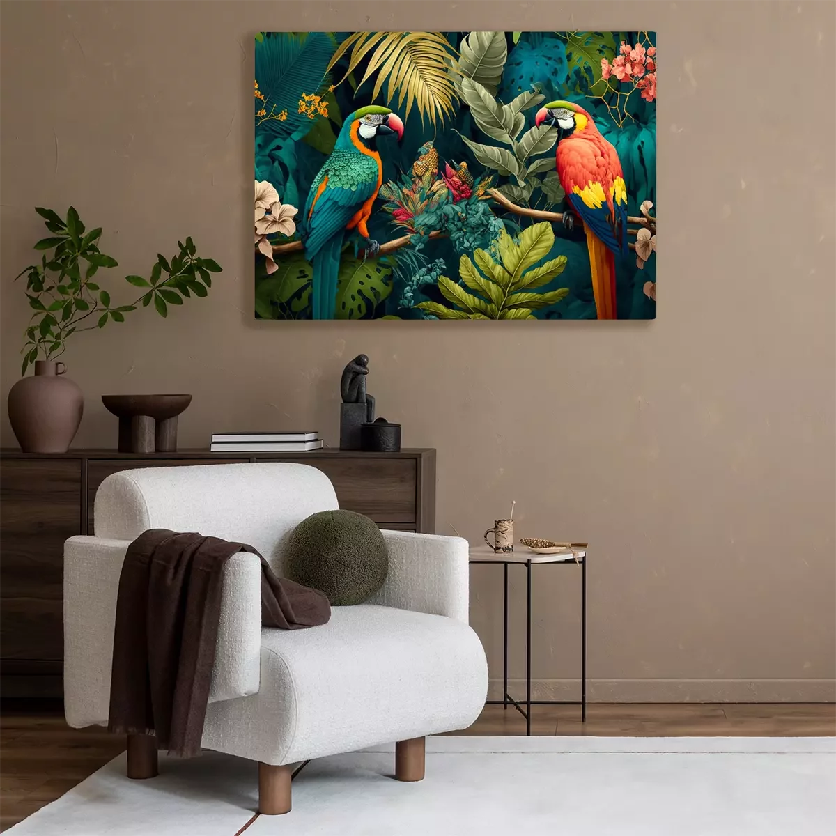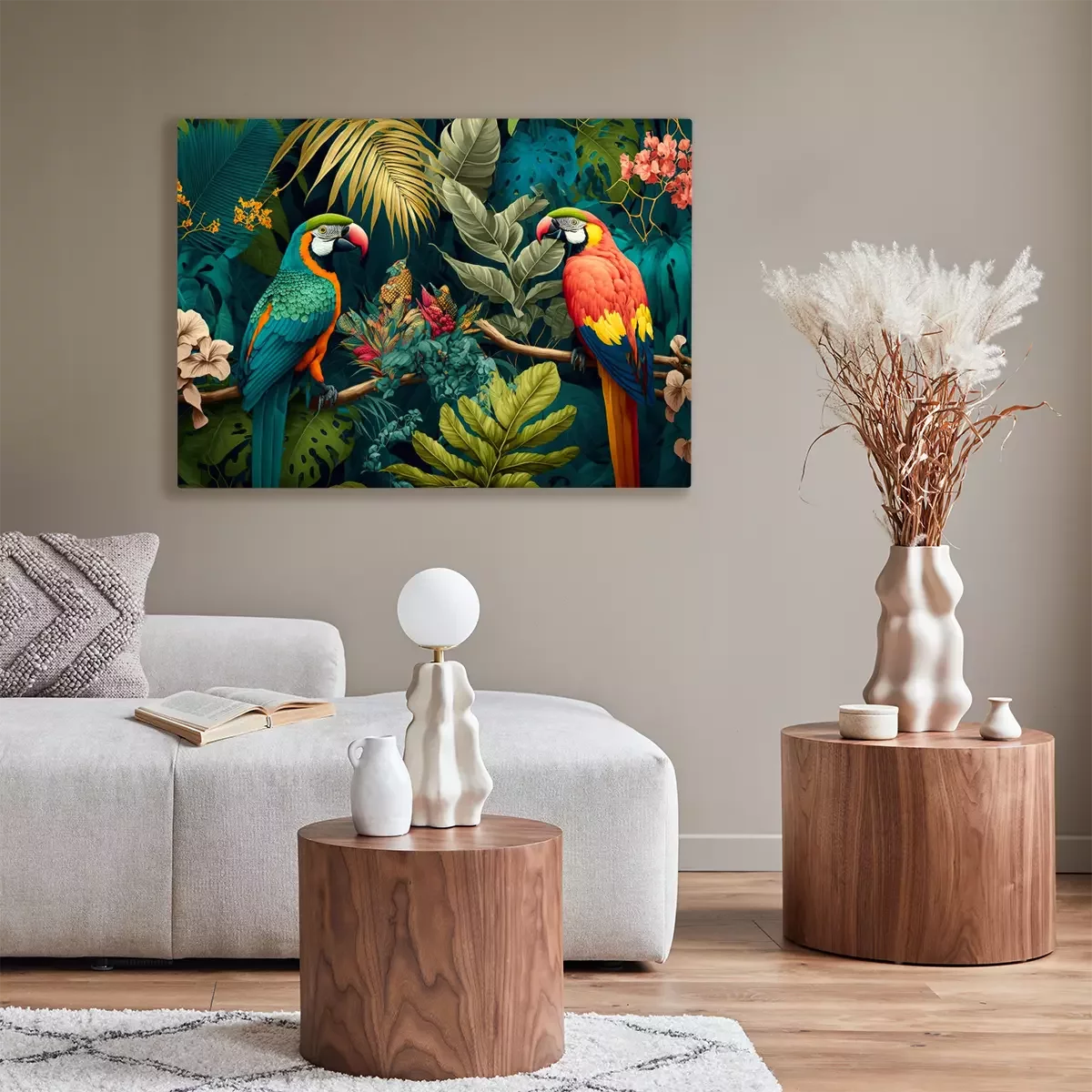 Tableau : Perroquets sur une branche parmi les feuilles tropicales dans la jungle
