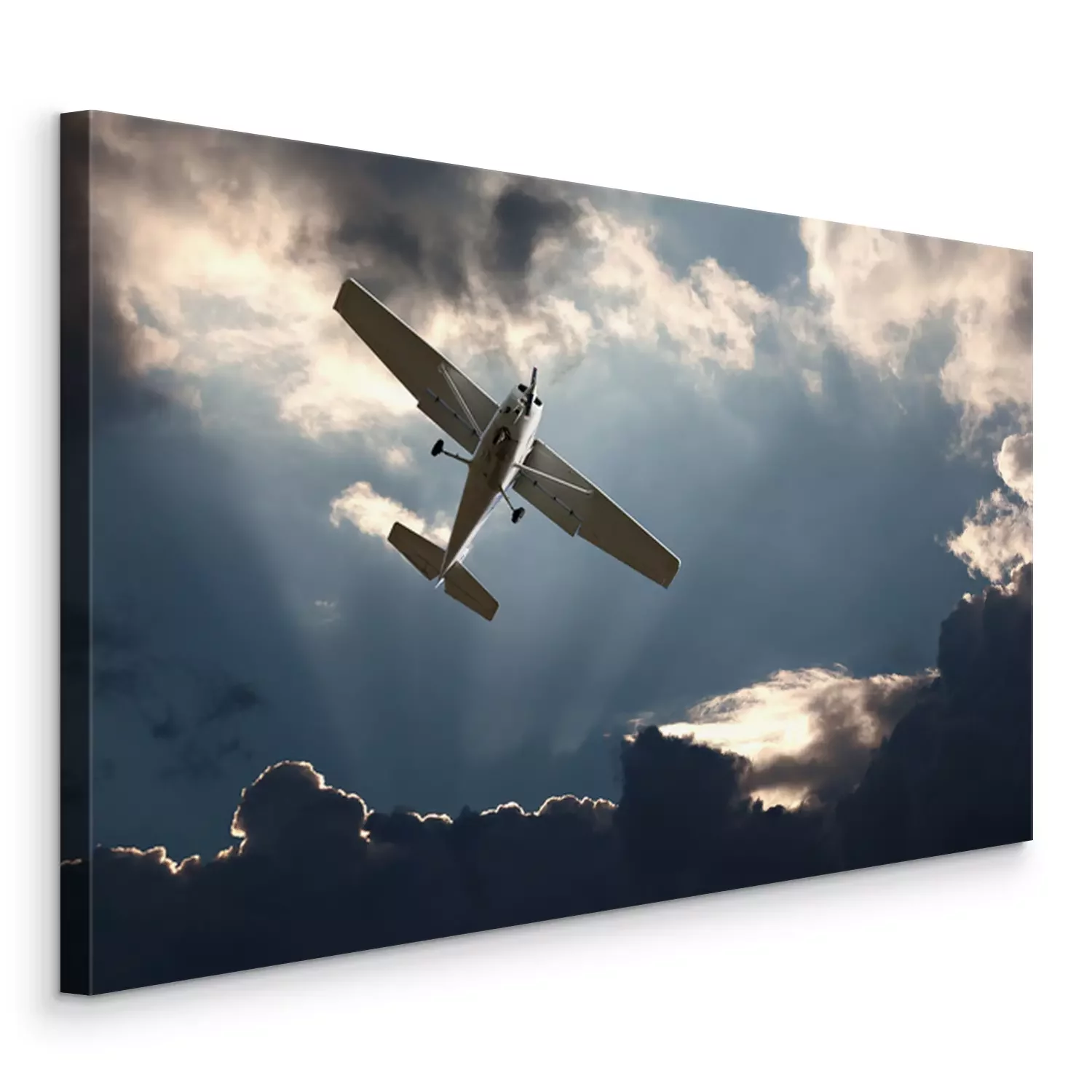 Tableau : Petit avion à voilure fixe contre un ciel orageux