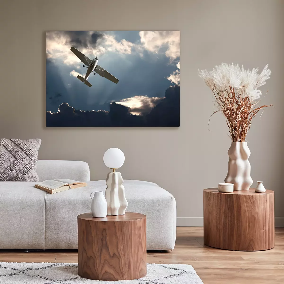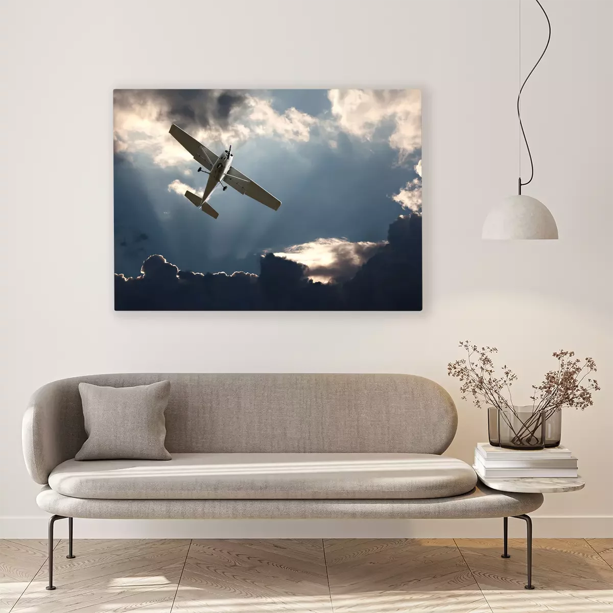 Tableau  Petit avion à voilure fixe contre un ciel orageux