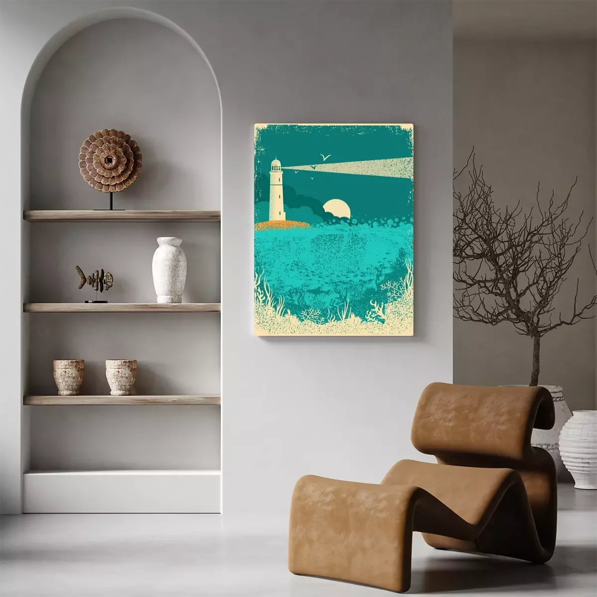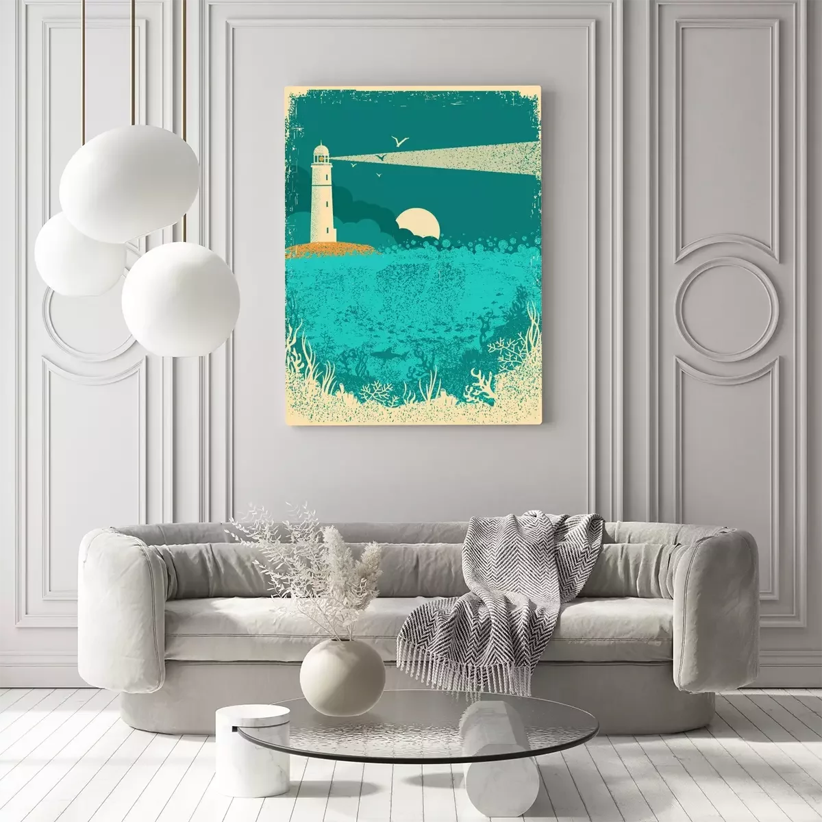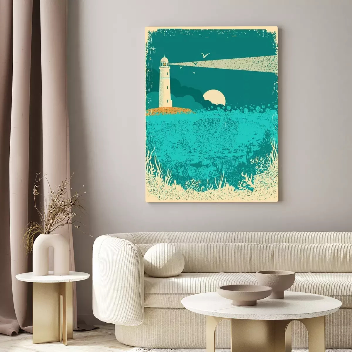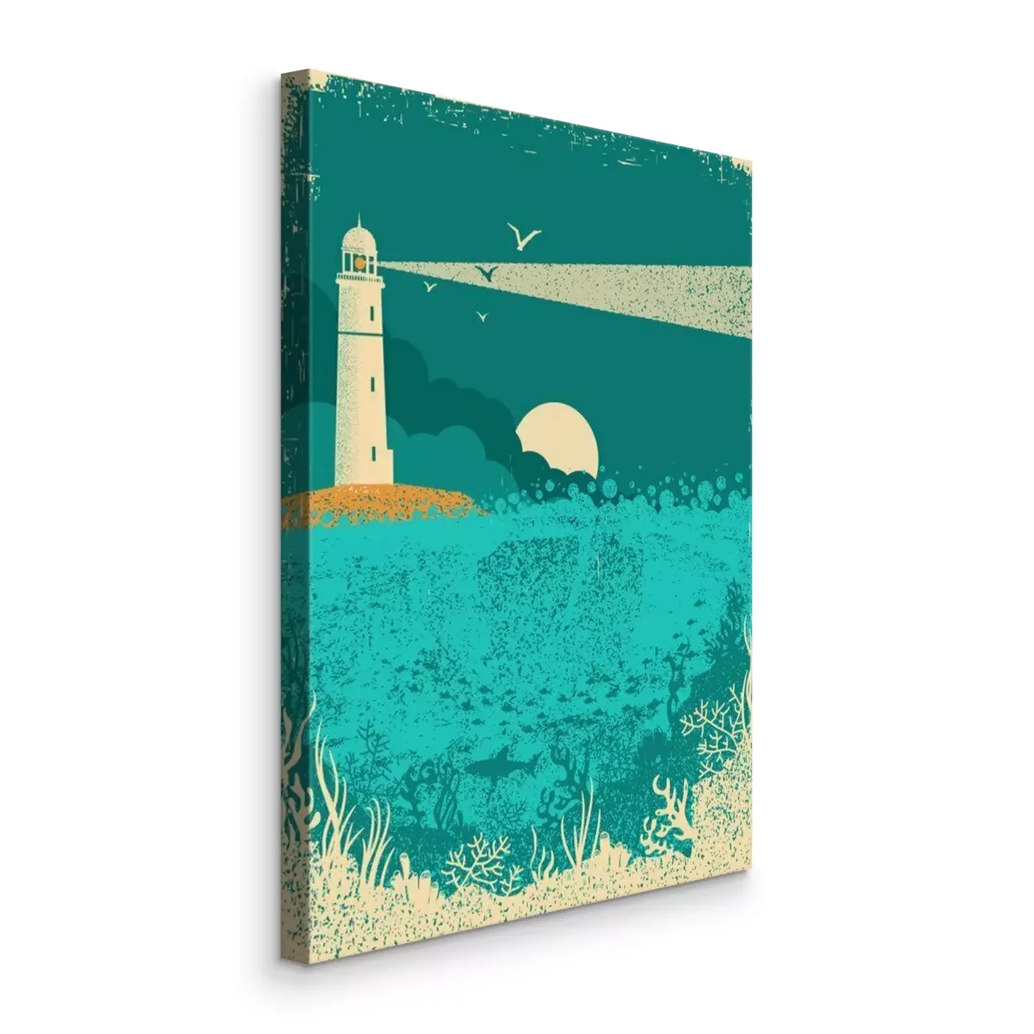 Tableau  Phare sur coucher de soleil avec des vagues de la mer. Fond de mer sous-marine sur la texture de vieux papier