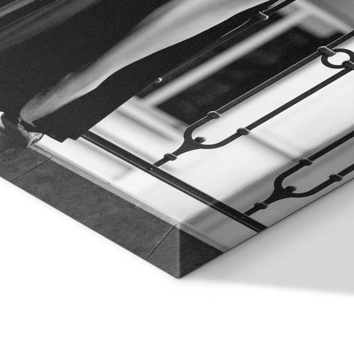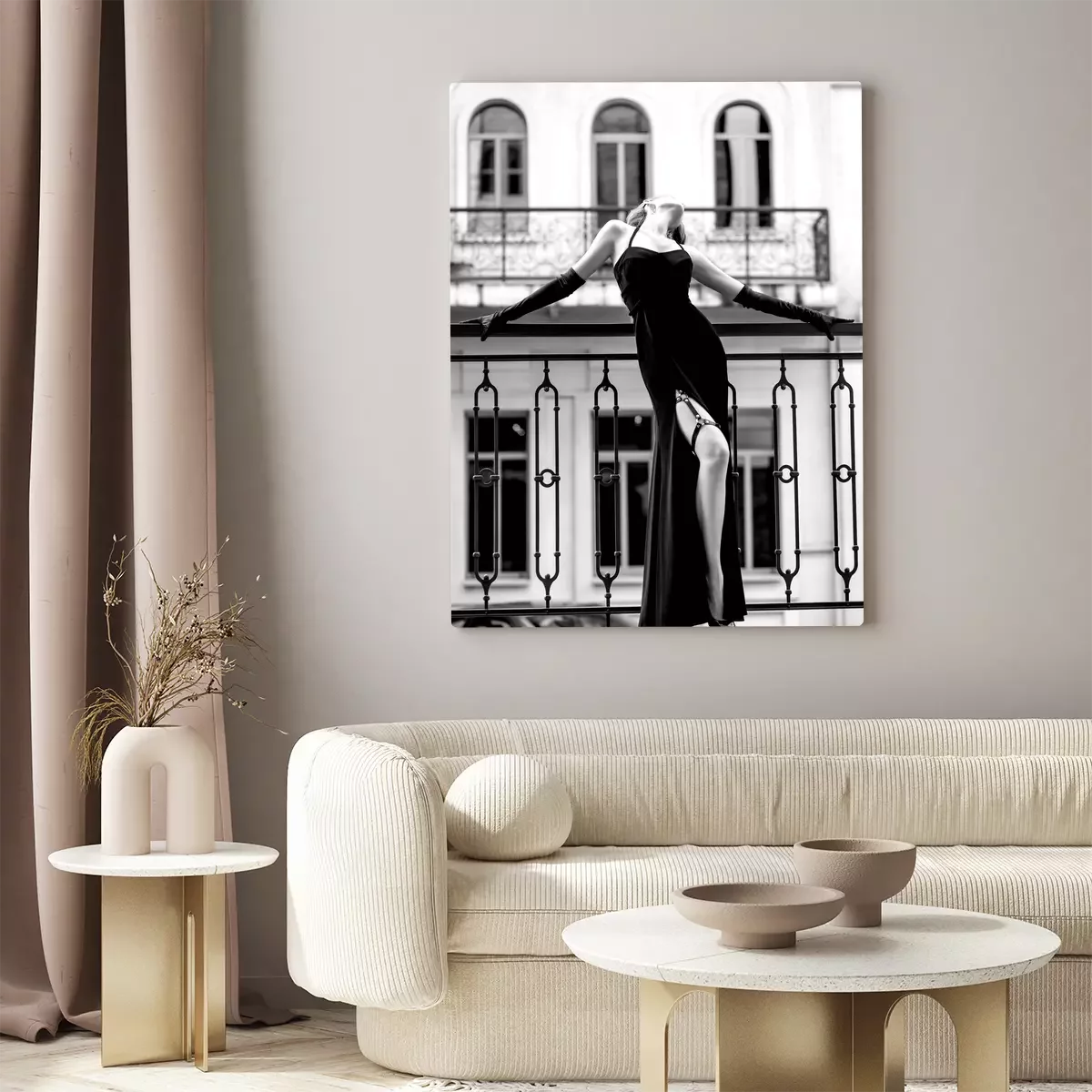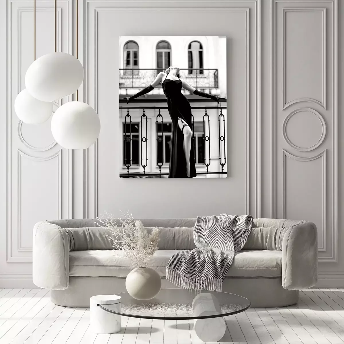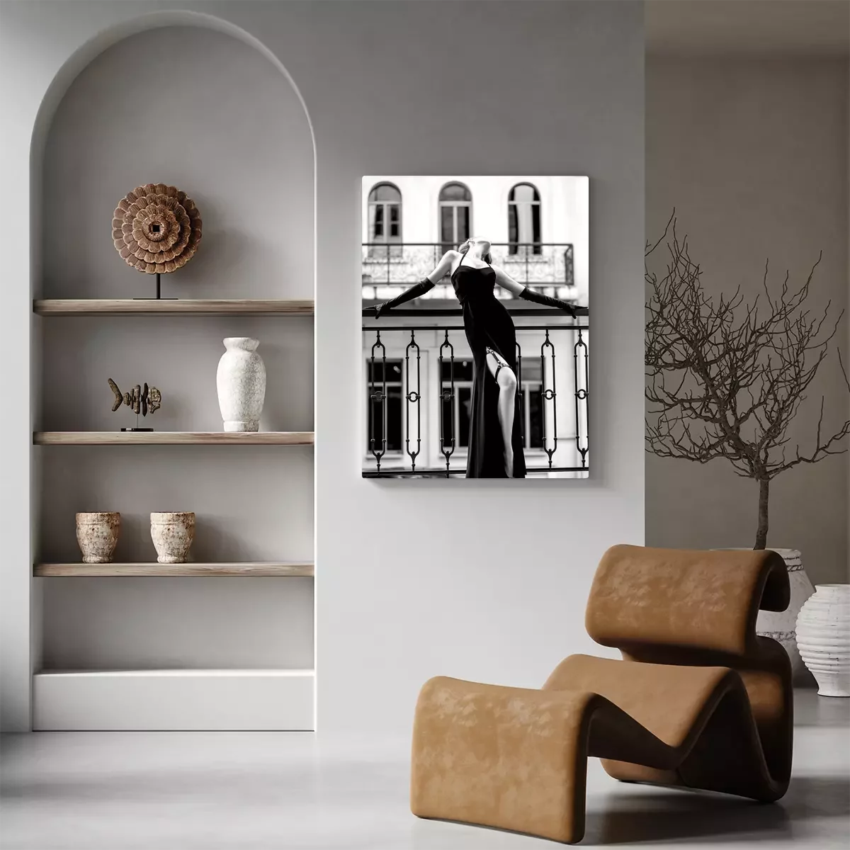 Photo en noir et blanc d'une femme en robe de soirée sur un balcon.