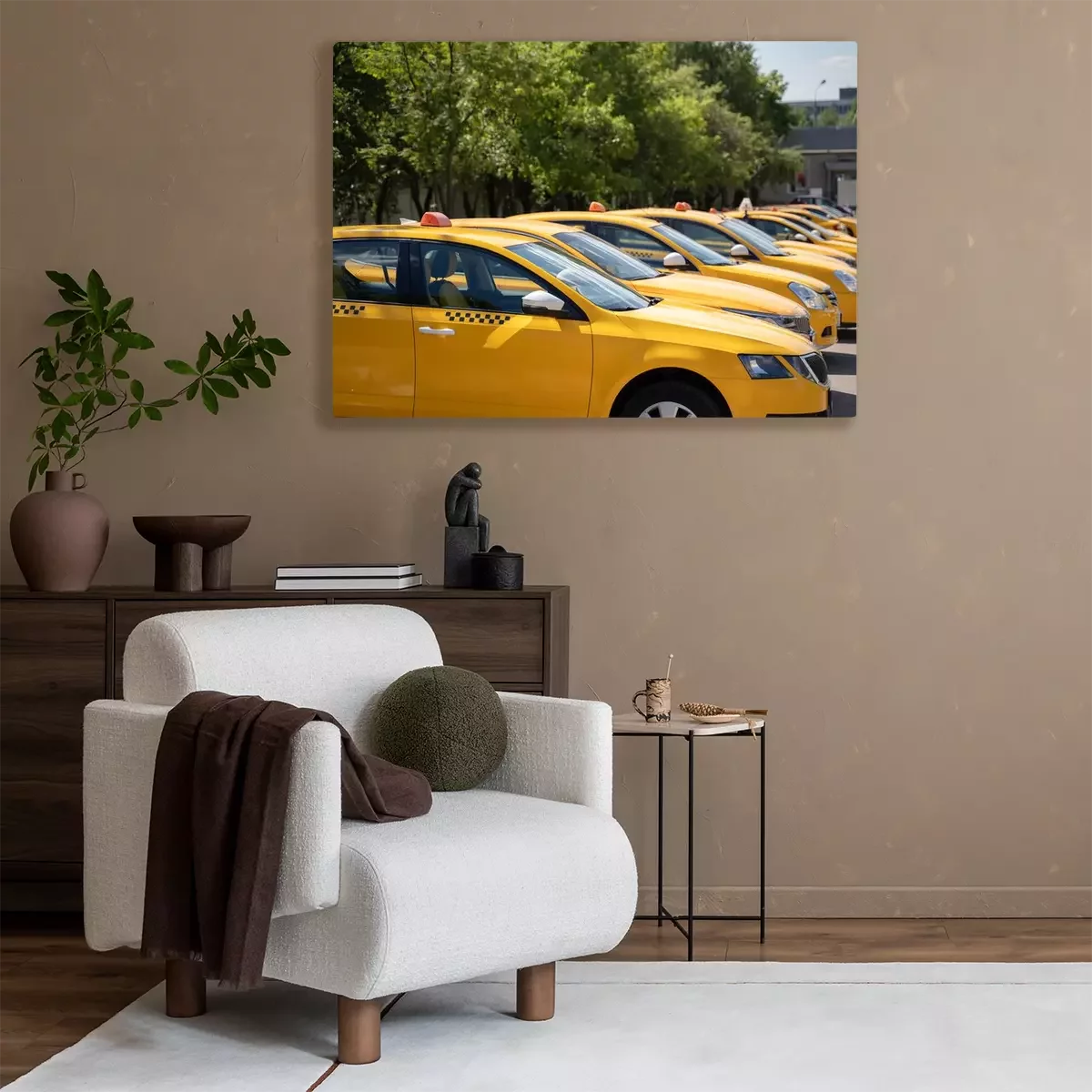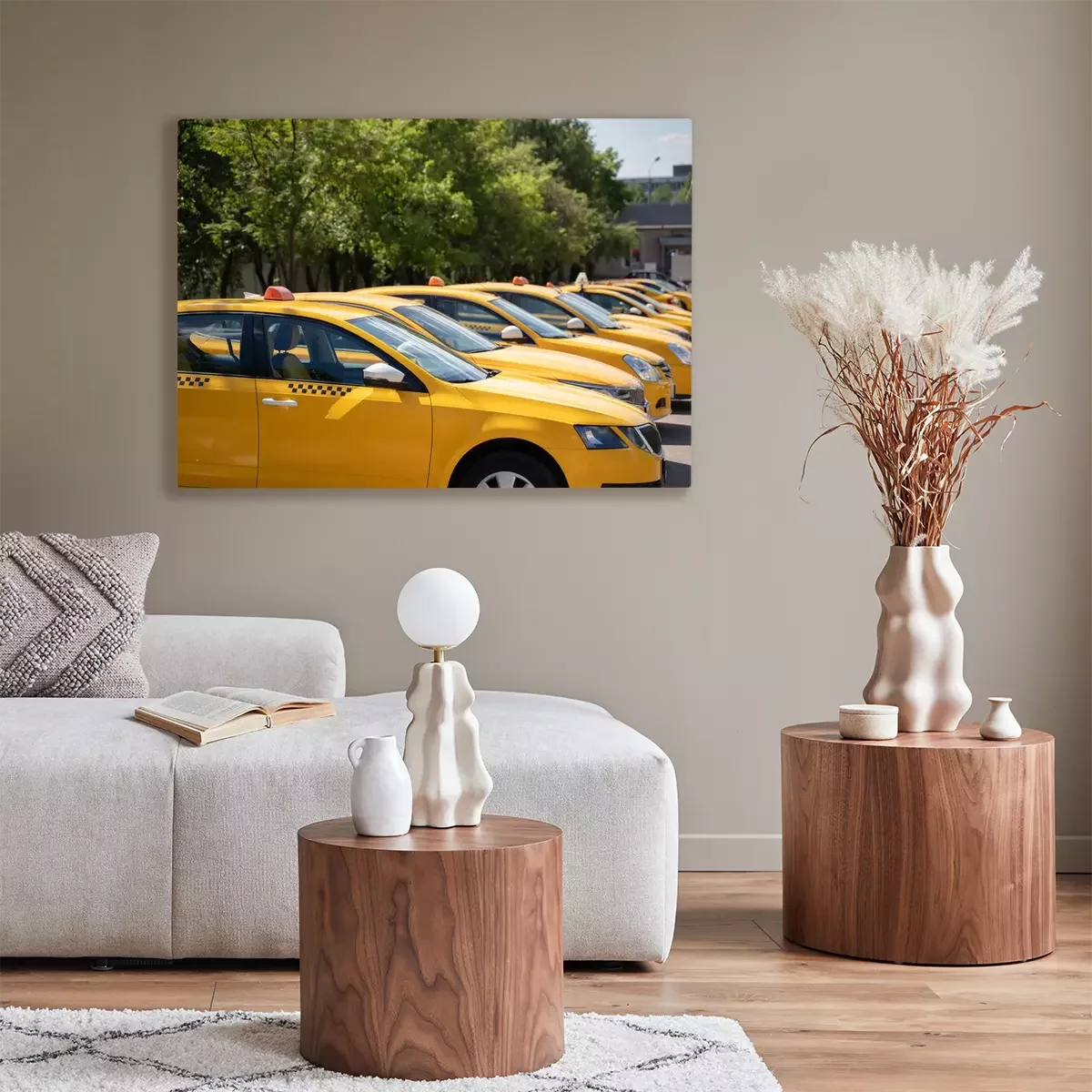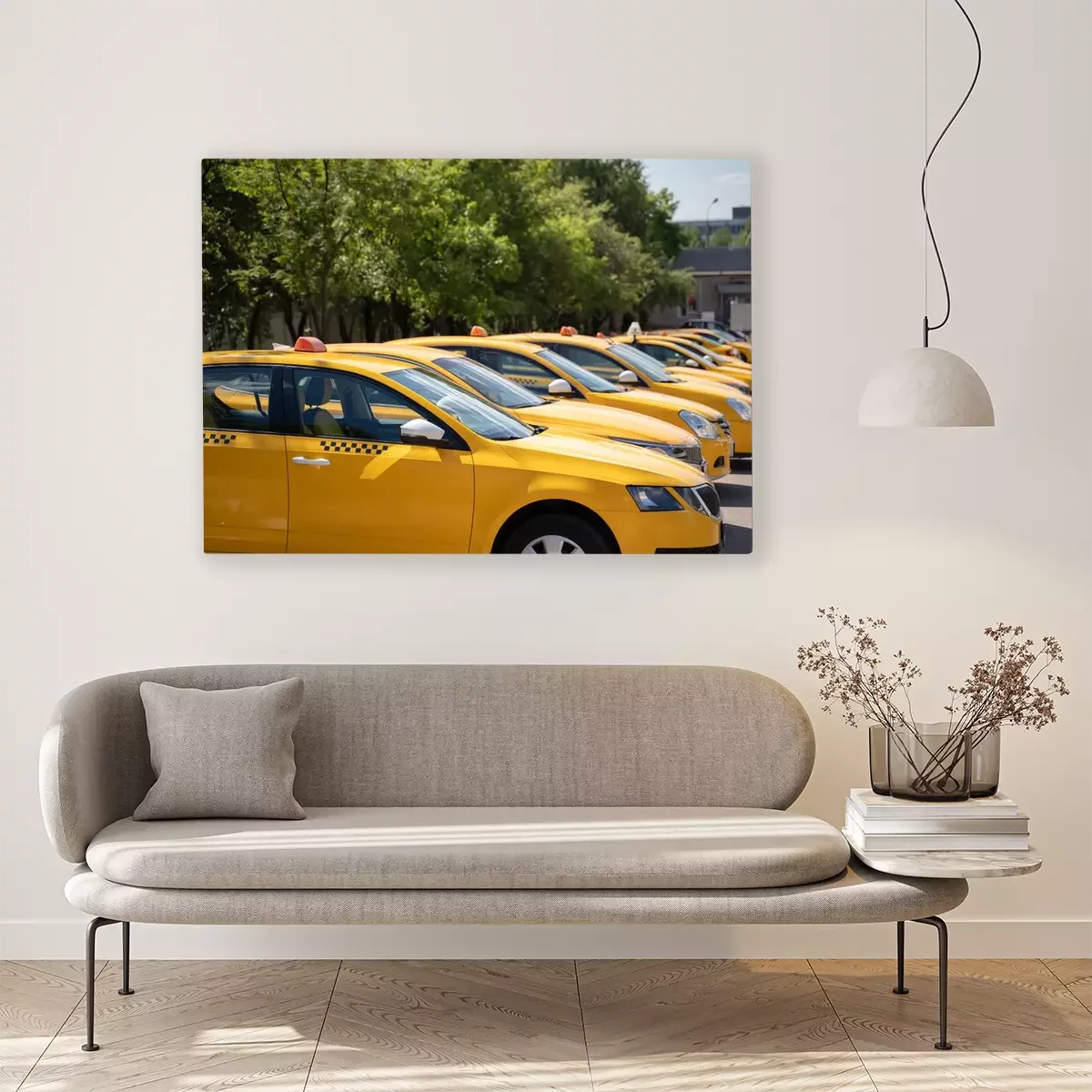Tableau  Photo of several yellow taxi on street in summer