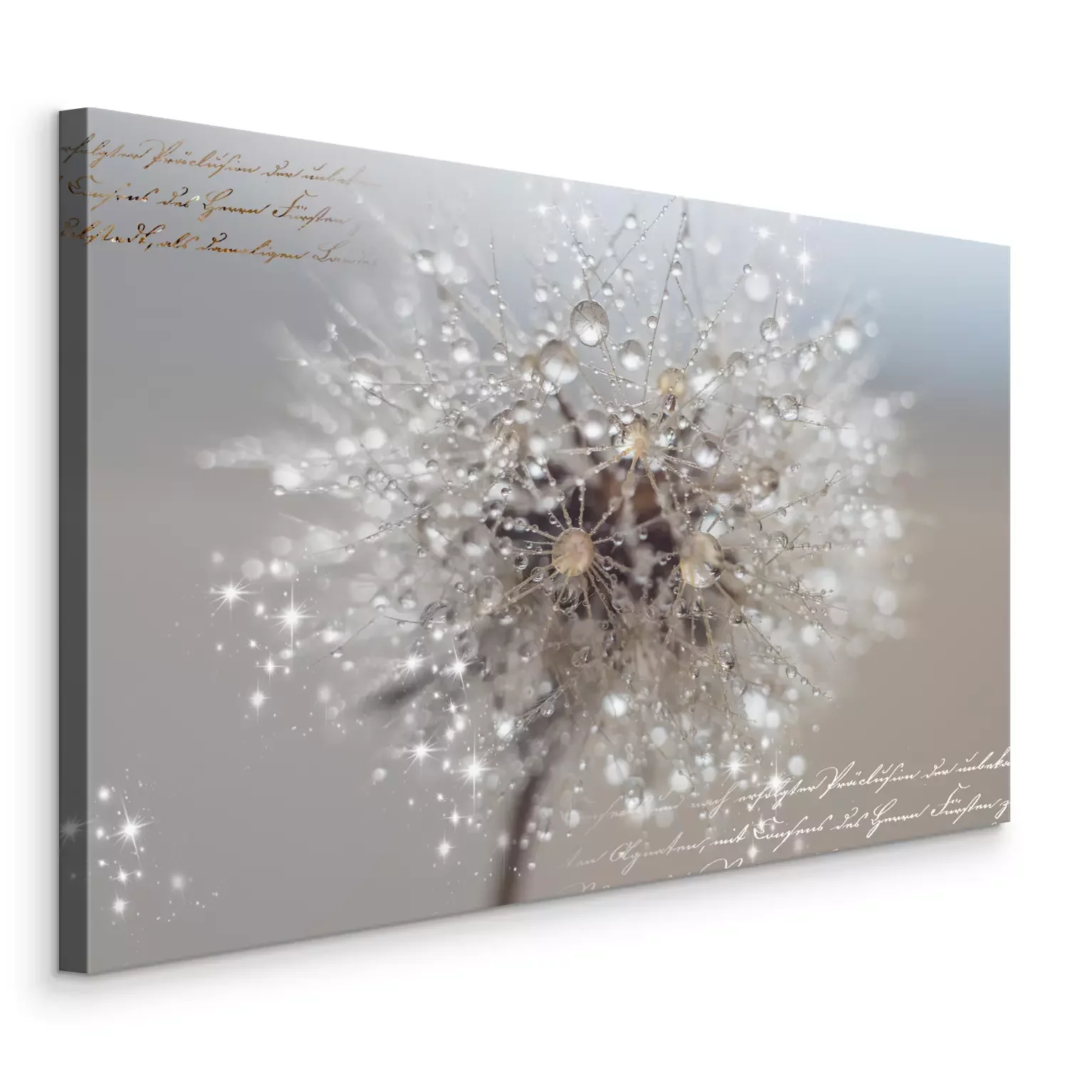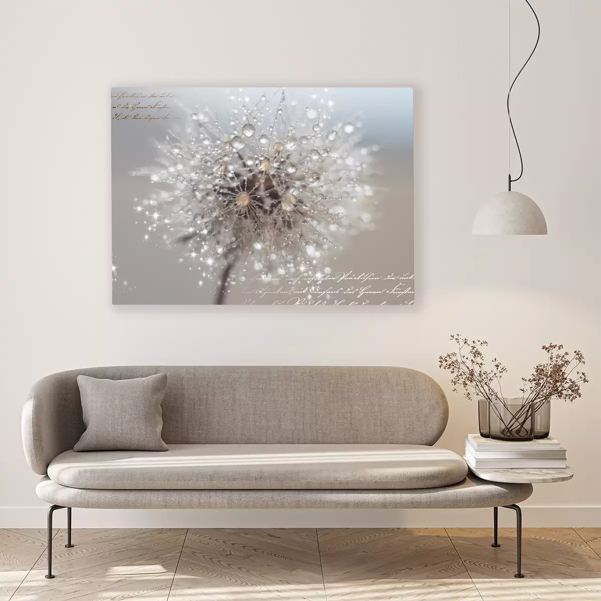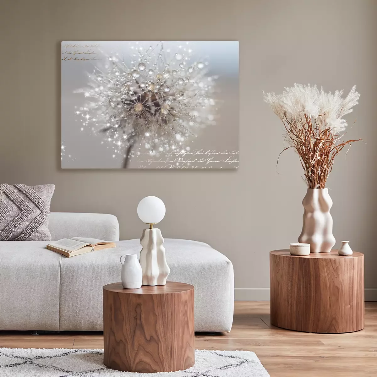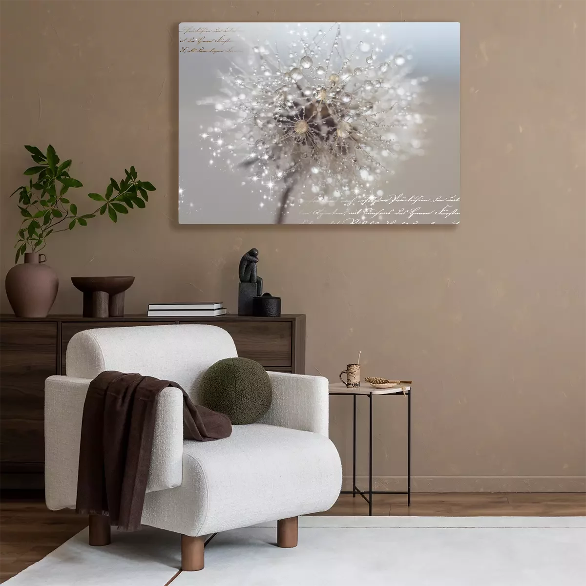 Photographie macro d'un pissenlit avec de la rosée et du texte