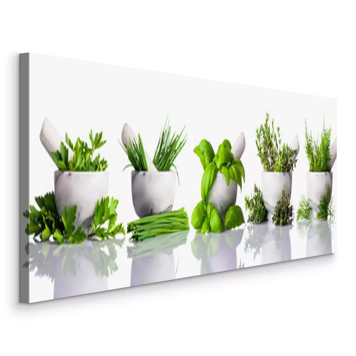 Tableau  Pilon, mortier, vert, herbes, blanc, fond