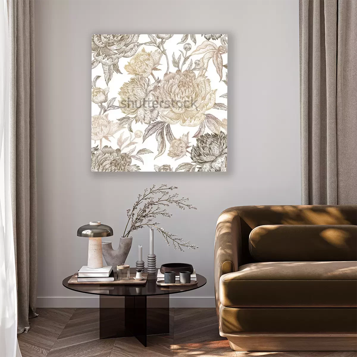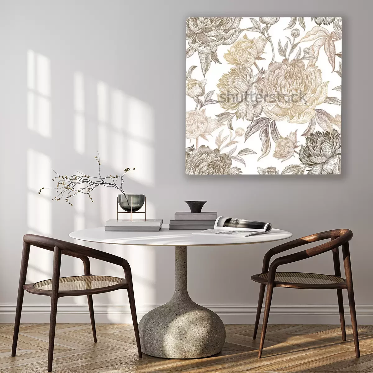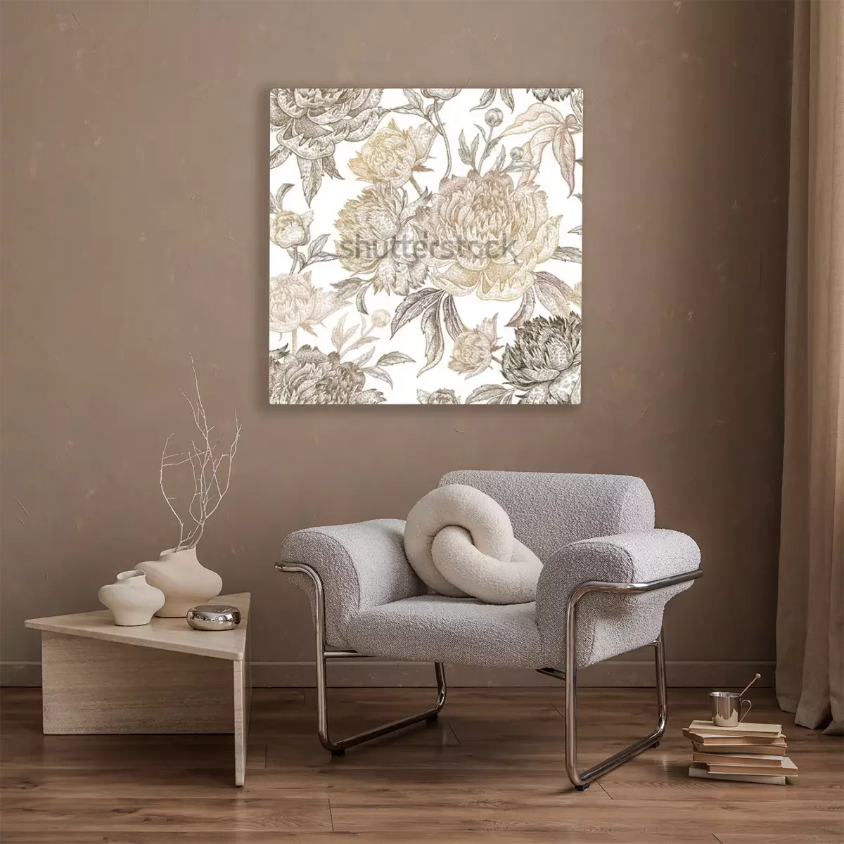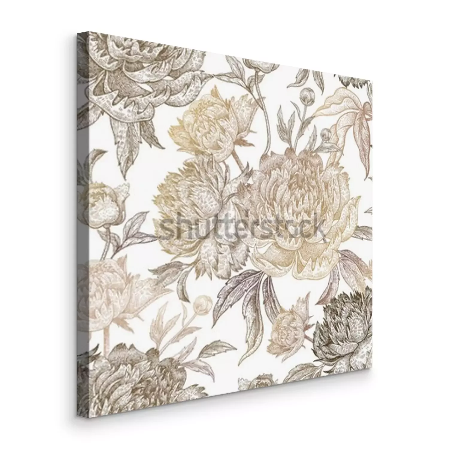 Tableau  Pivoines de fleurs Vintage, branches, feuilles. Imprimer une feuille d'or sur un fond blanc. Modèle sans couture. Illustration pour tissus, etui pour téléphone, papier, emballages cadeaux, textile