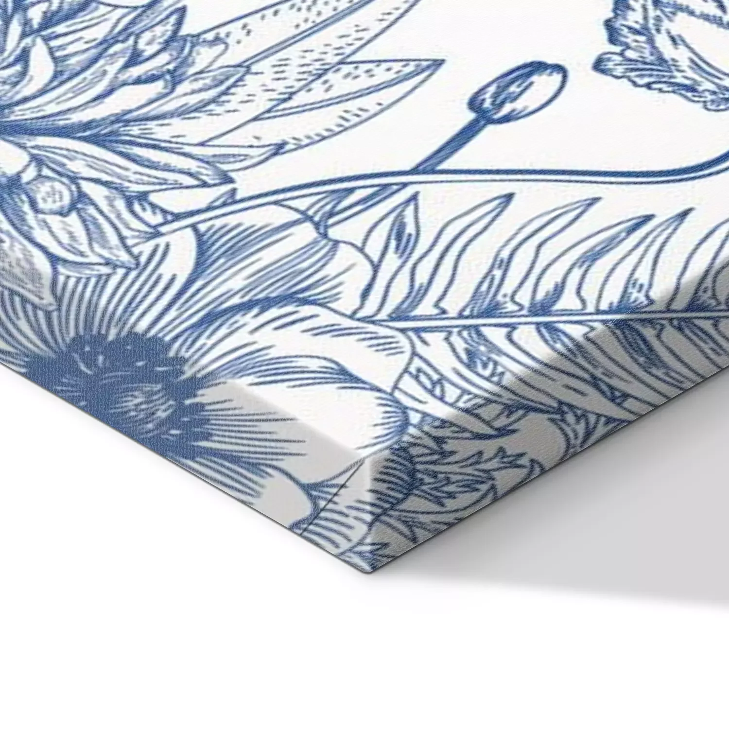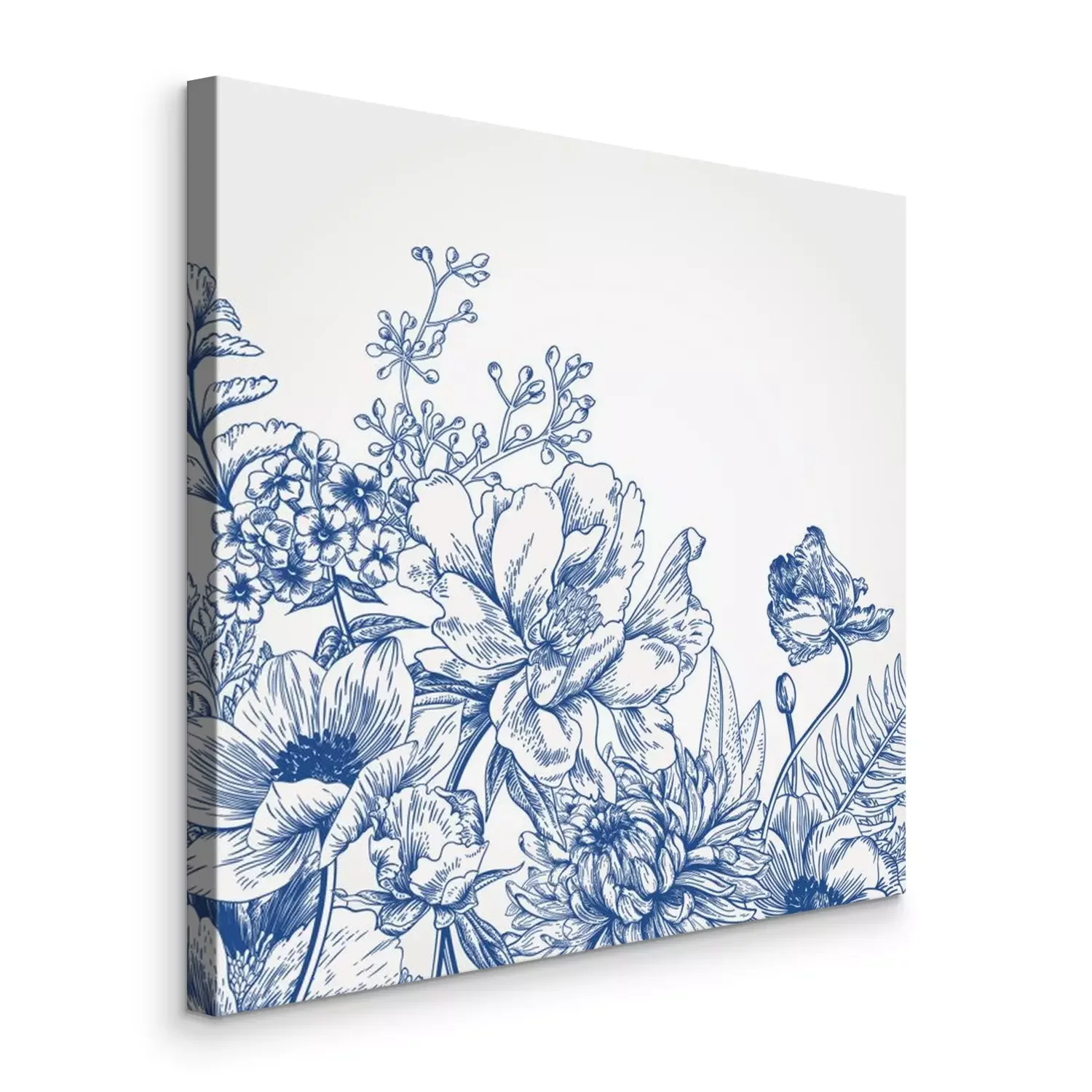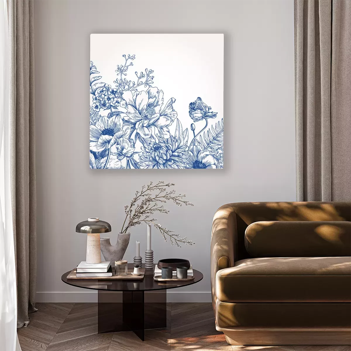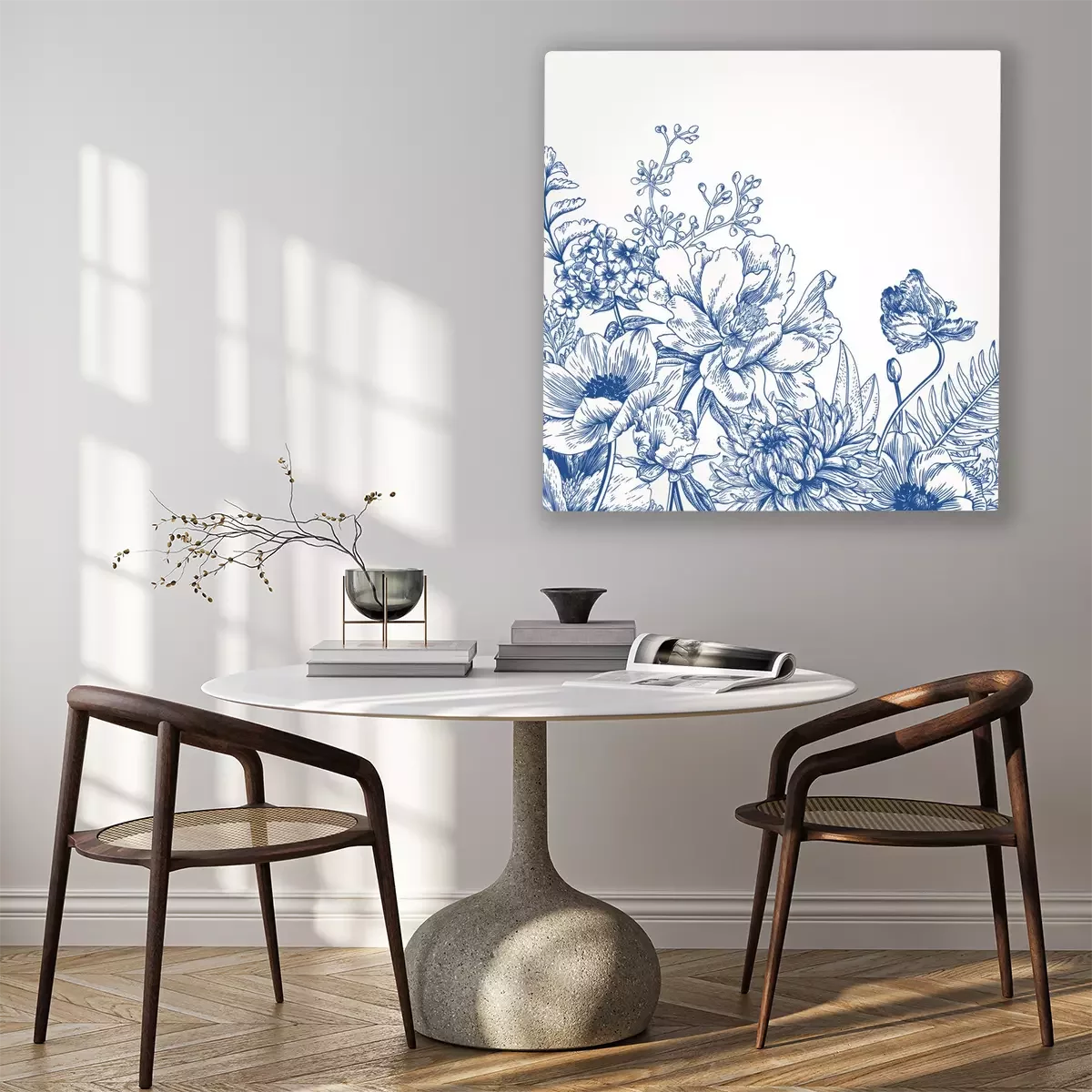 Tableau  Pivoines et plantes des champs dessinées avec une ligne bleue