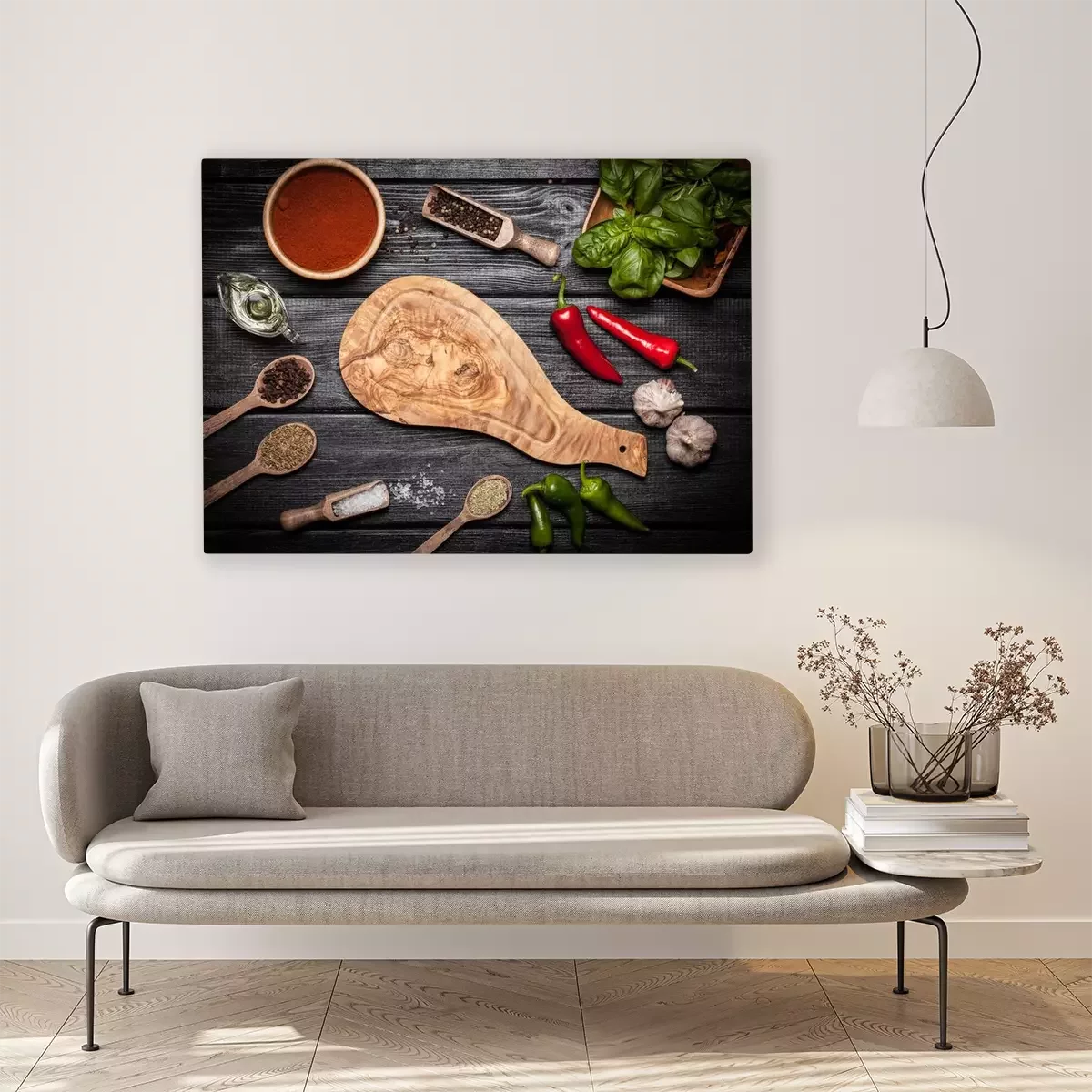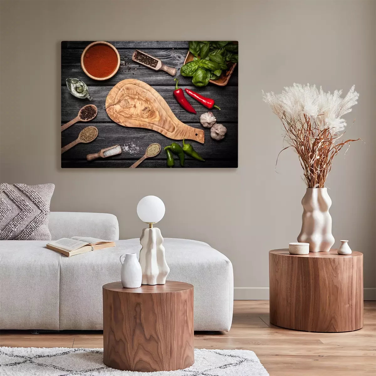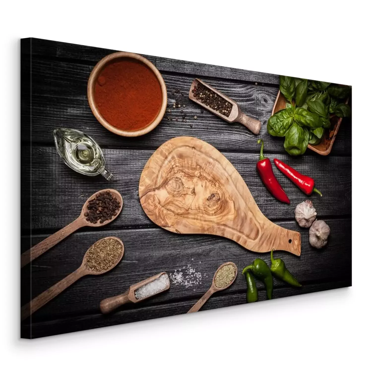 Tableau : Planche en bois d'Olice avec différentes épices