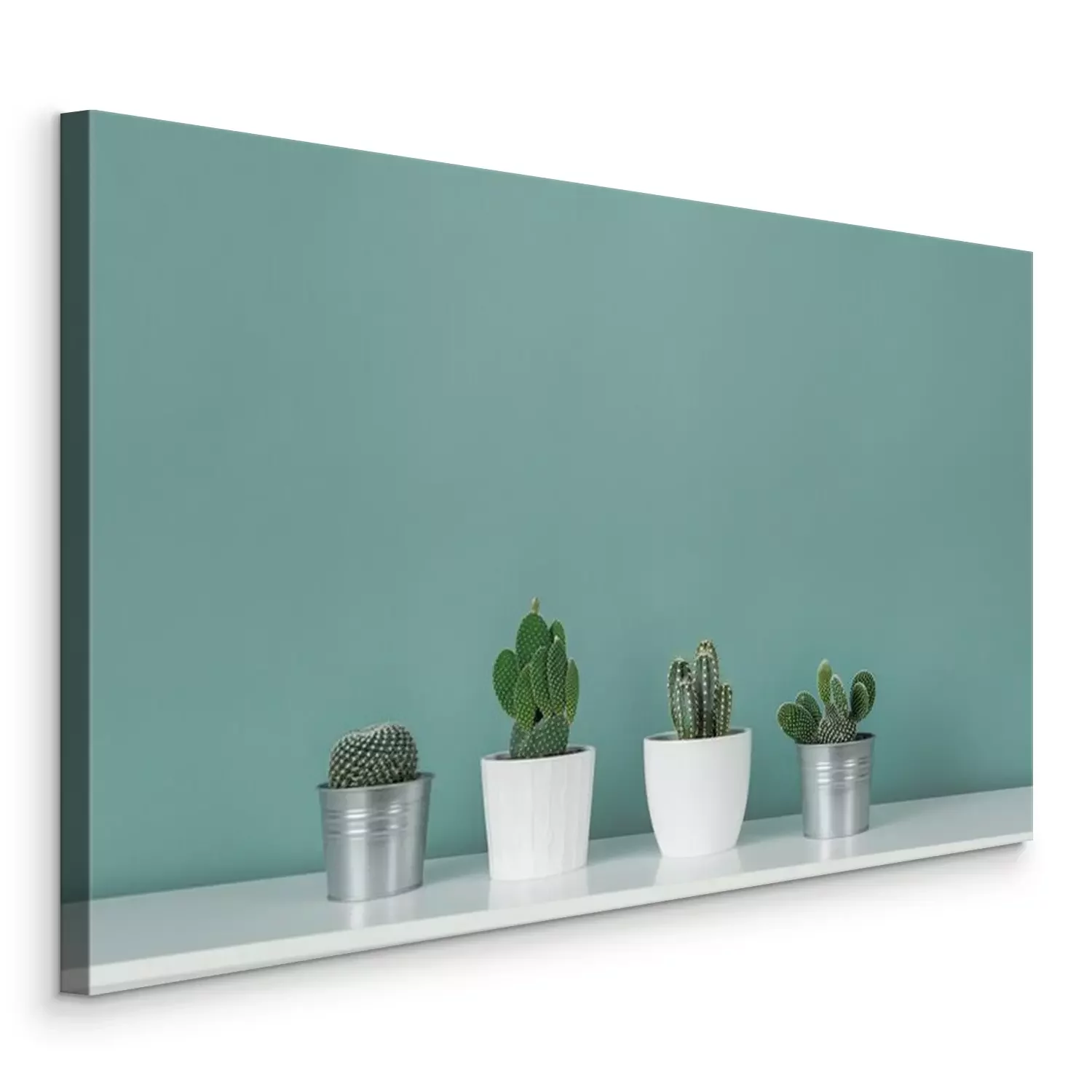 Décoration de la chambre moderne. Collection de diverses plantes de maison de cactus en pot sur une étagère blanche contre un mur de couleur turquoise pastel. Bannière de plantes de cactus.