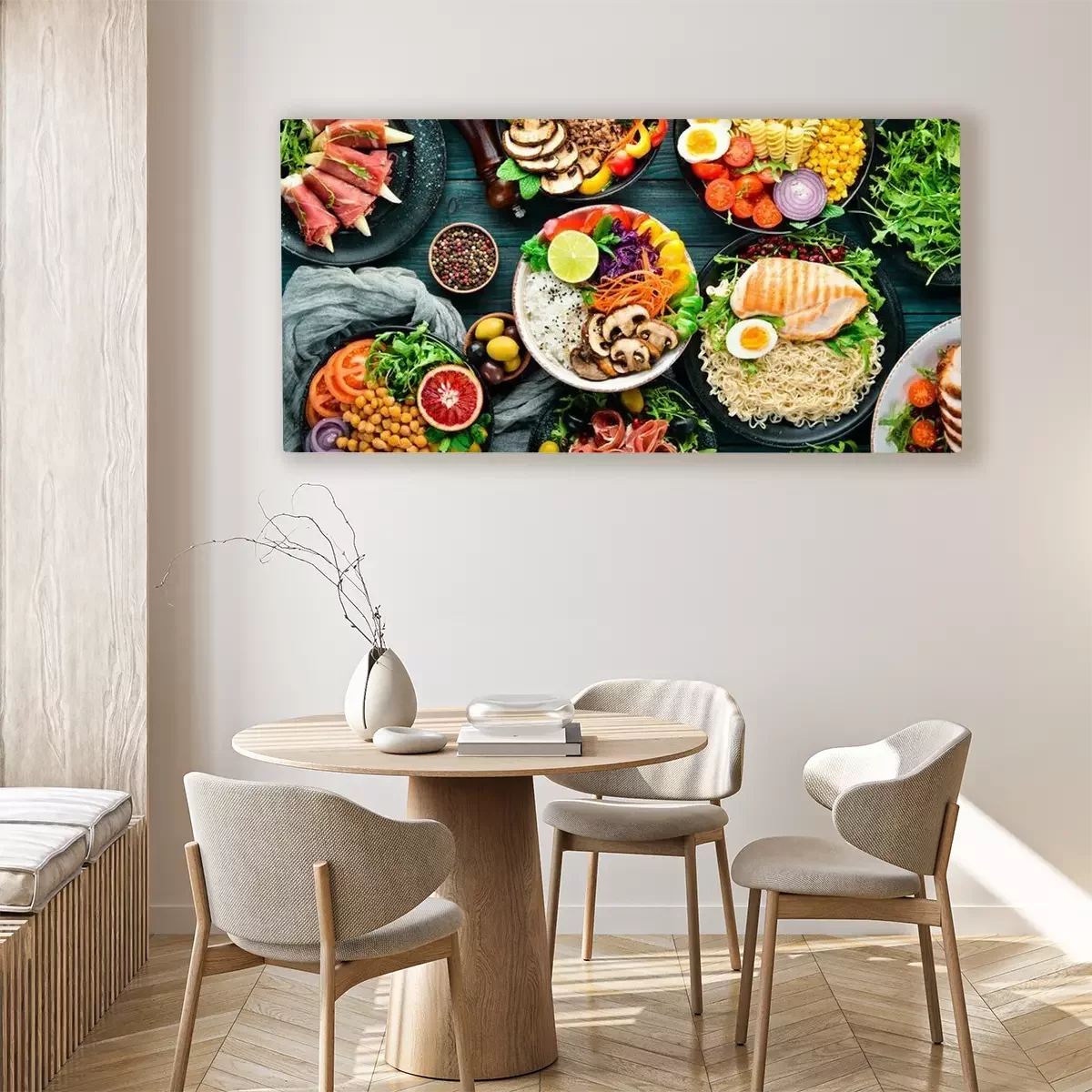 Tableau : Plats sains sur une table en bois