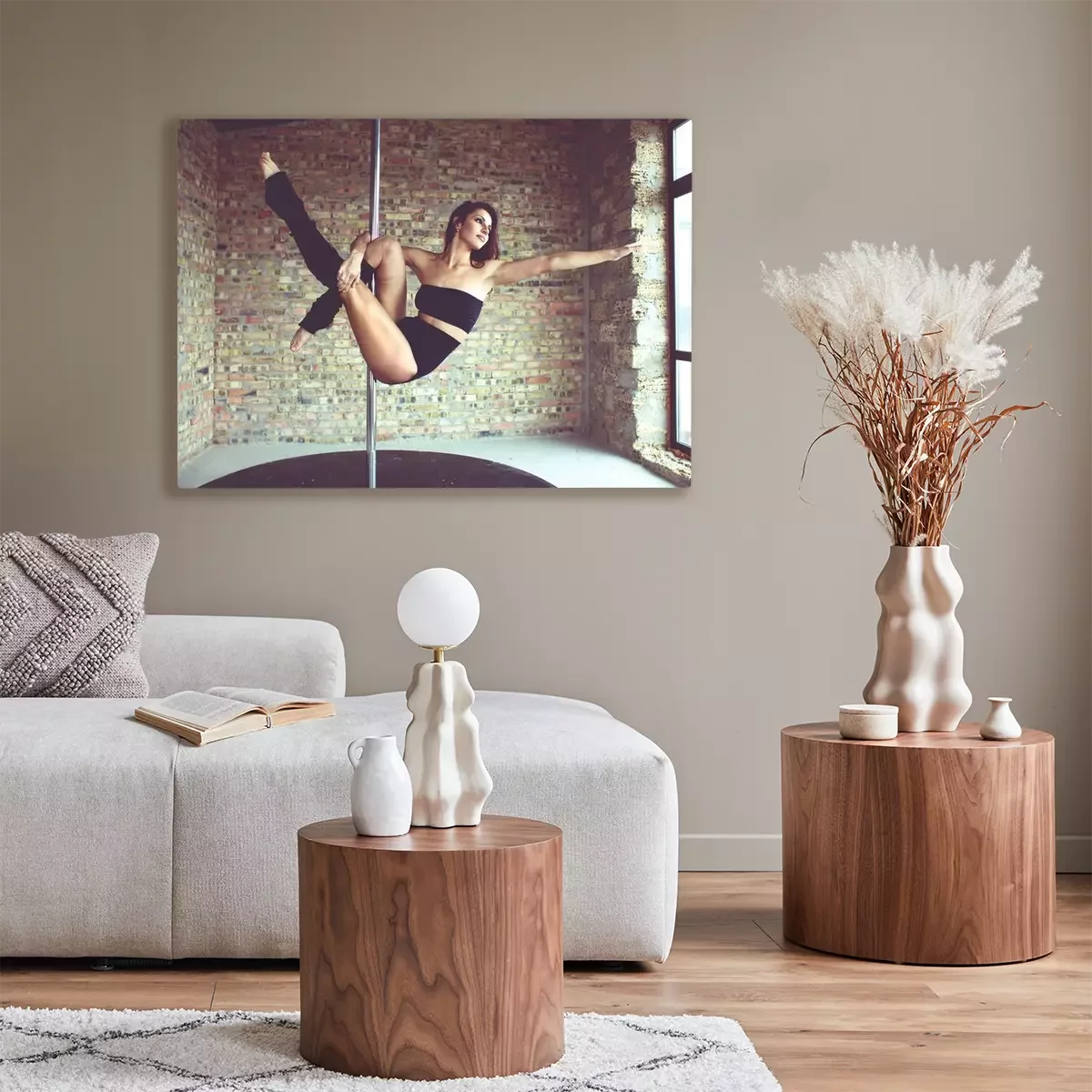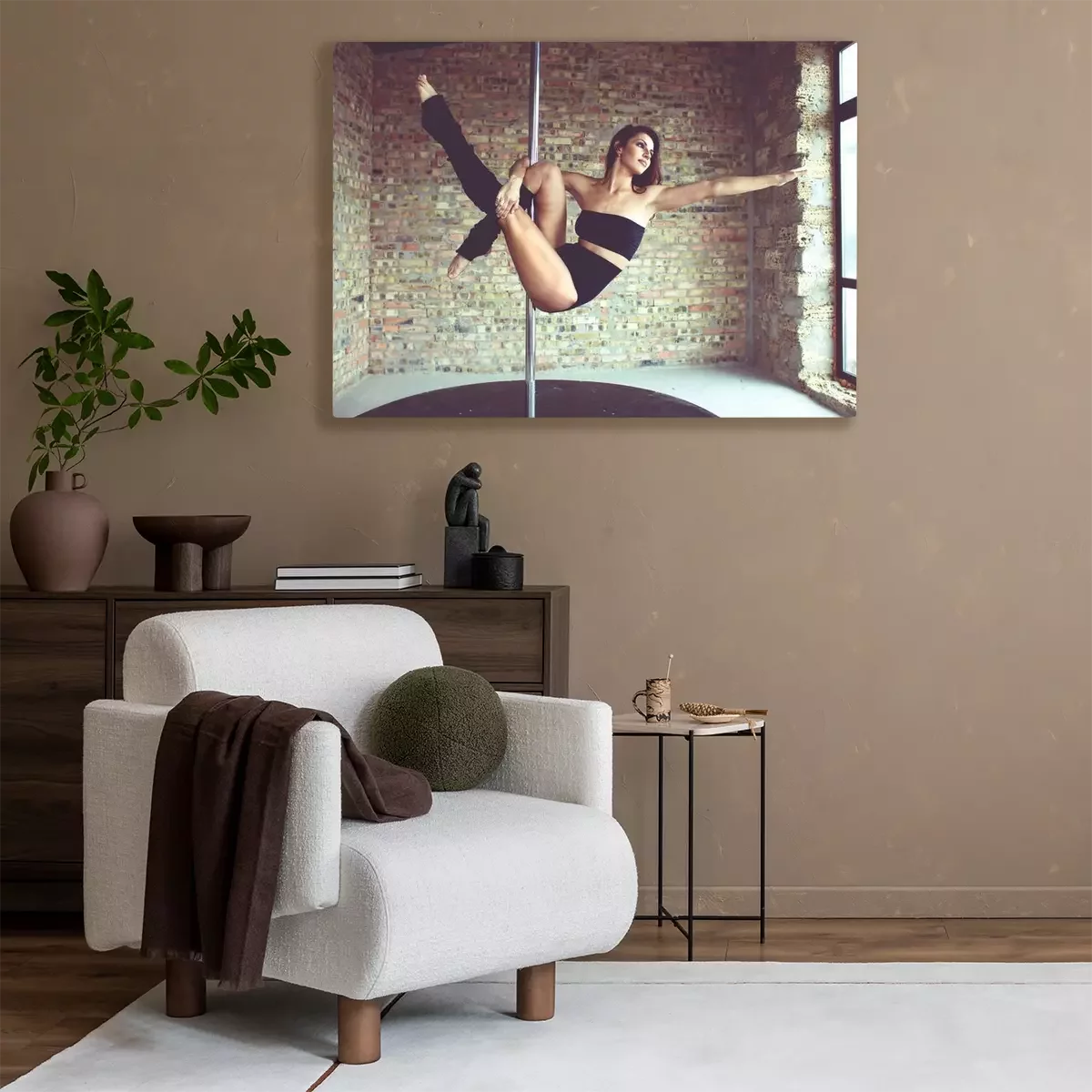 Tableau : Pole dance et mur de briques en arrière-plan