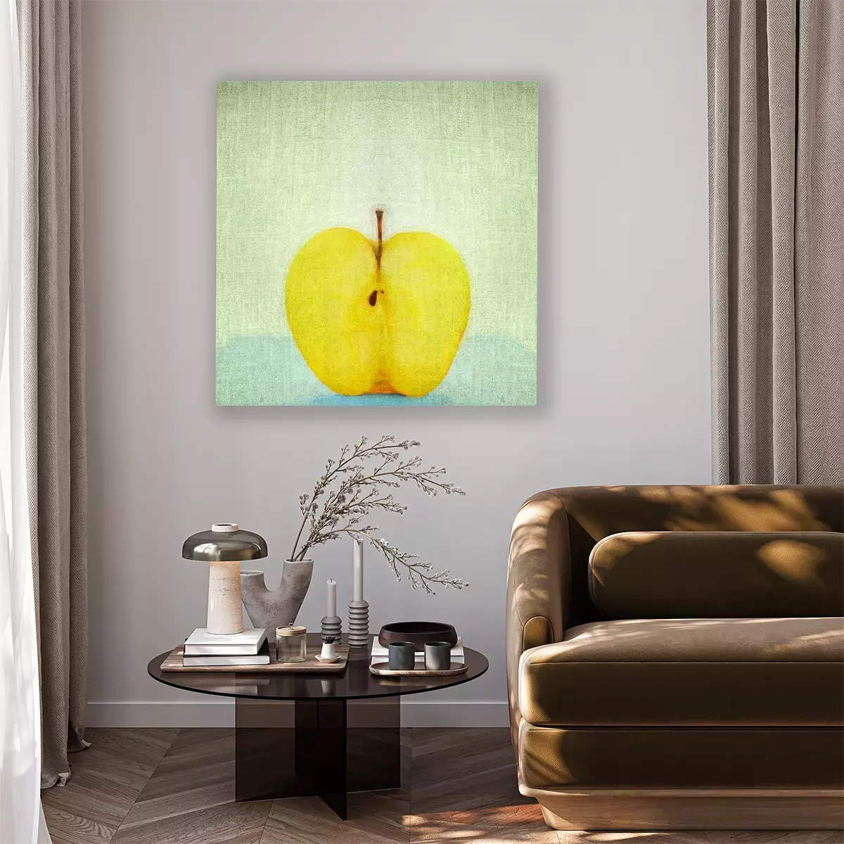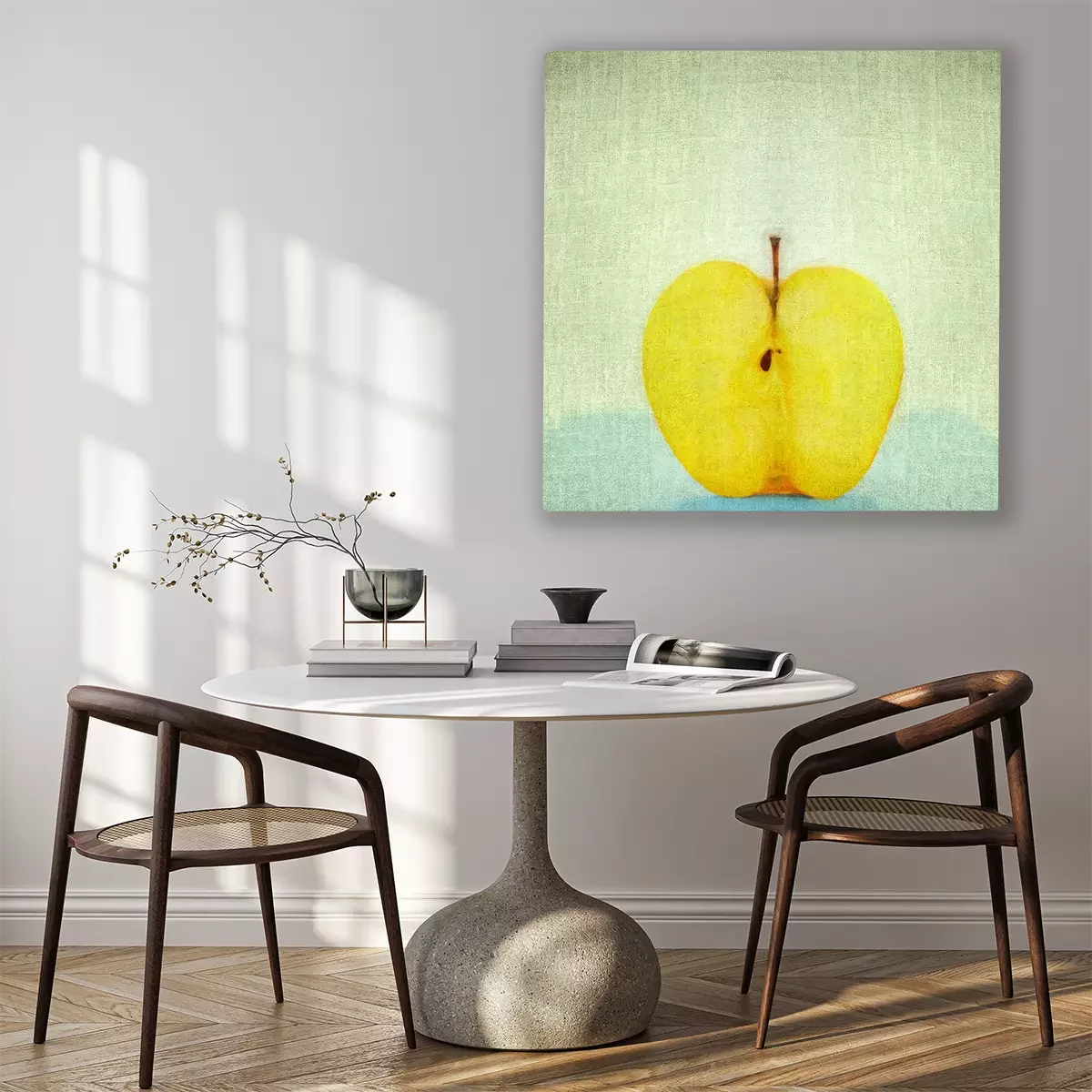 Une Image nature morte correspond à l'une des thématiques les plus populaires dans l’univers de l’art. Ce motif représentant un fruit vous fera profiter d’une décoration à la fois élégante et intemporelle. Notre proposition se caractérise par un style minimaliste idéal pour parfaire des décorations d’intérieur modernes et épurées et bien d’autres encore. Cette image pomme fait immédiatement penser à une peinture à l'huile. Si vous regardez de près, vous pourrez voir que l'impression imite à merveille la texture caractéristique d’une toile de tableau. Voilà aussi ce qui donne à ce motif un véritable aspect artistique. Sa palette de couleurs, basée sur une gamme limitée possède un caractère moderne. Les natures mortes anciennes cherchaient à préserver l'effet 3D, tandis que les compositions contemporaines utilisent beaucoup plus souvent des taches de couleur, comme le montre parfaitement l’image pomme que nous avons sélectionnée. Ainsi, cette proposition décorative originale et universelle pourra aussi bien être utilisée pour parfaire une décoration moderne qu’une ambiance d’intérieur traditionnelle. Ce motif constitue également une solution idéale pour embellir une salle à manger de style rétro. Dans une pièce destinée à partager des repas, cette image nature morte avec des fruits animera la décoration tout en restant discrète. Vous pourrez également profiter de ce modèle dans une cuisine moderne et minimaliste avec des meubles en bois de couleur naturelle. Dans un tel intérieur, notre image pomme attirera le regard, ce qui donnera du caractère à la pièce. Votre image ne doit pas nécessairement être accrochée au mur. Elle peut être posée sur une étagère à épices ou sur le plan de travail de la cuisine juste à côté d'un plateau de fruits. Le côté original de cette proposition en fait également une excellente proposition pour le salon, qu'il soit moderne ou vintage. Comment mettre en valeur une telle image nature morte ? Placée au-dessus d'une commode ou d'une armoire vitrée contenant de la porcelaine, elle sera tout simplement magnifique. Puisqu’il s'agit d'un motif qui ne se démode jamais, vous pourrez compter sur le potentiel de cet accent décoratif pendant de nombreuses années.