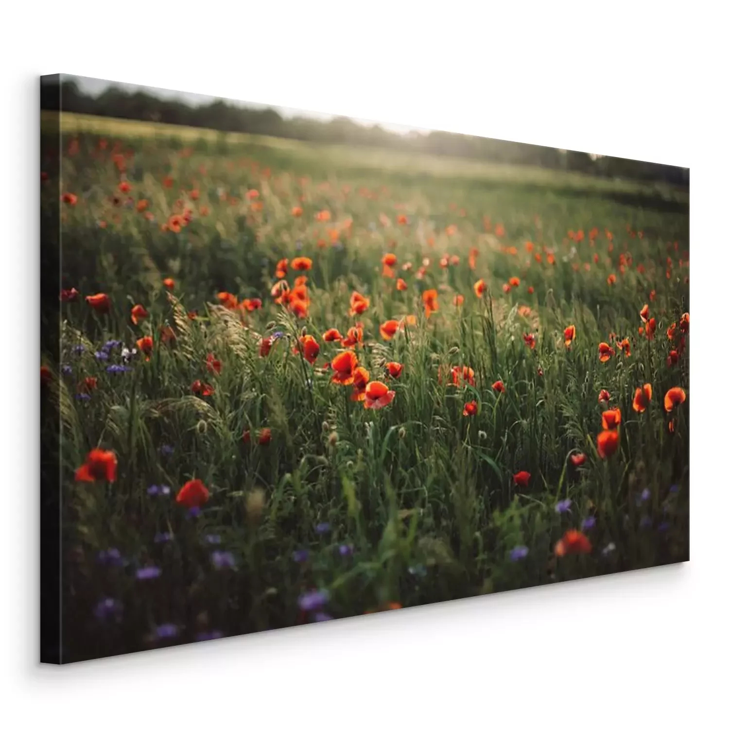 Tableau  Poppy and cornflowers in sunset light in summer meadow. Atmospheric beautiful moment. Copy space. Wildflowers in warm light, flowers in countryside. Rural simple life