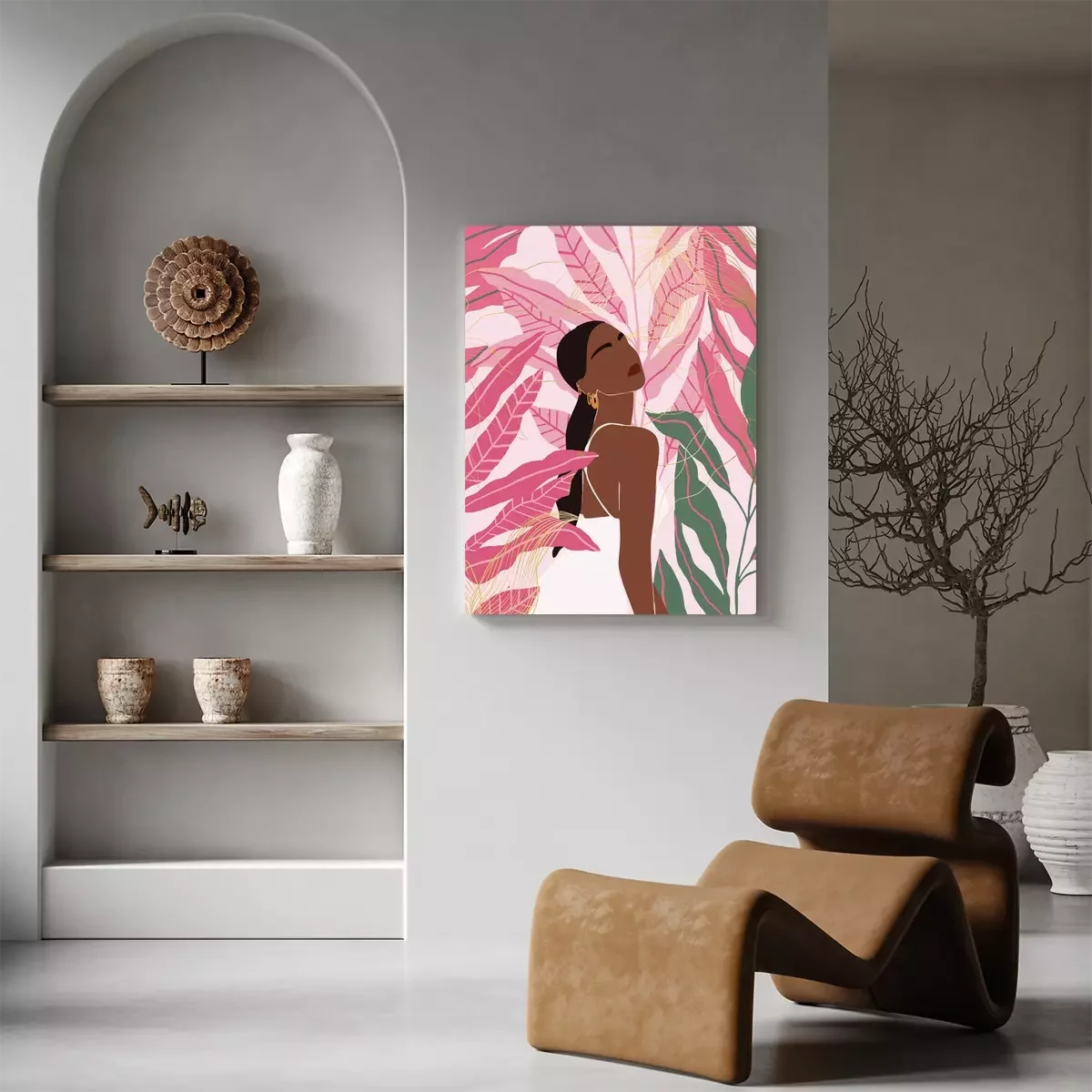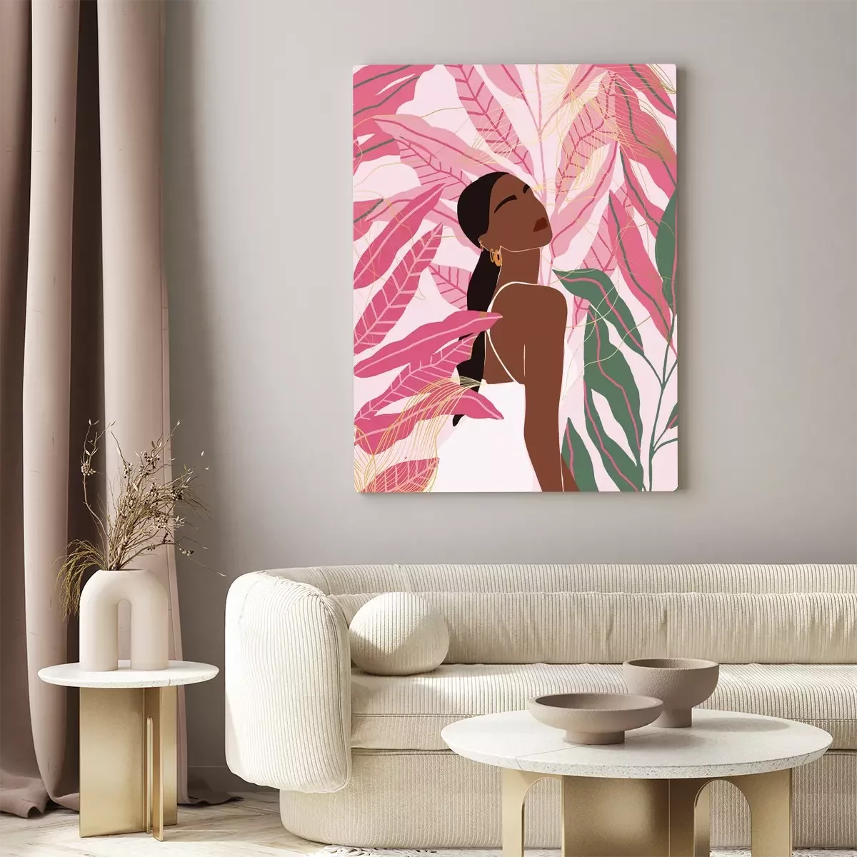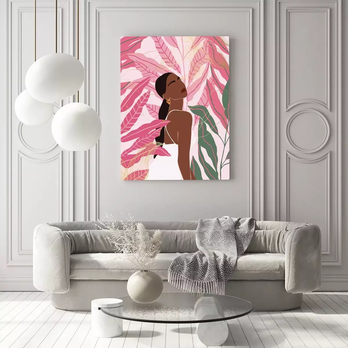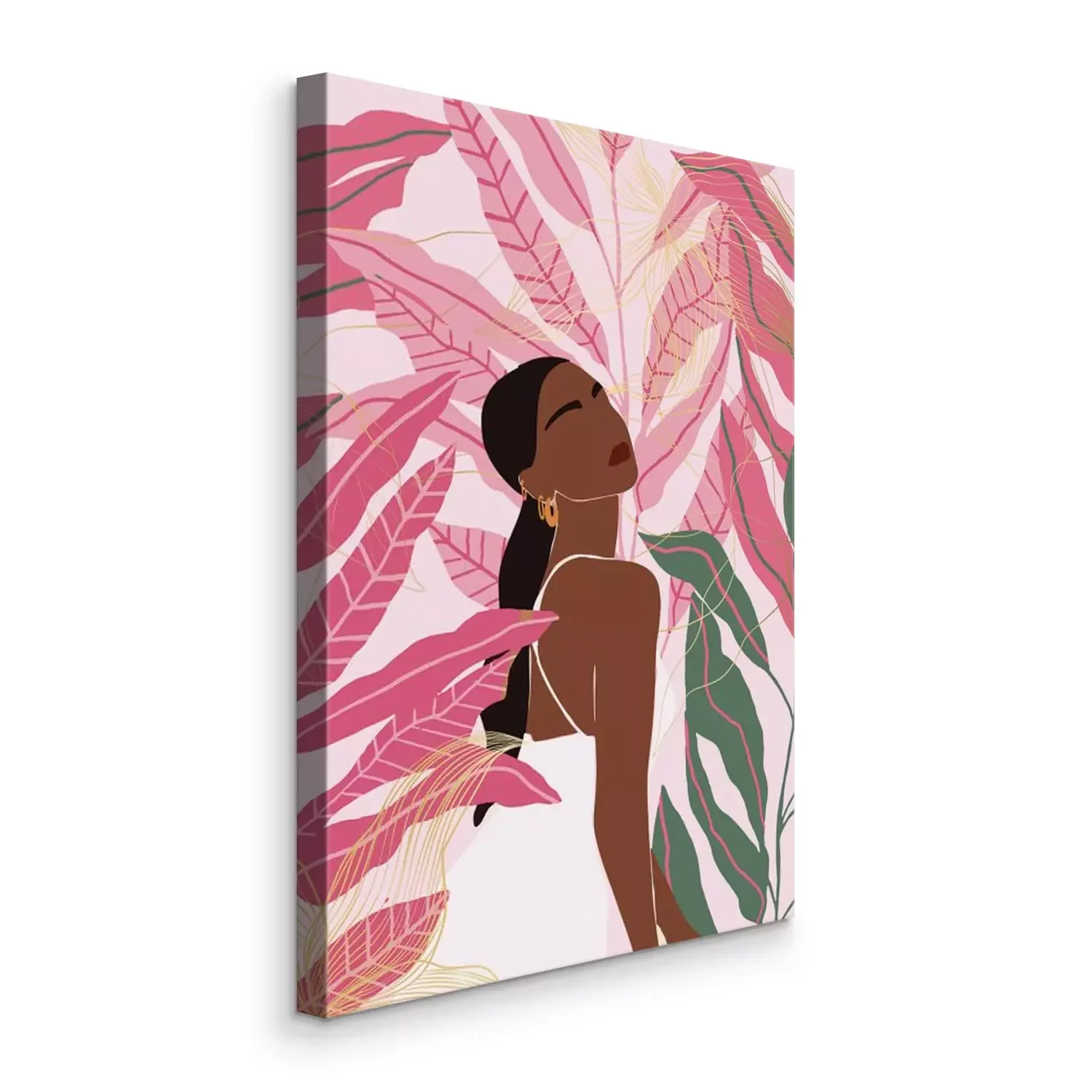 Portrait d'une femme en robe blanche avec des feuilles roses en arrière-plan