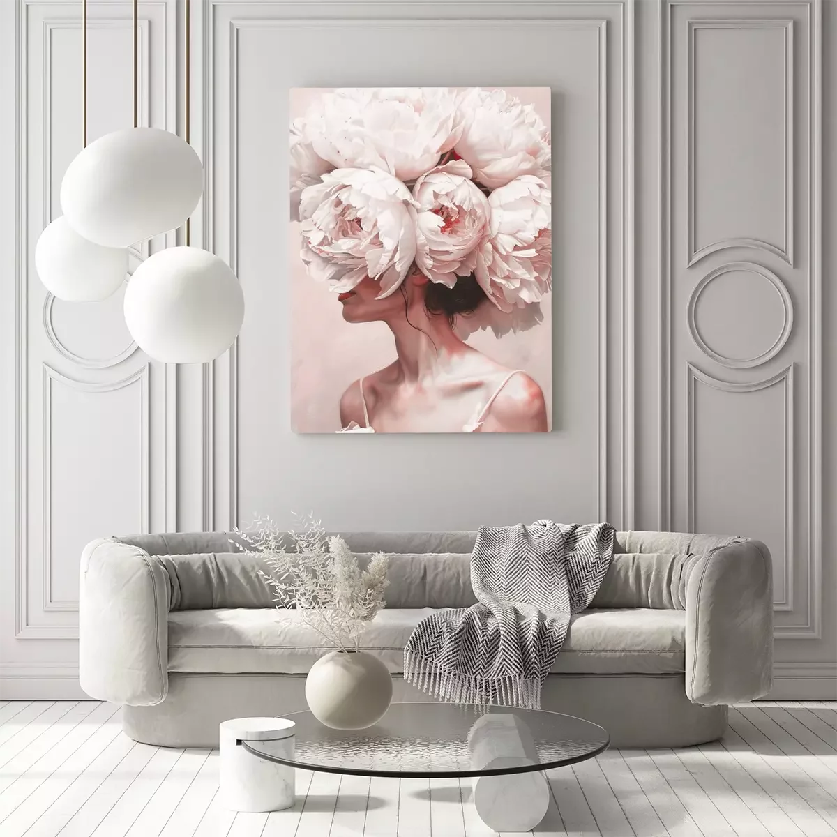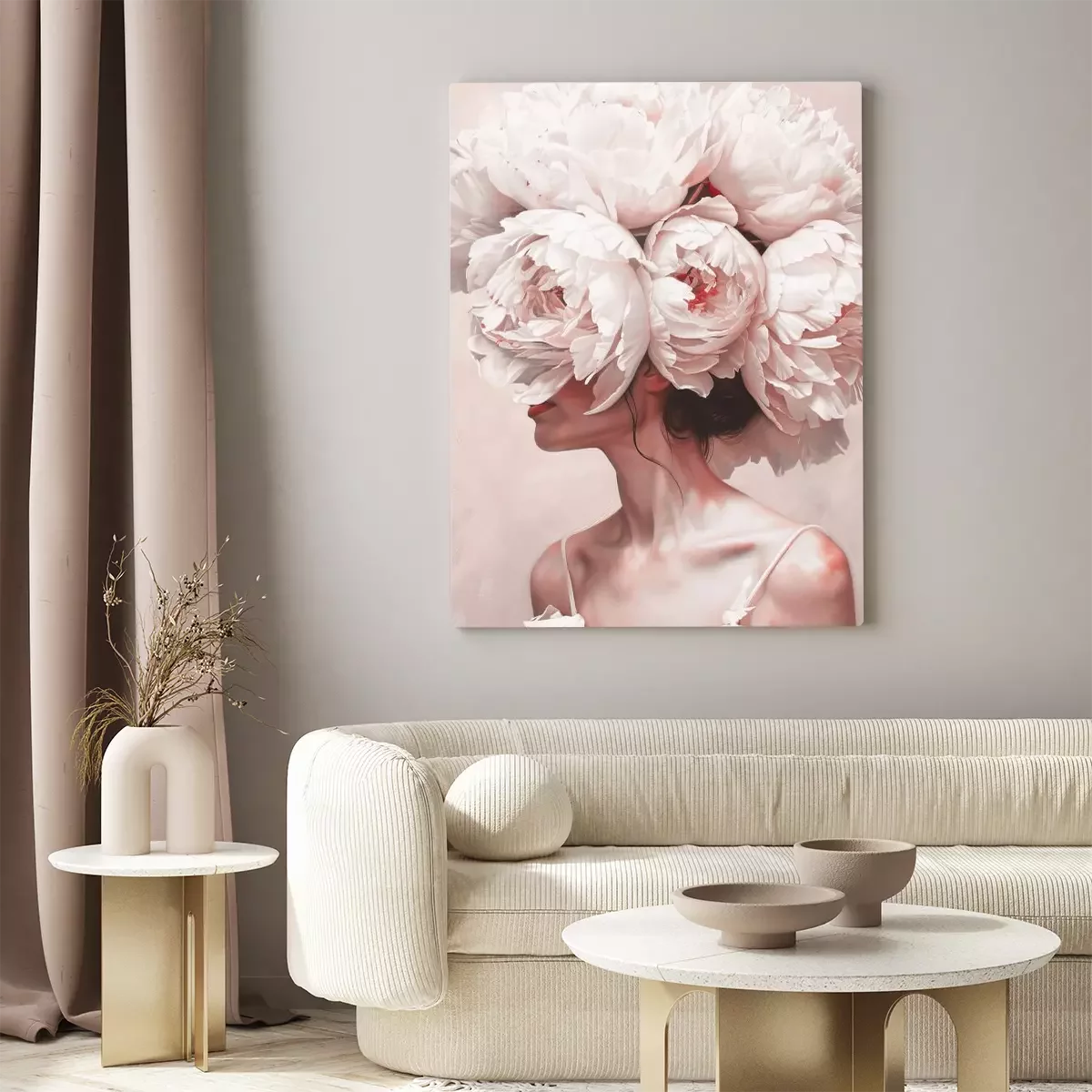 Portrait d'une femme portant une couronne de pivoines sur la tête