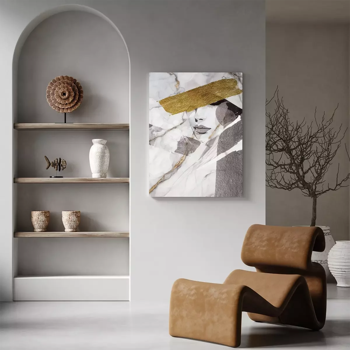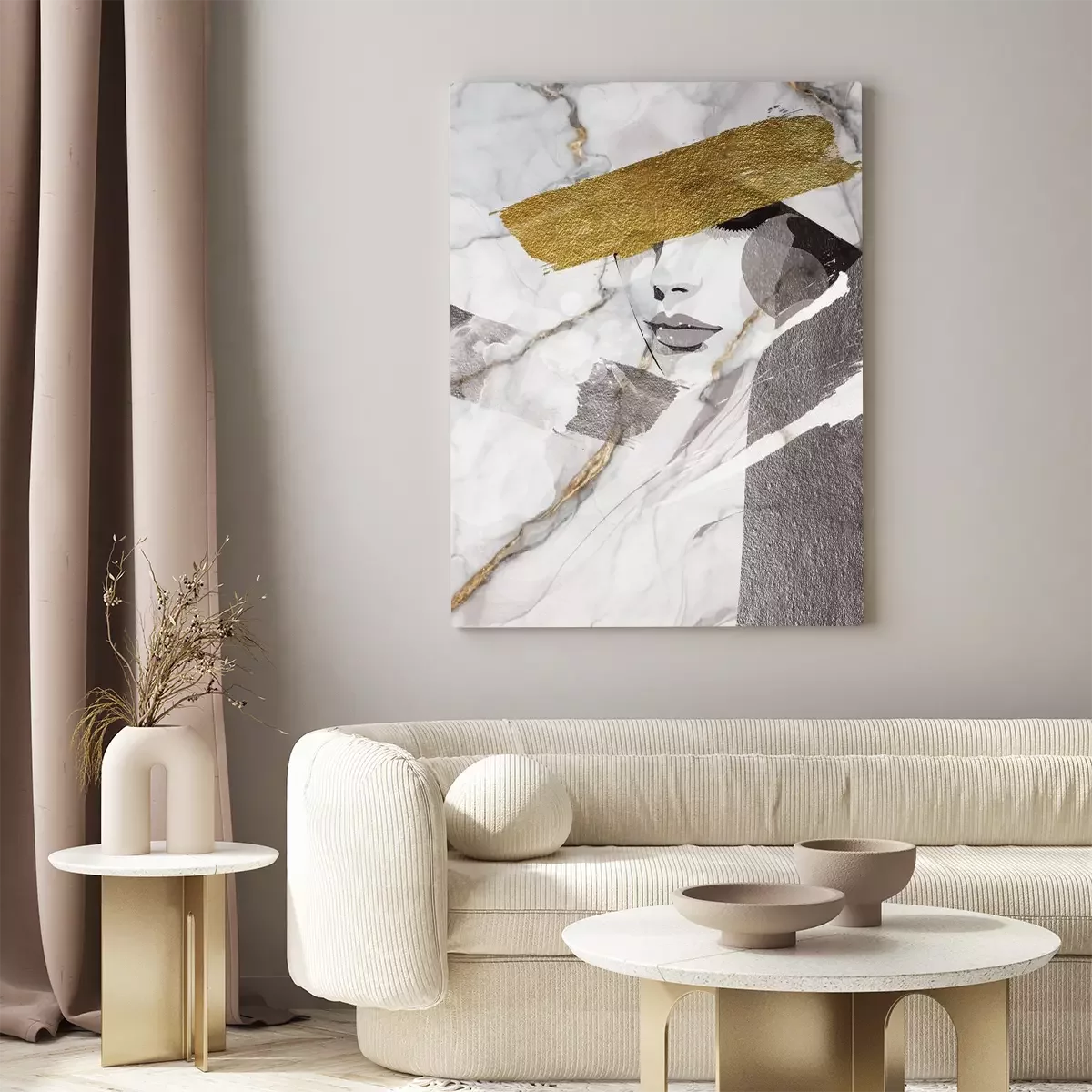 Portrait d'une femme sur fond de marbre avec des accents dorés
