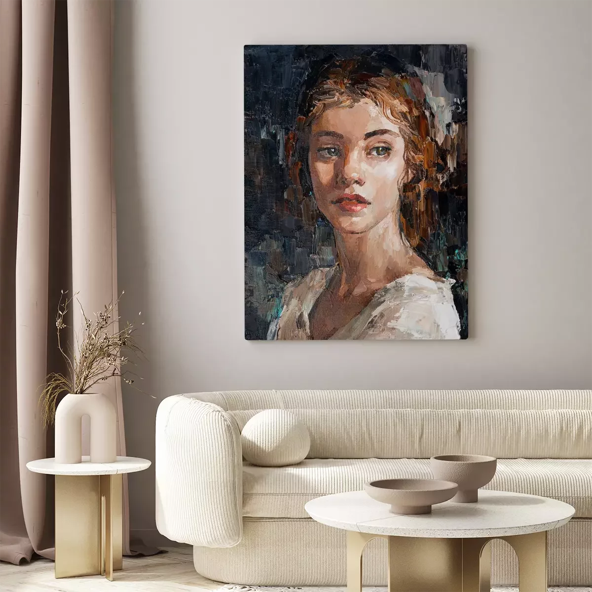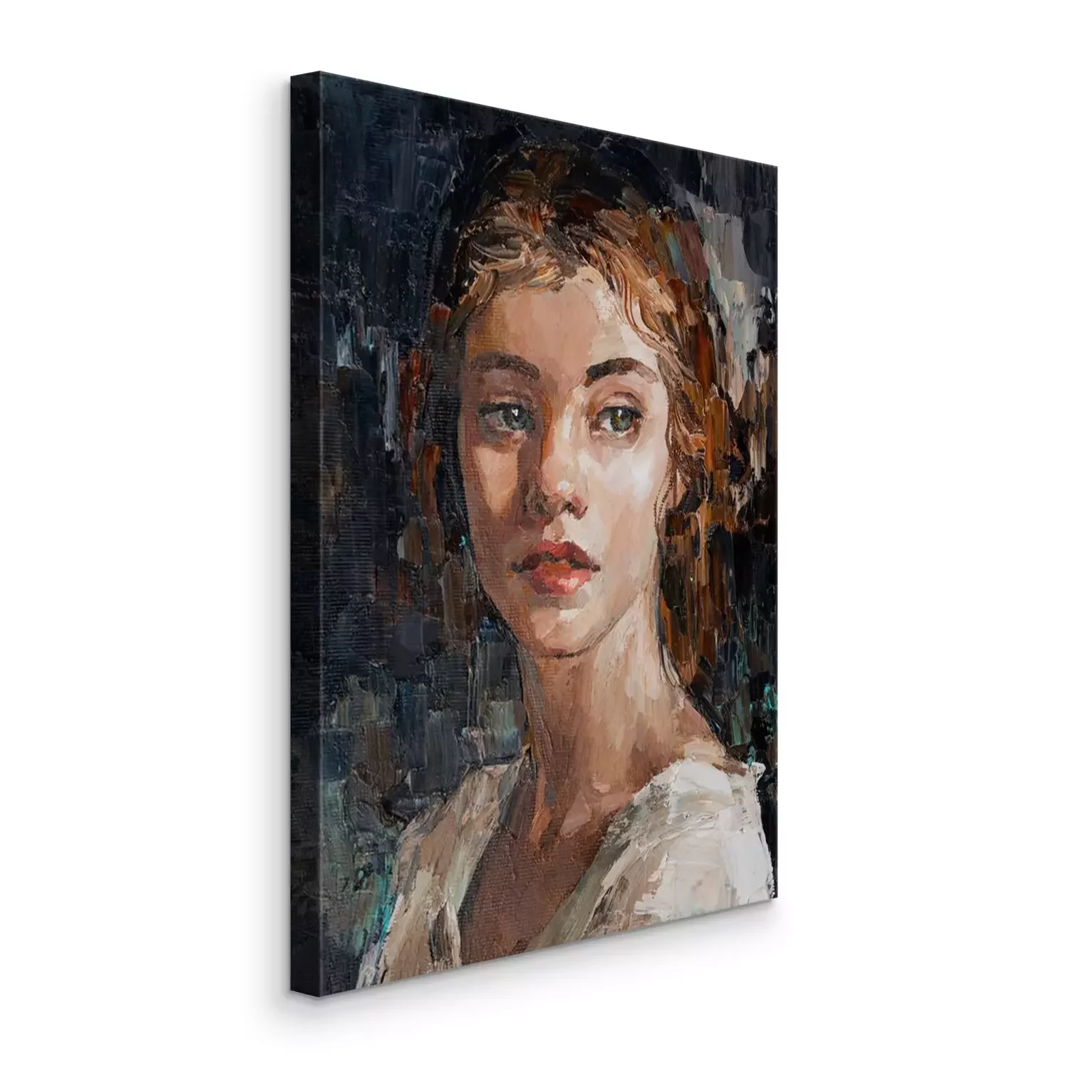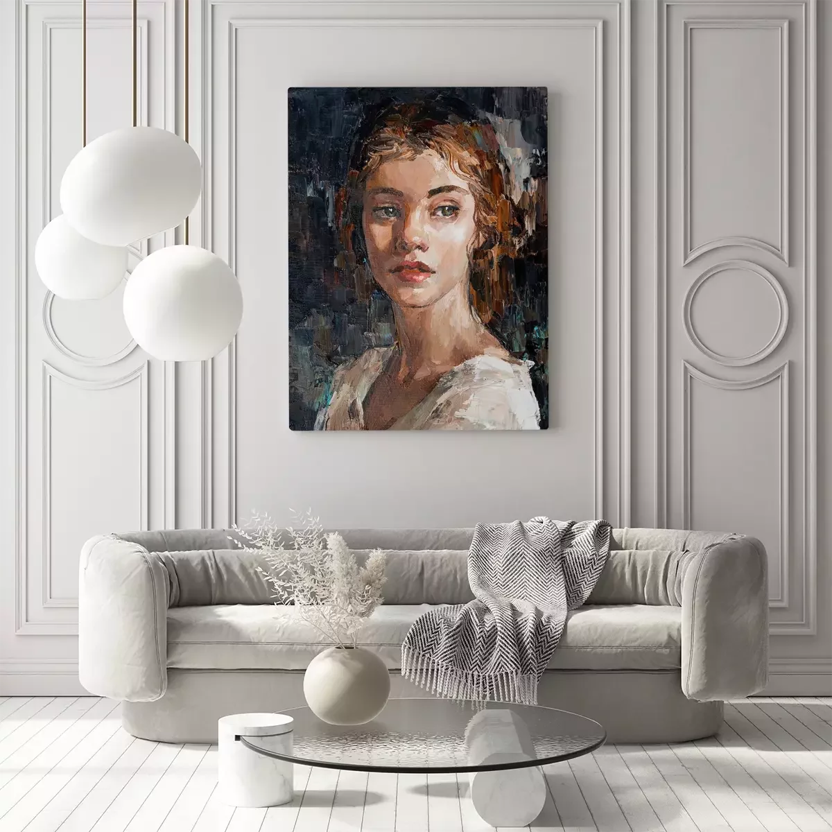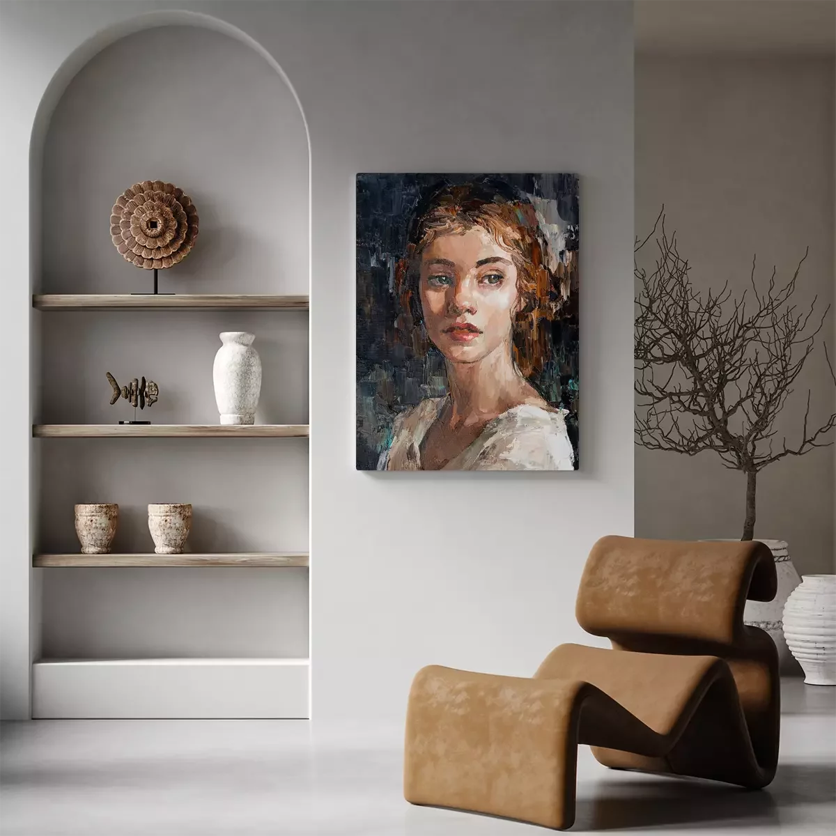 Portrait of a young, dreamy girl with curly brown hair. Oil painting on canvas.
