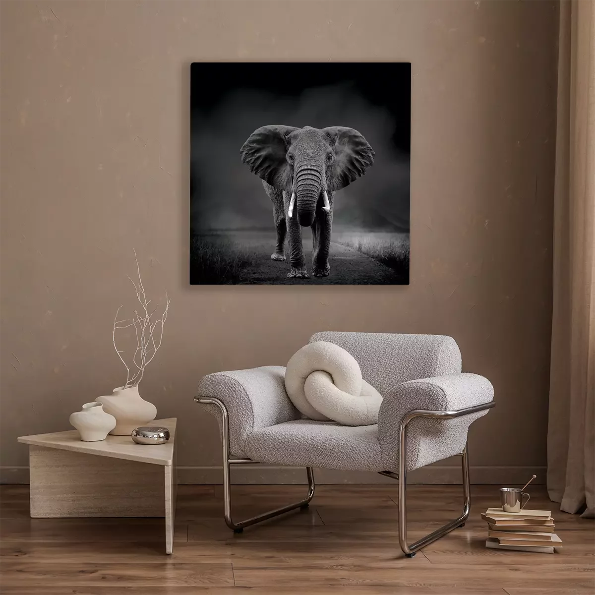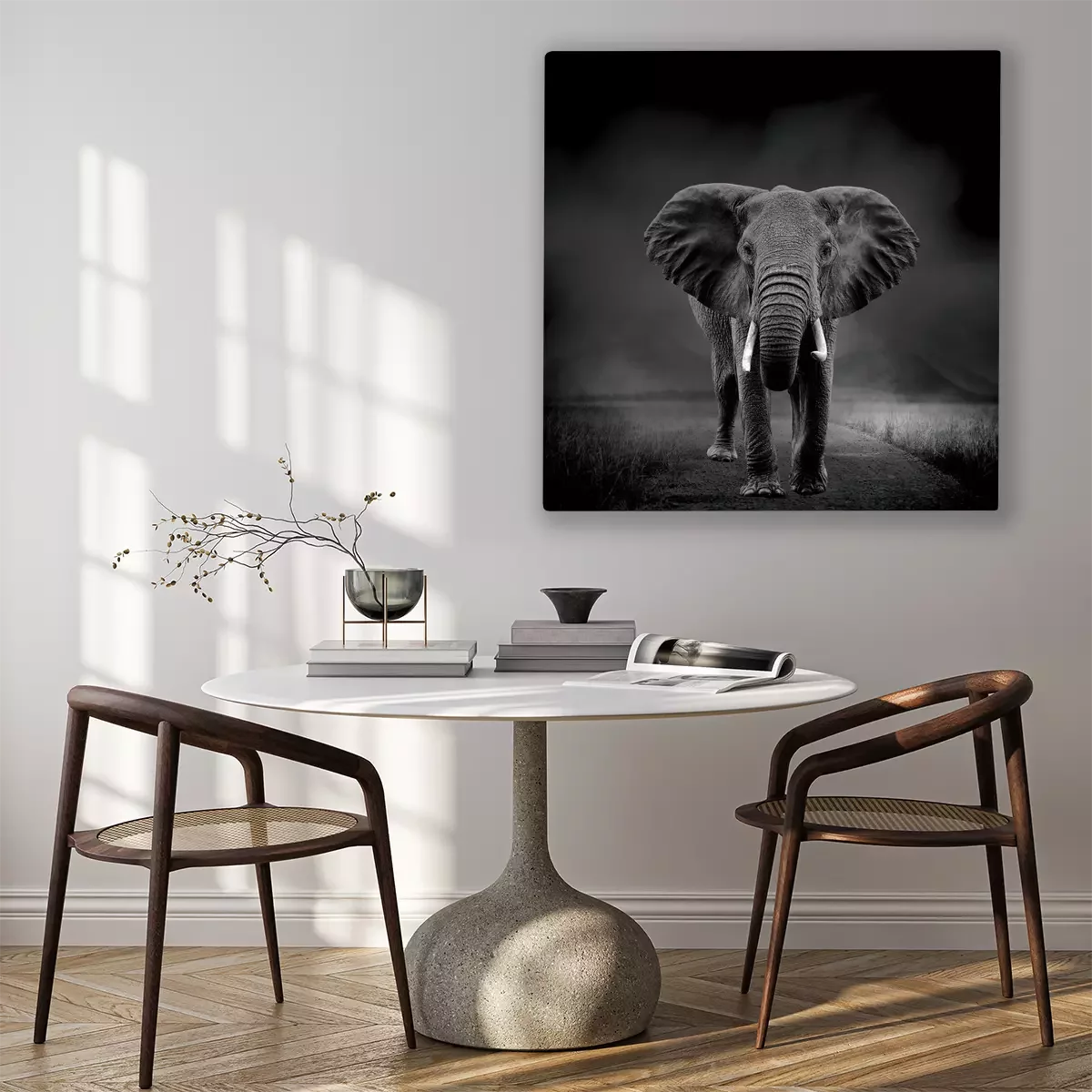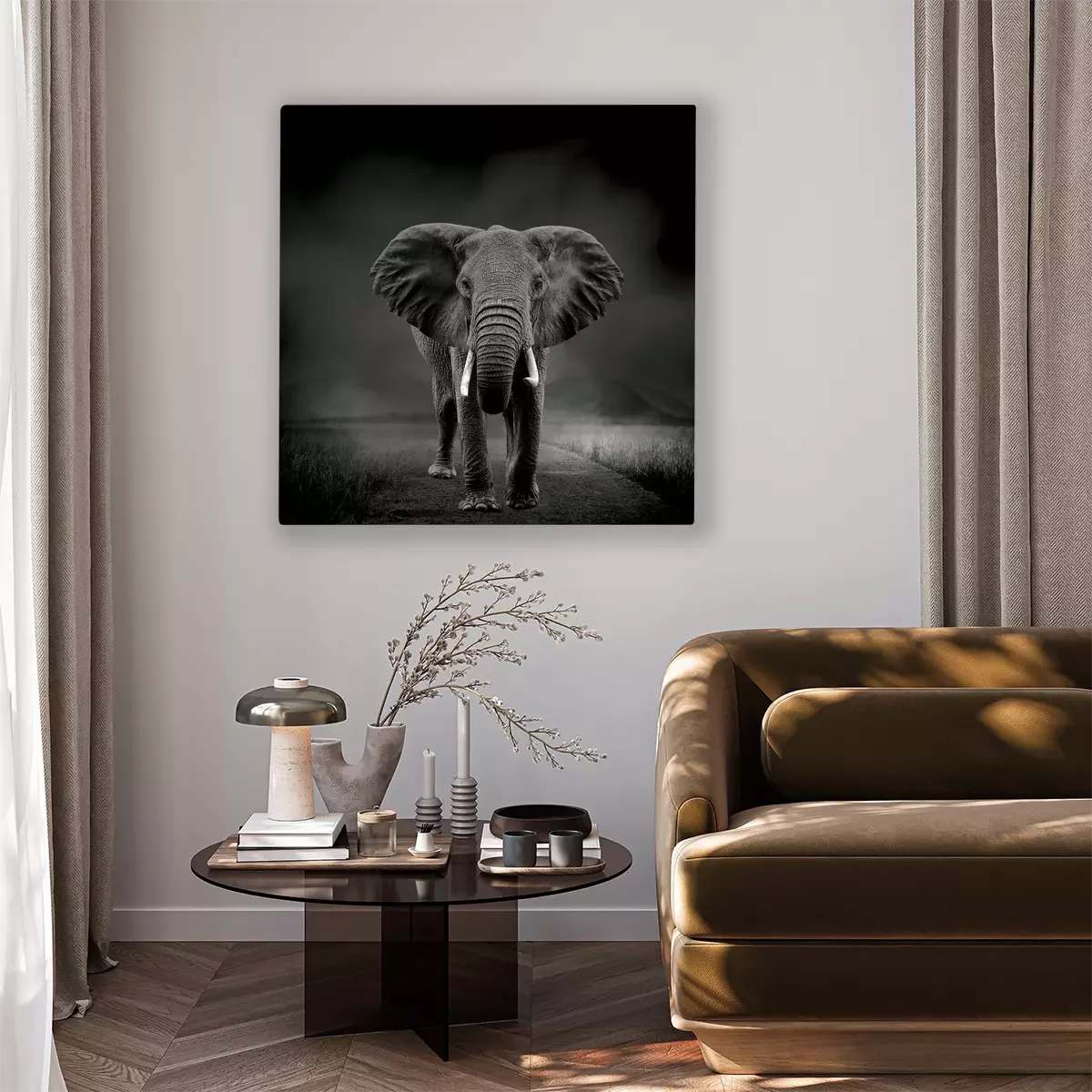 Portrait en noir et blanc d'un éléphant en mouvement