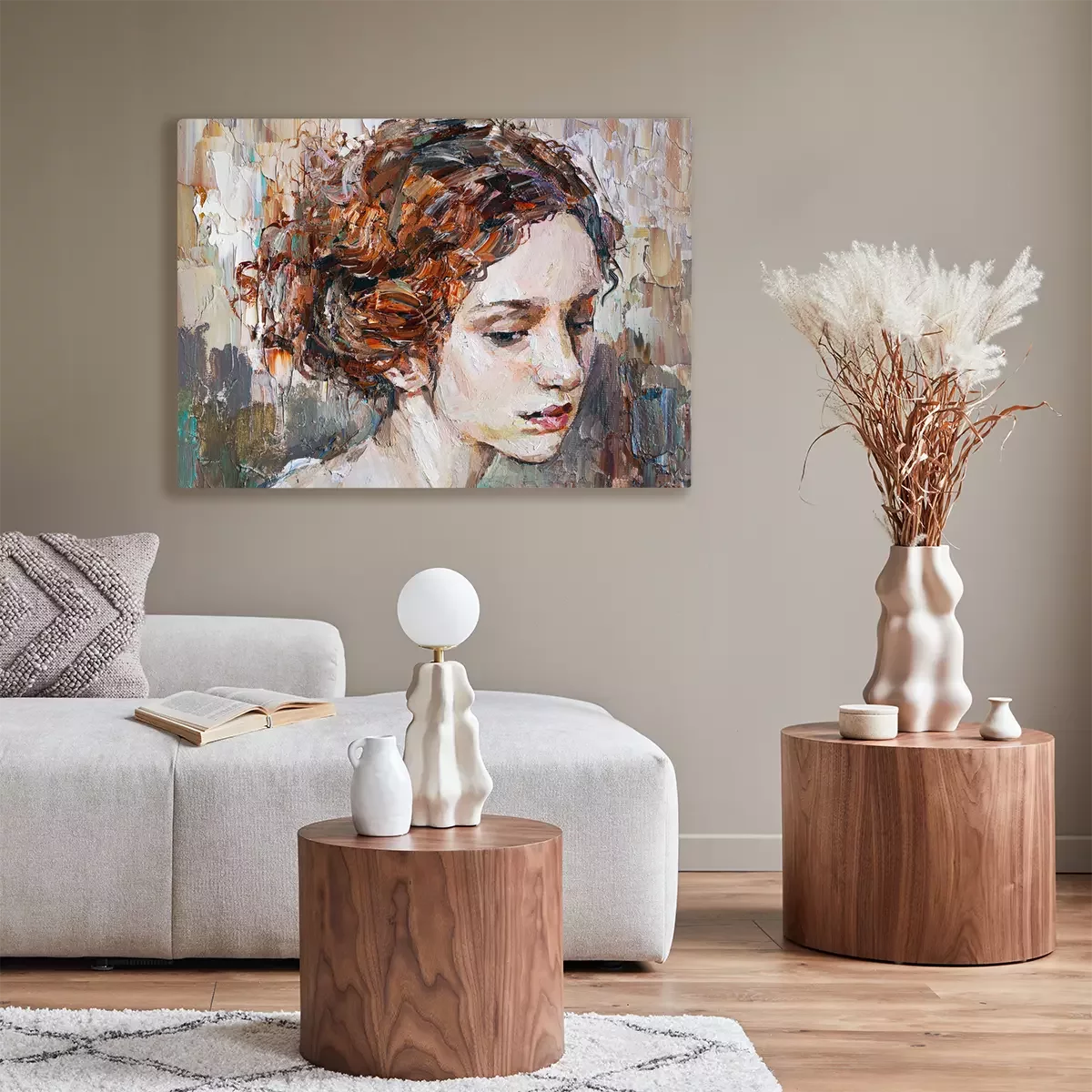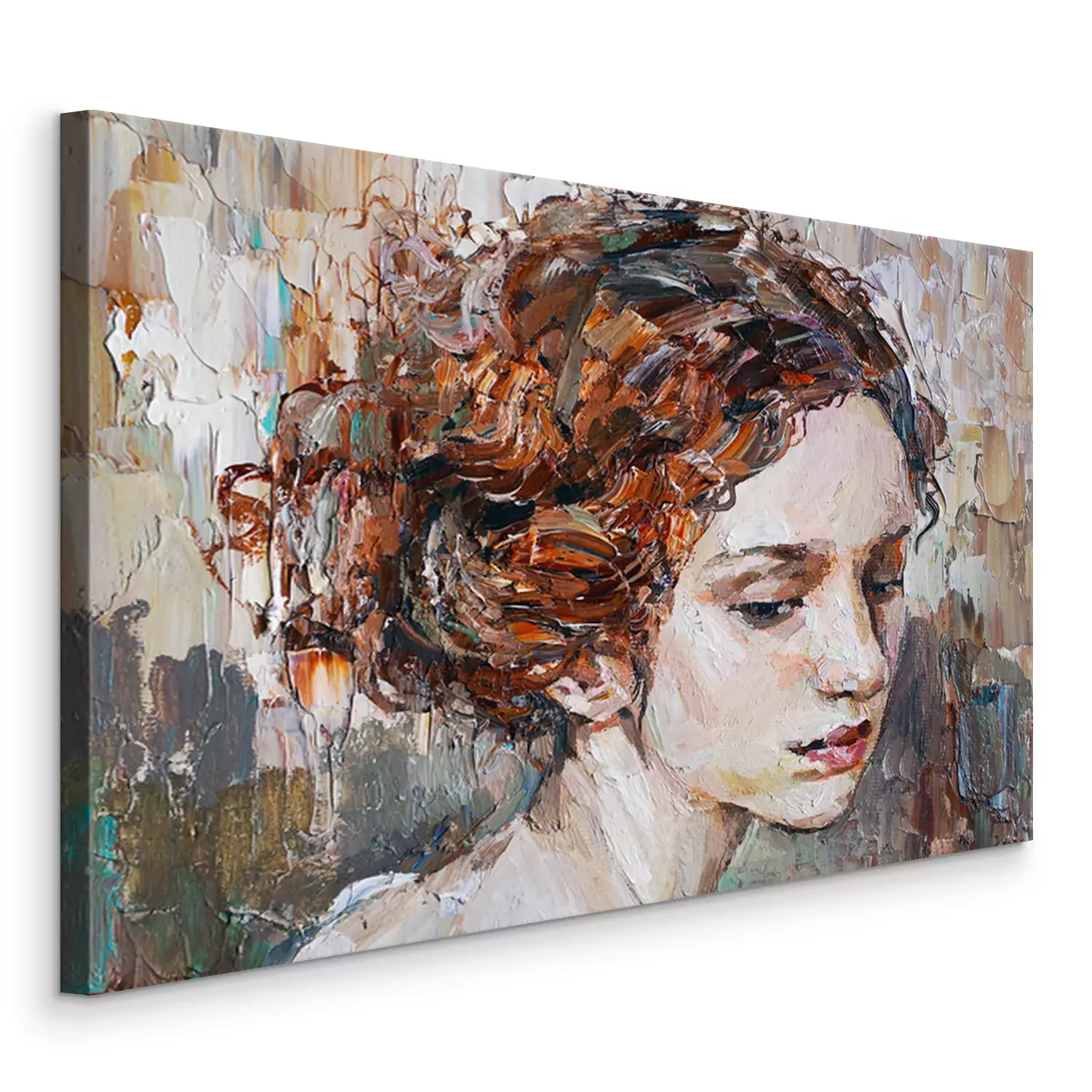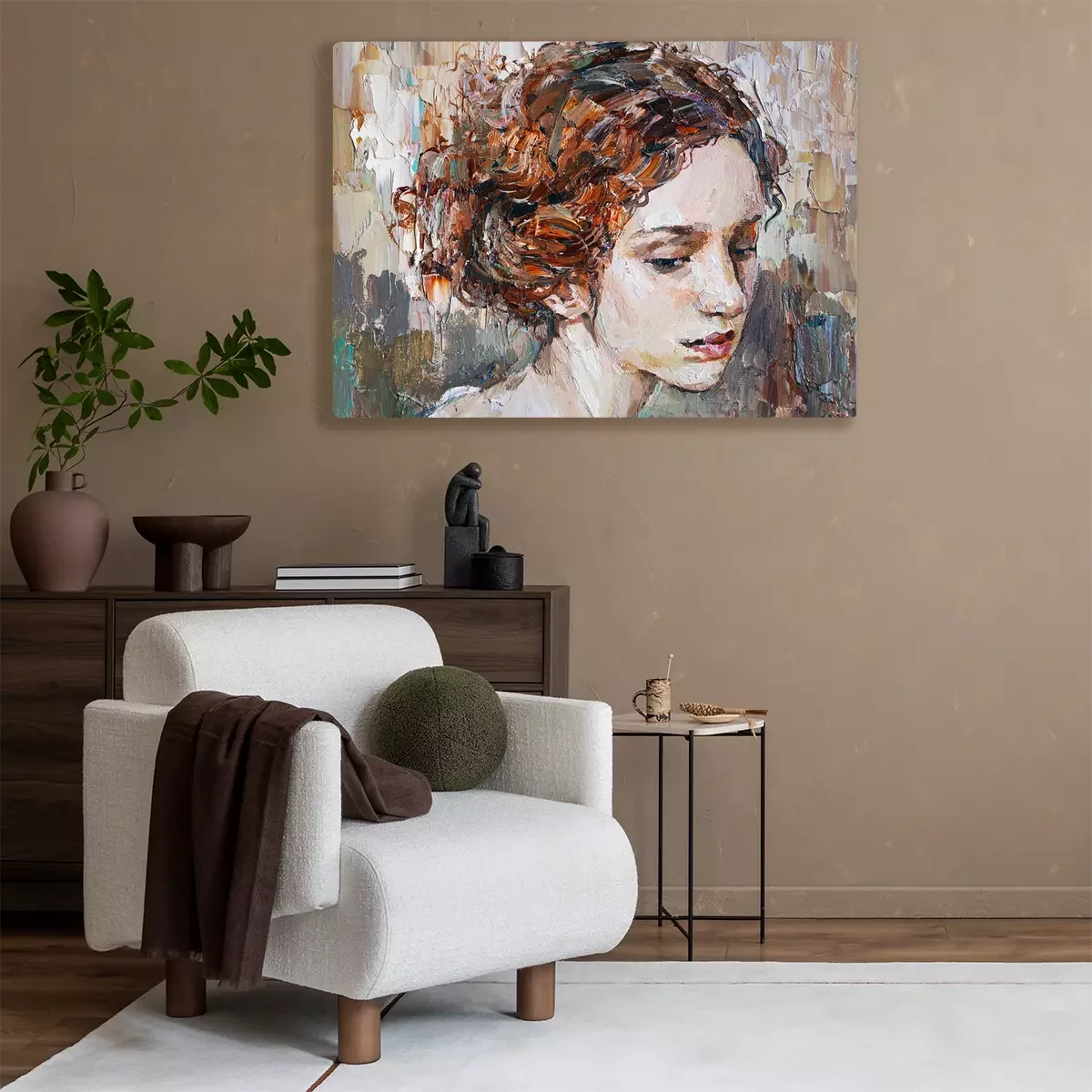 Tableau : Portrait of a young, dreamy girl with curly brown hair. Oil painting on canvas.