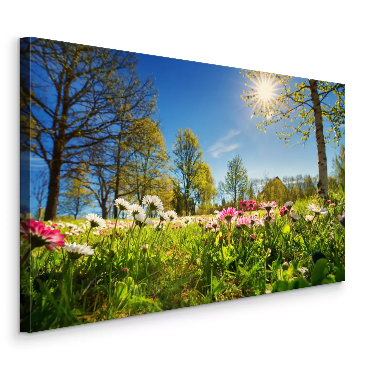 Tableau  Prairie avec beaucoup de fleurs de marguerite de printemps blanc et rose en journée ensoleillée