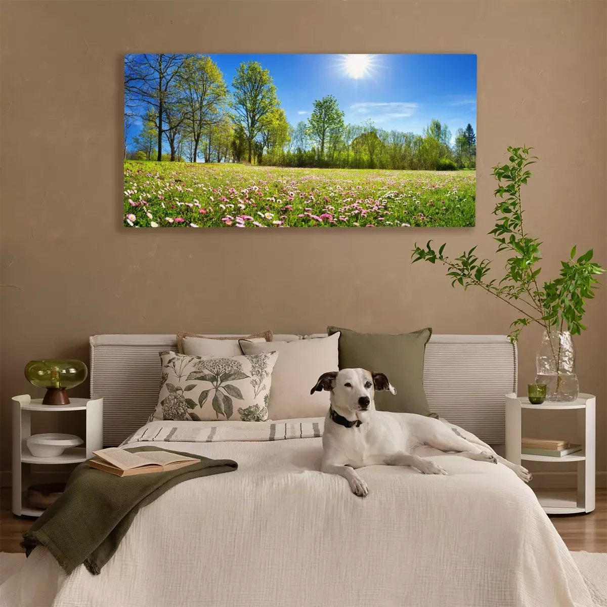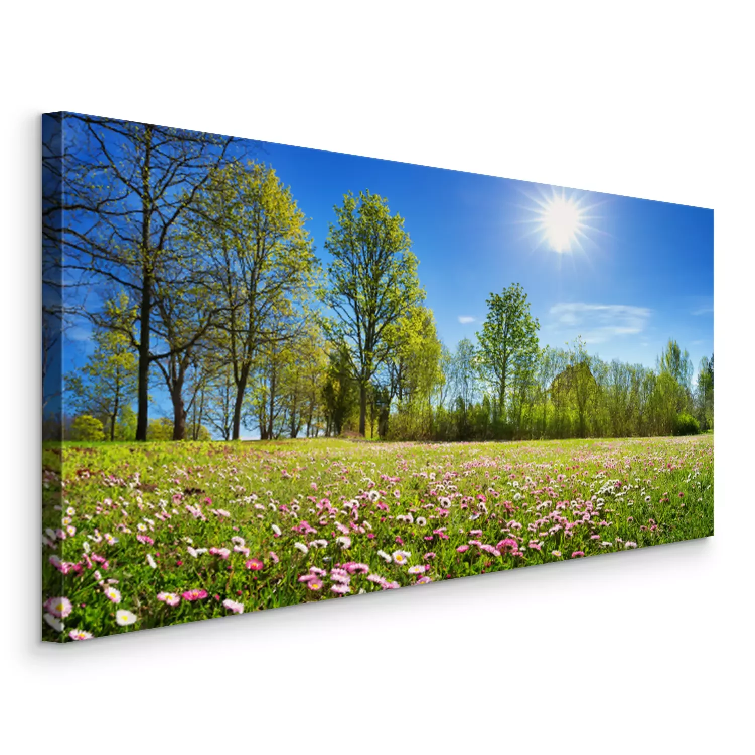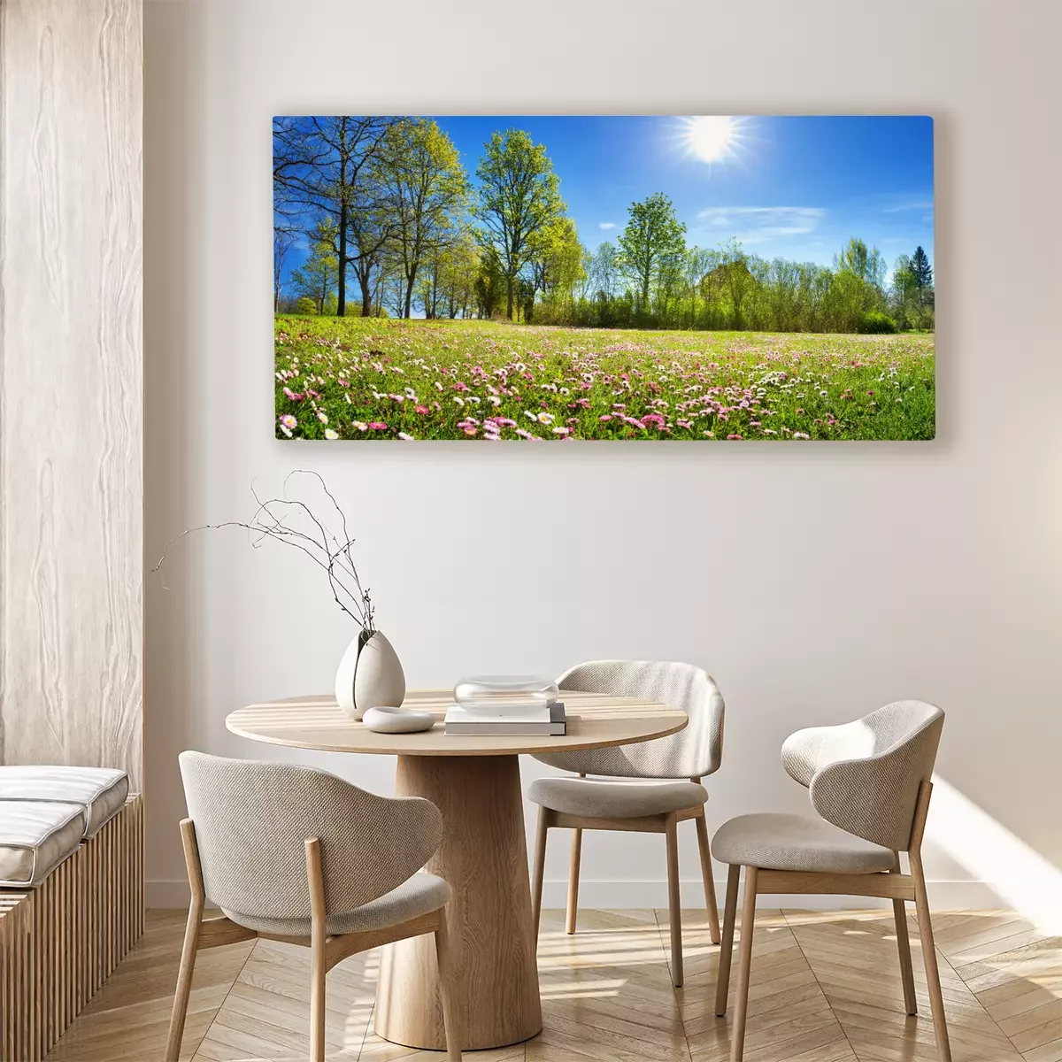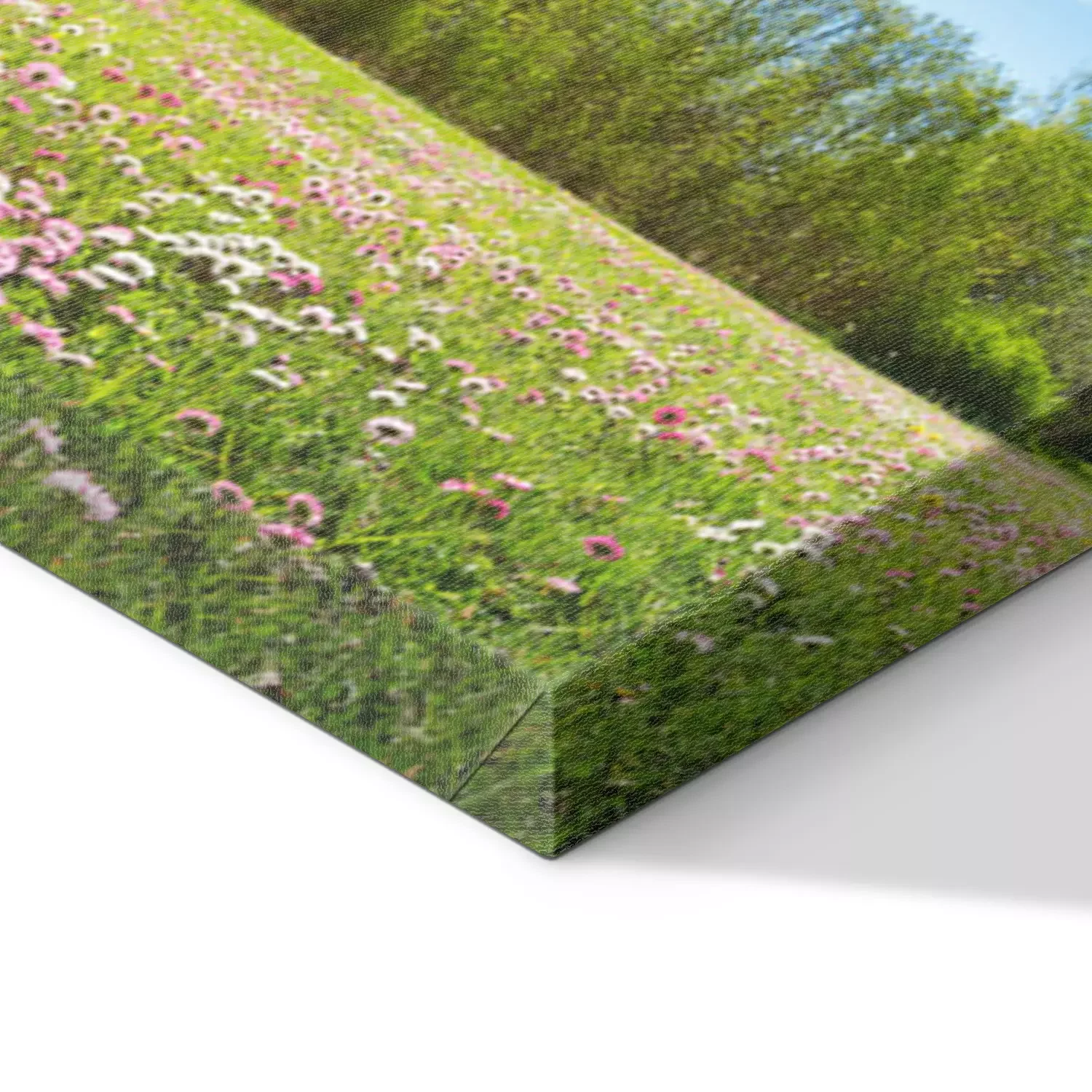 Tableau  Prairie avec beaucoup de fleurs de marguerite de printemps blanc et rose en journée ensoleillée
