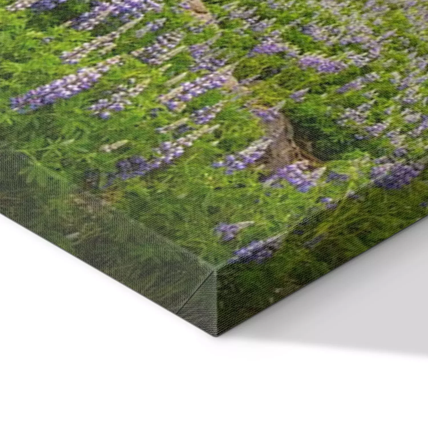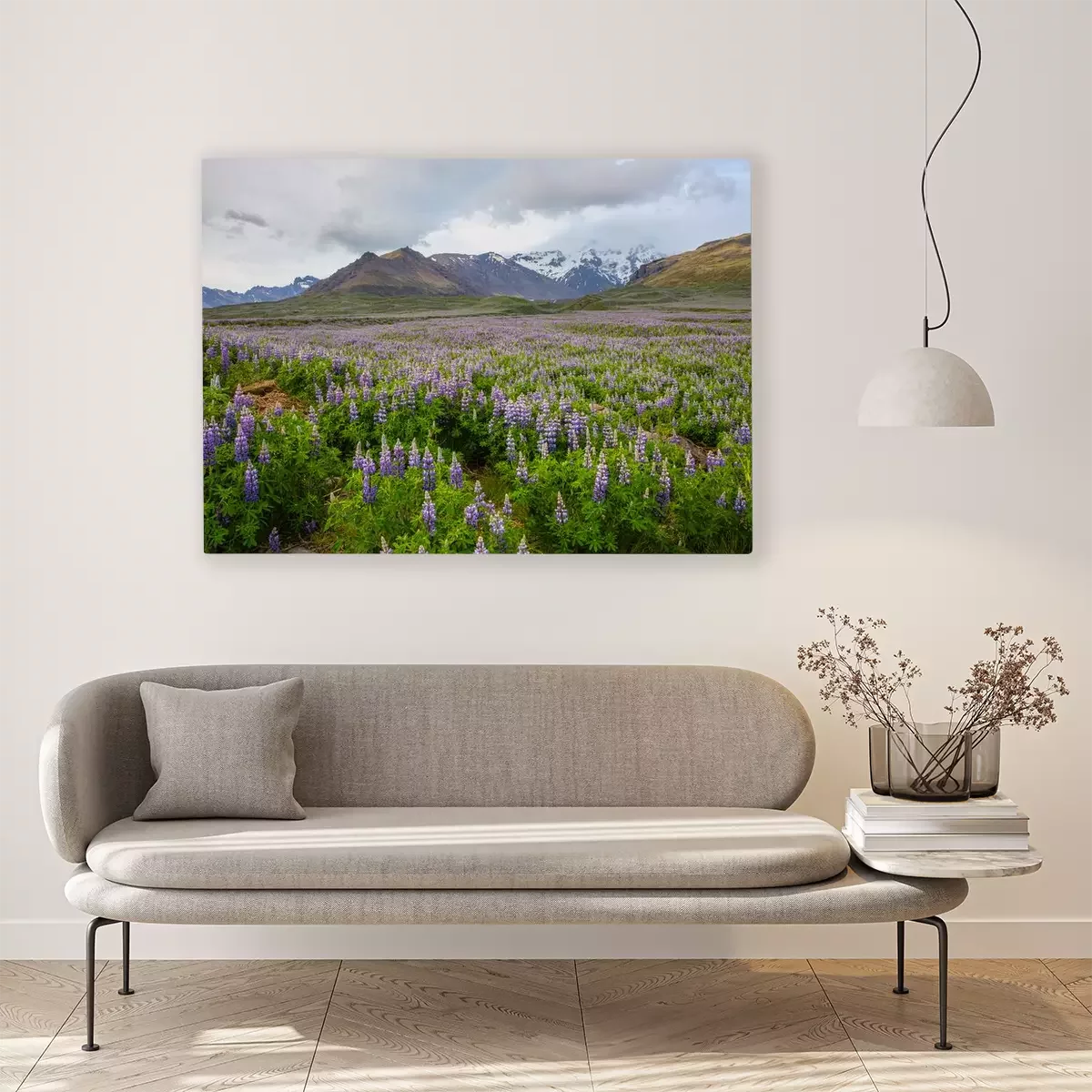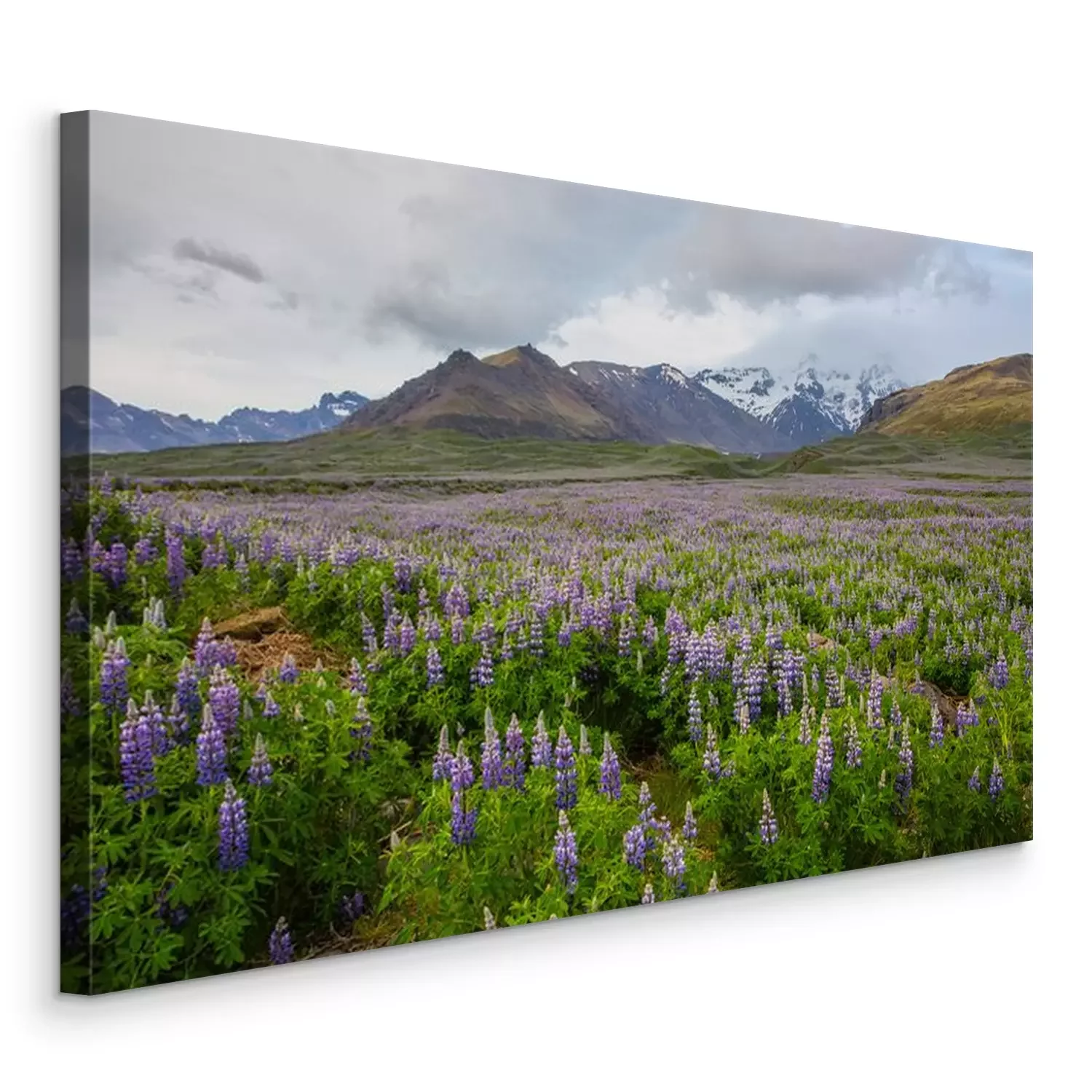 Tableau  Prairie avec des fleurs violettes et des montagnes