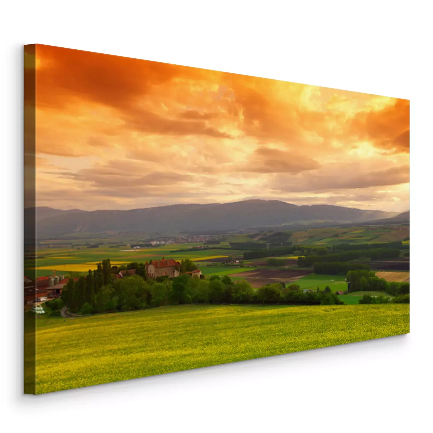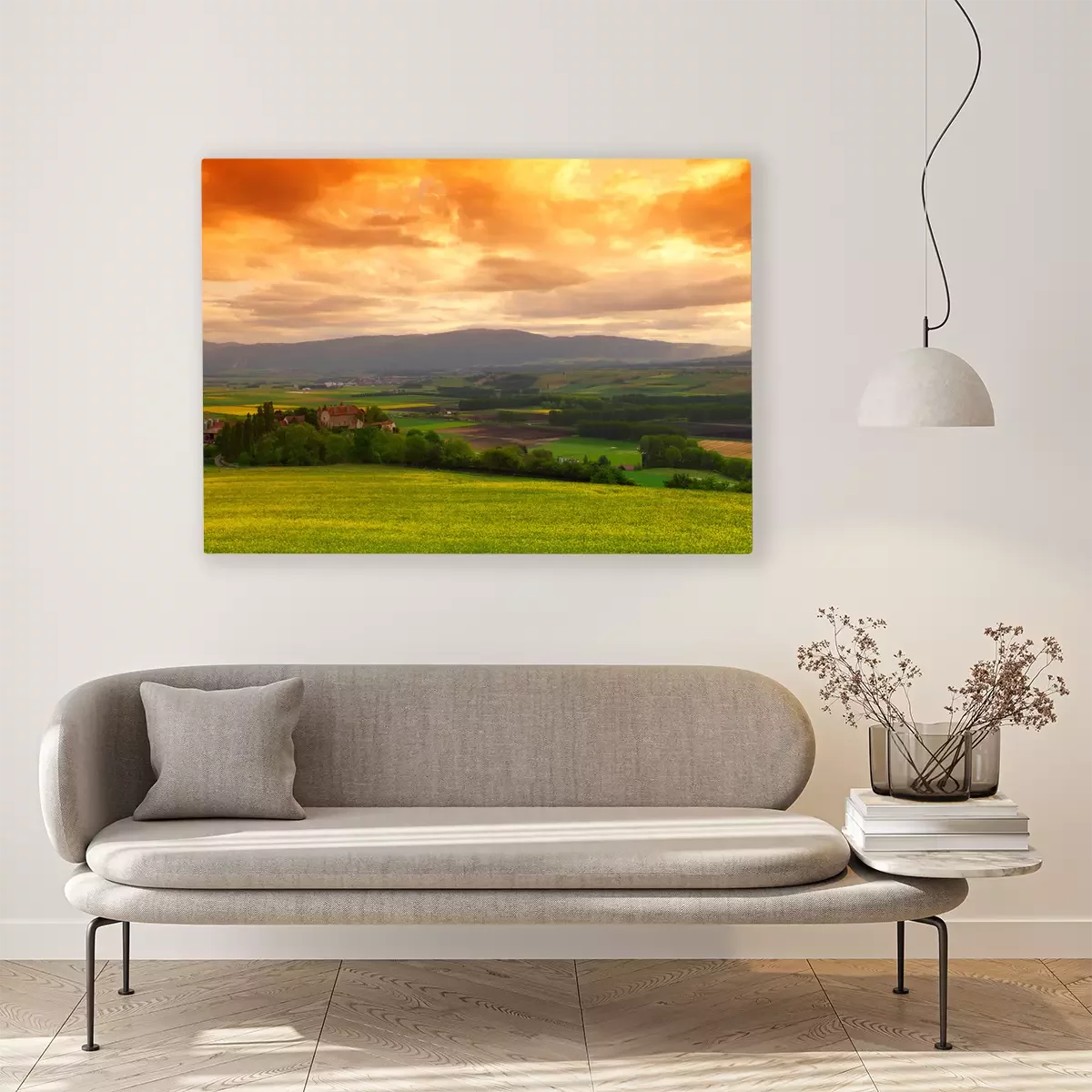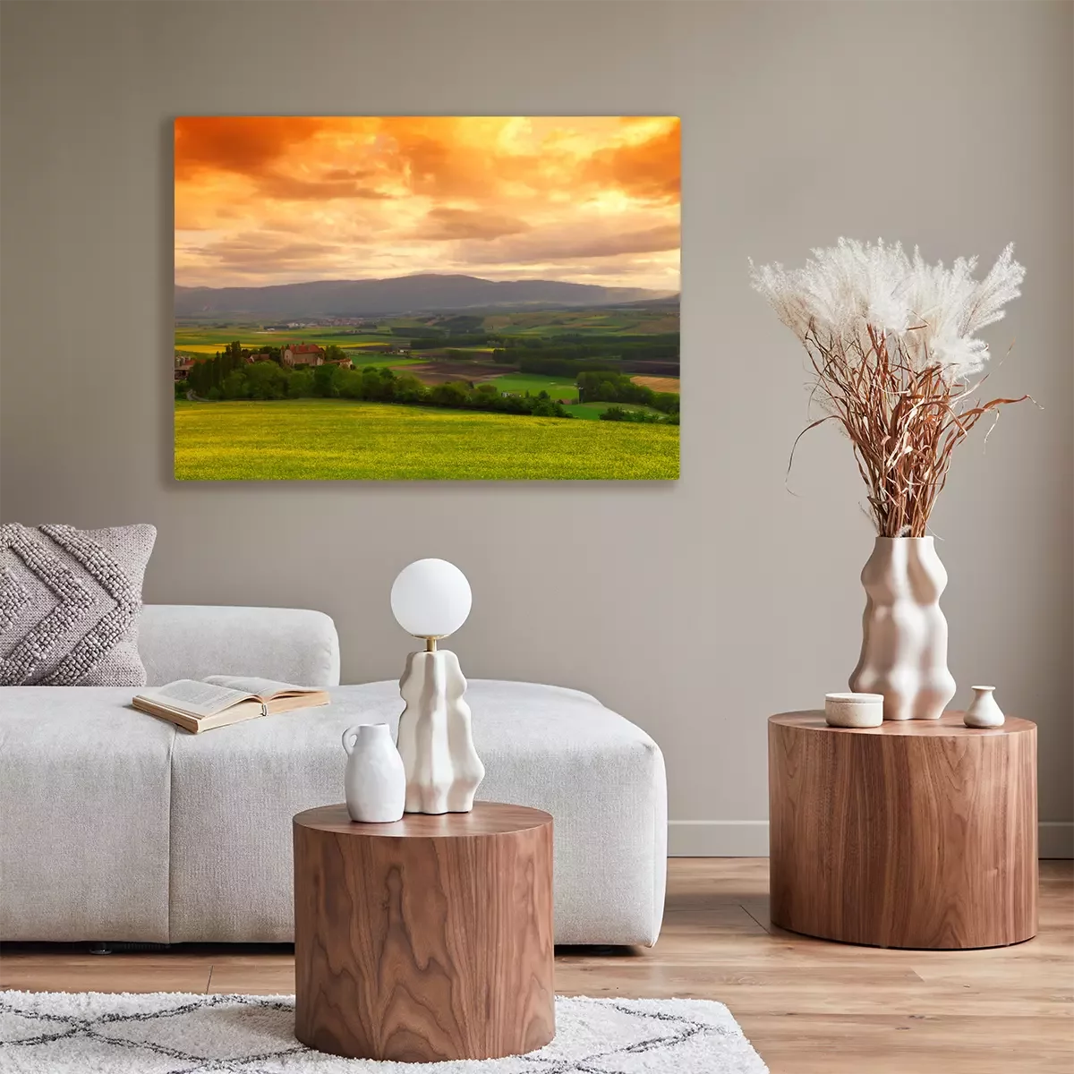 Tableau  Pré vert sous le ciel coucher de soleil avec des nuages