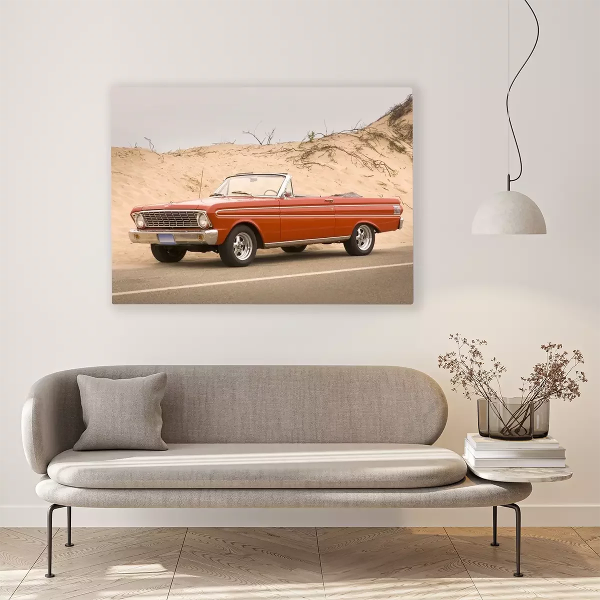 Tableau  Red convertible car on the road surrounded by hills covered in the sand