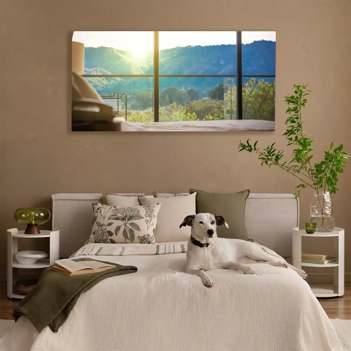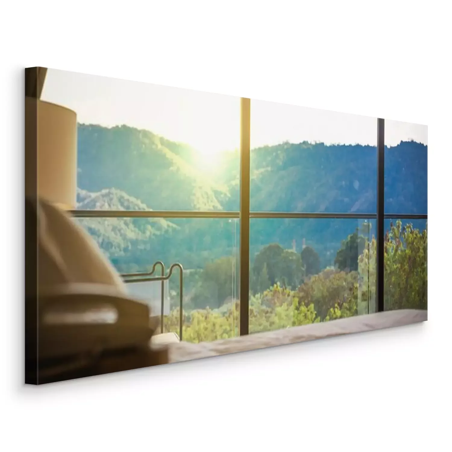 Tableau  Regardant par la grande fenêtre à de belles collines brumeuses avec le coucher du soleil coloré.