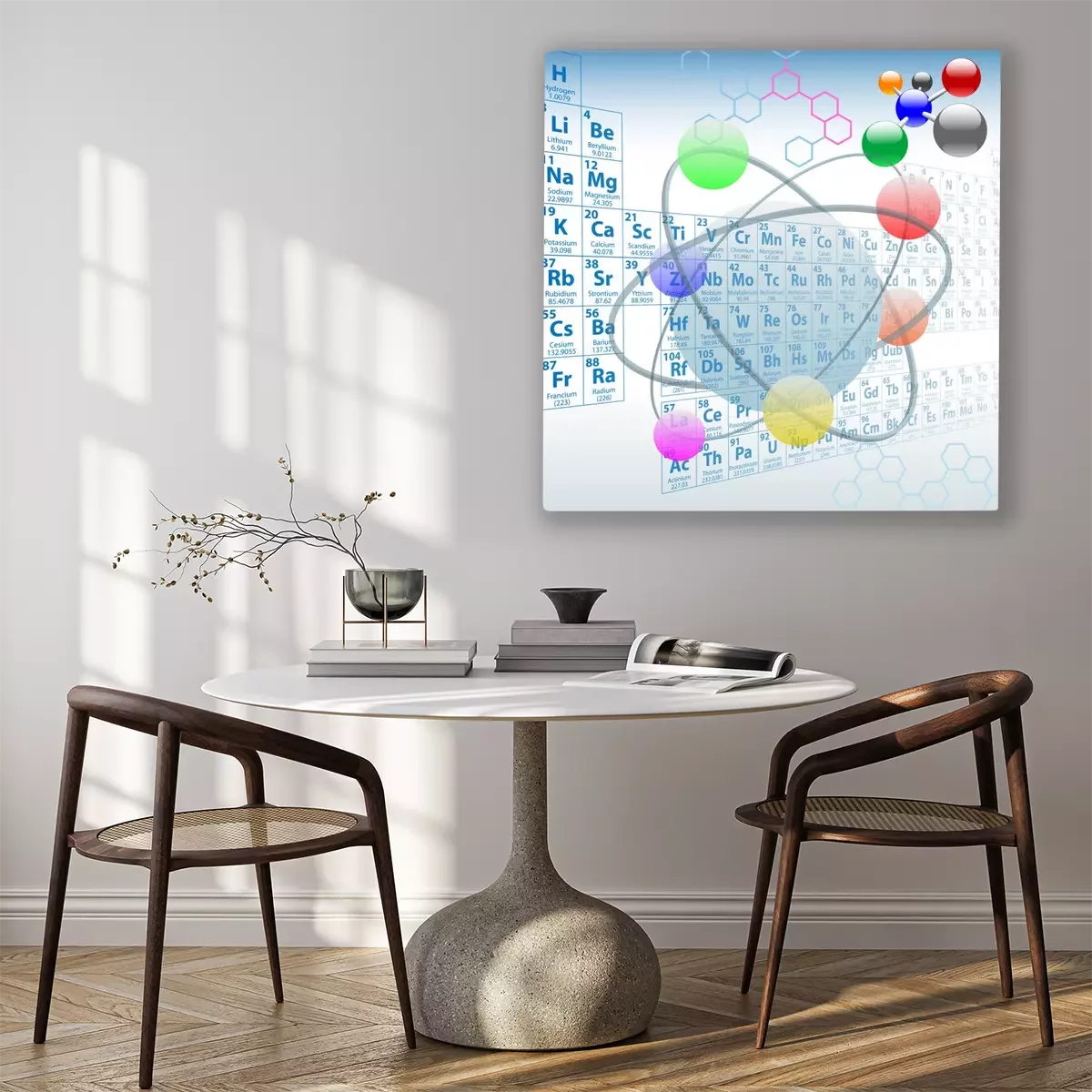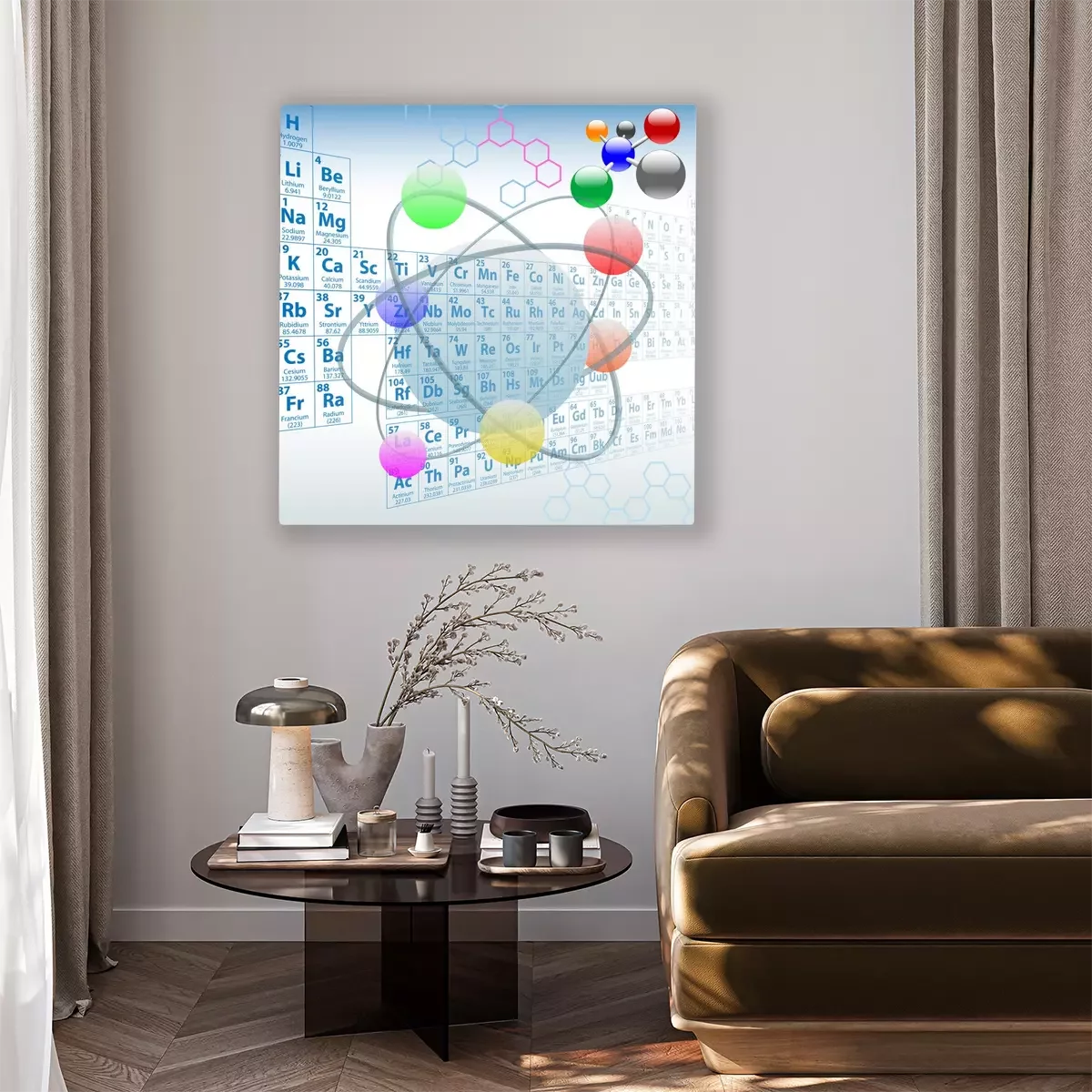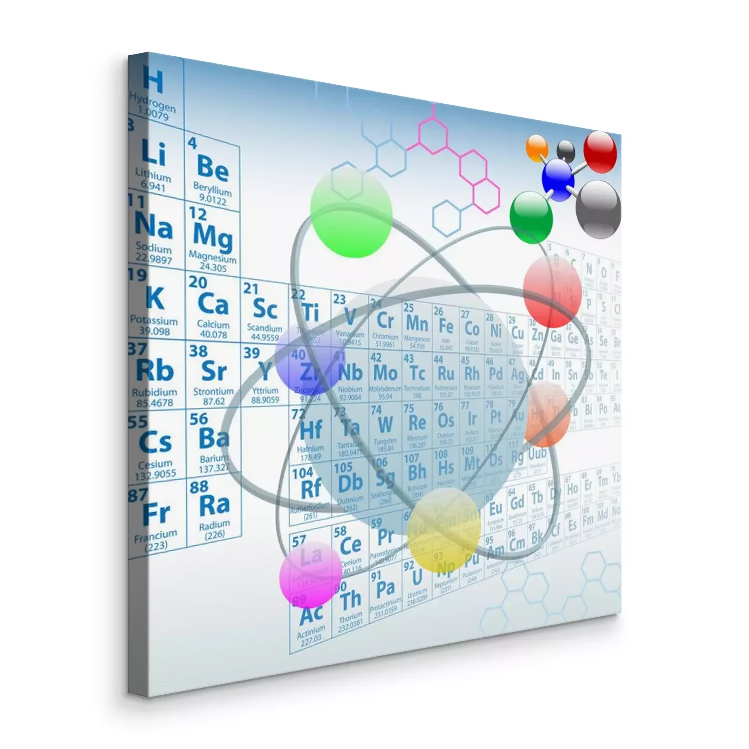 Tableau  Représentation d'un atome avec le tableau périodique en arrière-plan