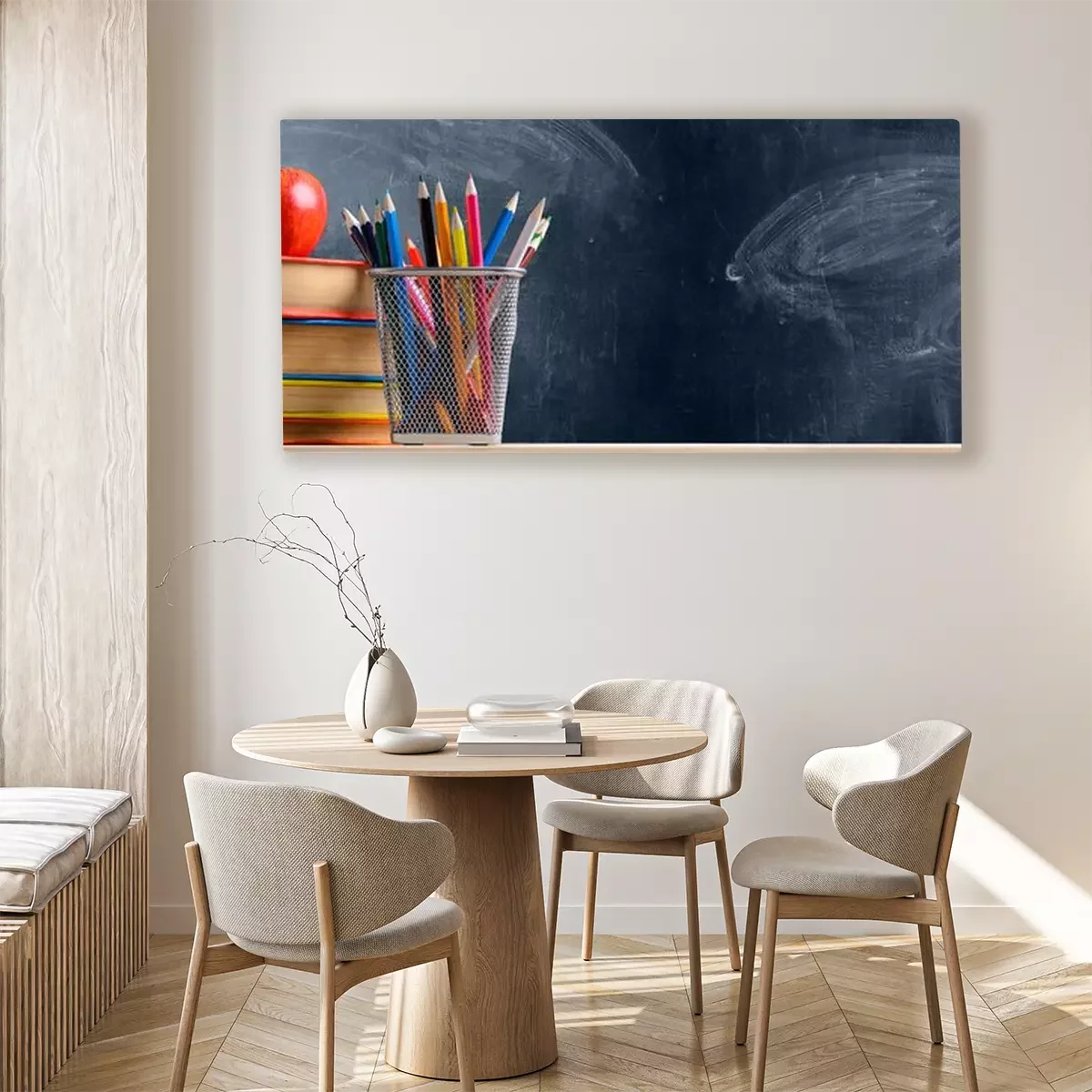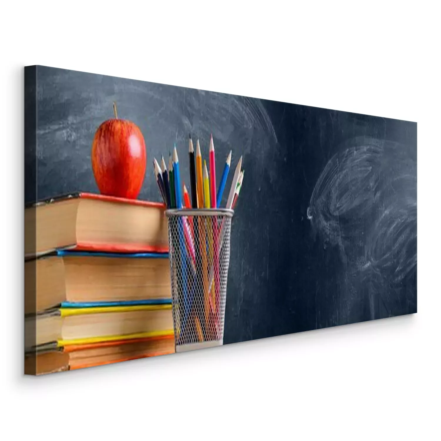 Tableau  Retour à l'école. Accessoires, livres et pommes fraîches contre les panneaux